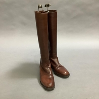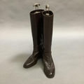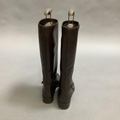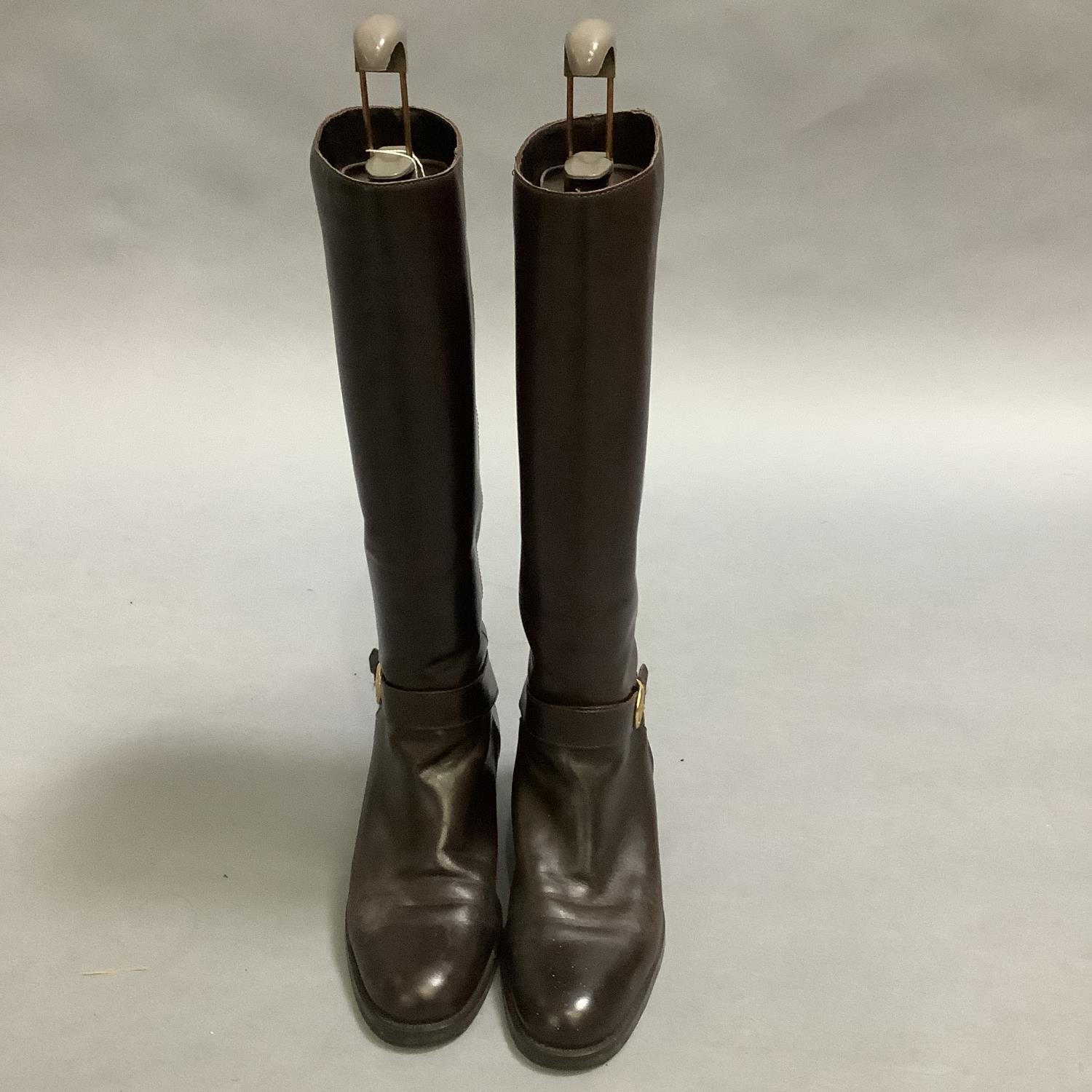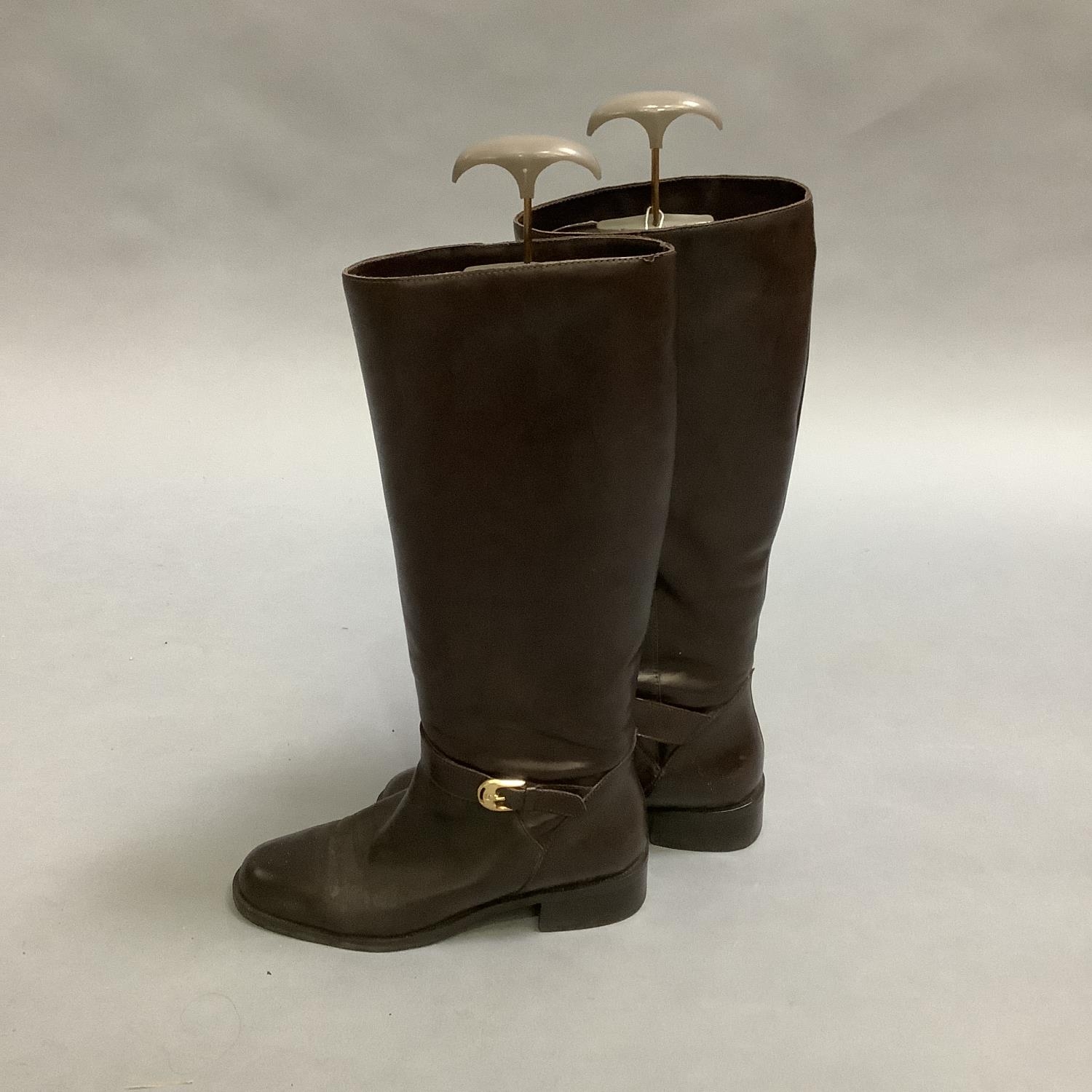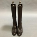 A pair of Etienne Aigner brown leather boots with buckle detail at the ankle