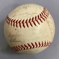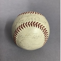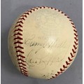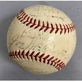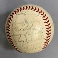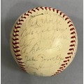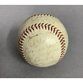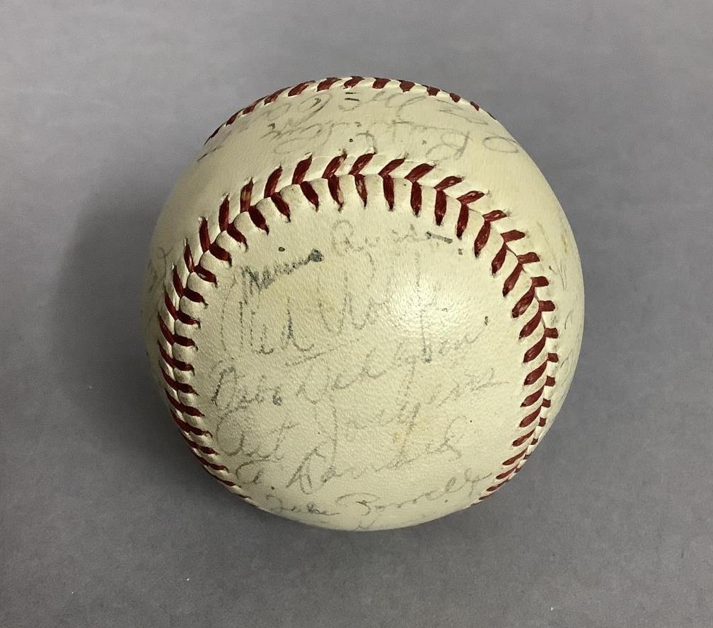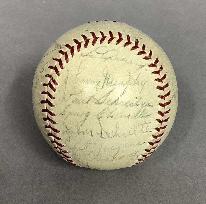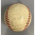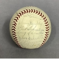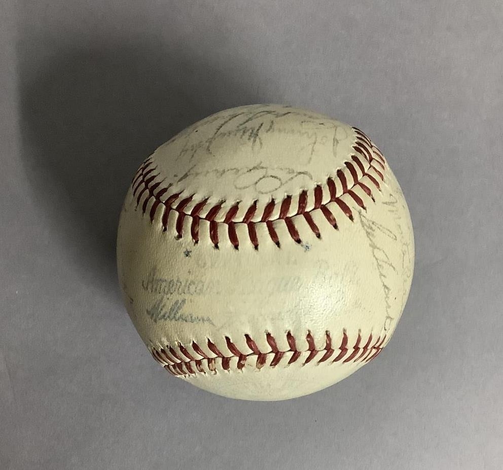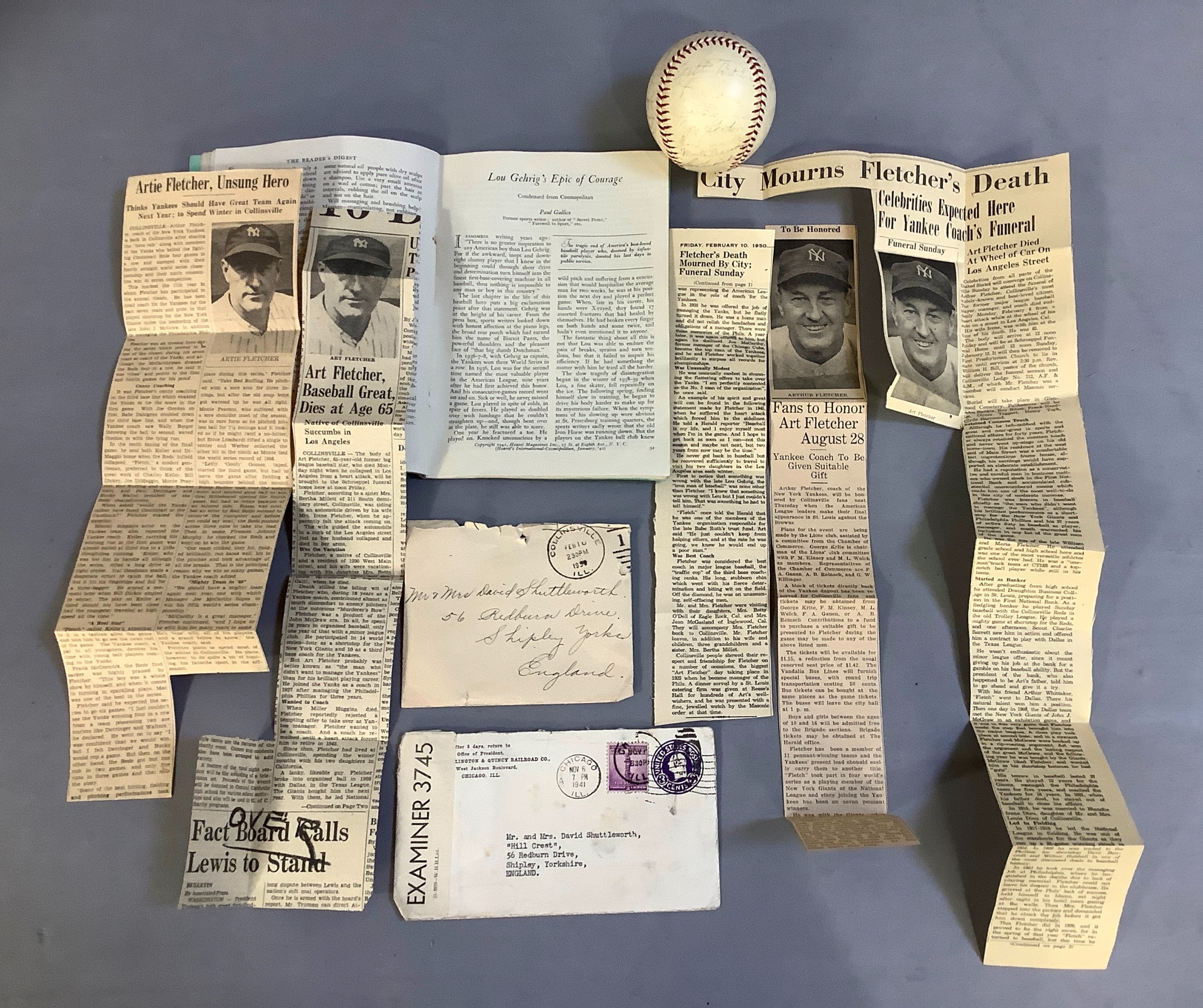 IMPORTANT SPORTING INTEREST: A 1939 New York Yankees team-signed baseball, including Lou Gehrig, Joe DiMaggio, Arthur Fletcher, with Joe McCarthy signed to the sweet spot, and an unusual double-signature by Art Jorgens, stamped *Official* American League Ball, William Harridge..., Reach logo, 24 signatures in all, together with The Readers Digest dated March 1942 with the article 'Lou Gehrig's Epic of Courage', by Paul Gallico, and two newspaper cuttings on Arthur Fletcher