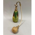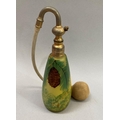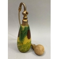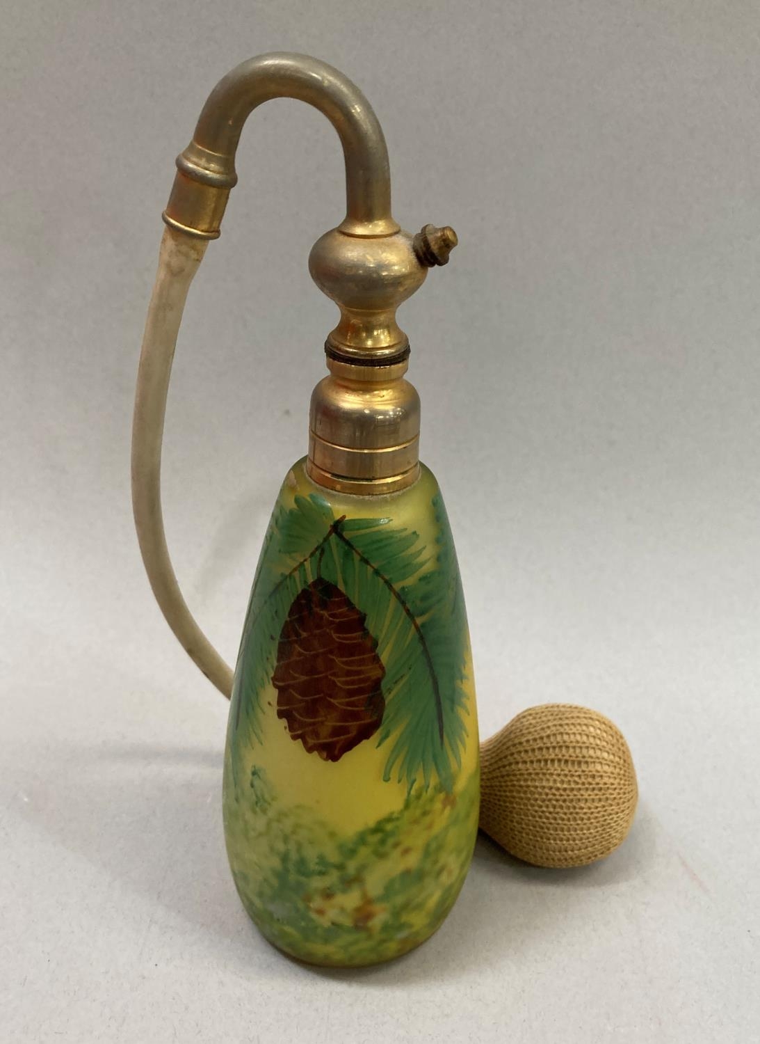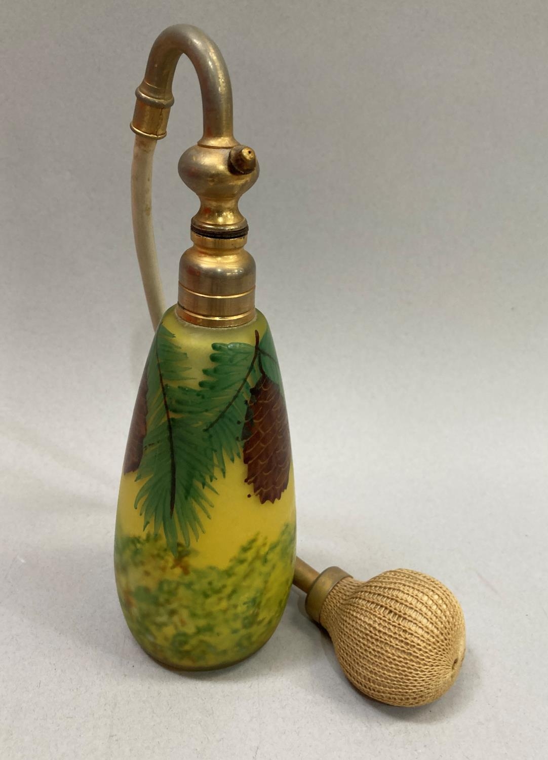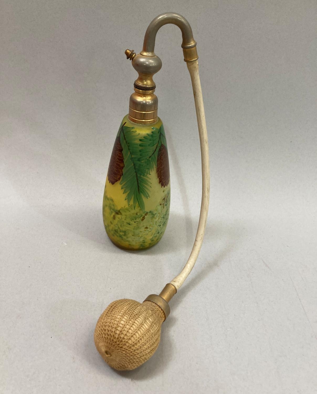 A French yellow-green mottled and opaque cased scent bottle painted with pinecones and signed JAM with gilt metal mount and atomiser, 19cm high overall