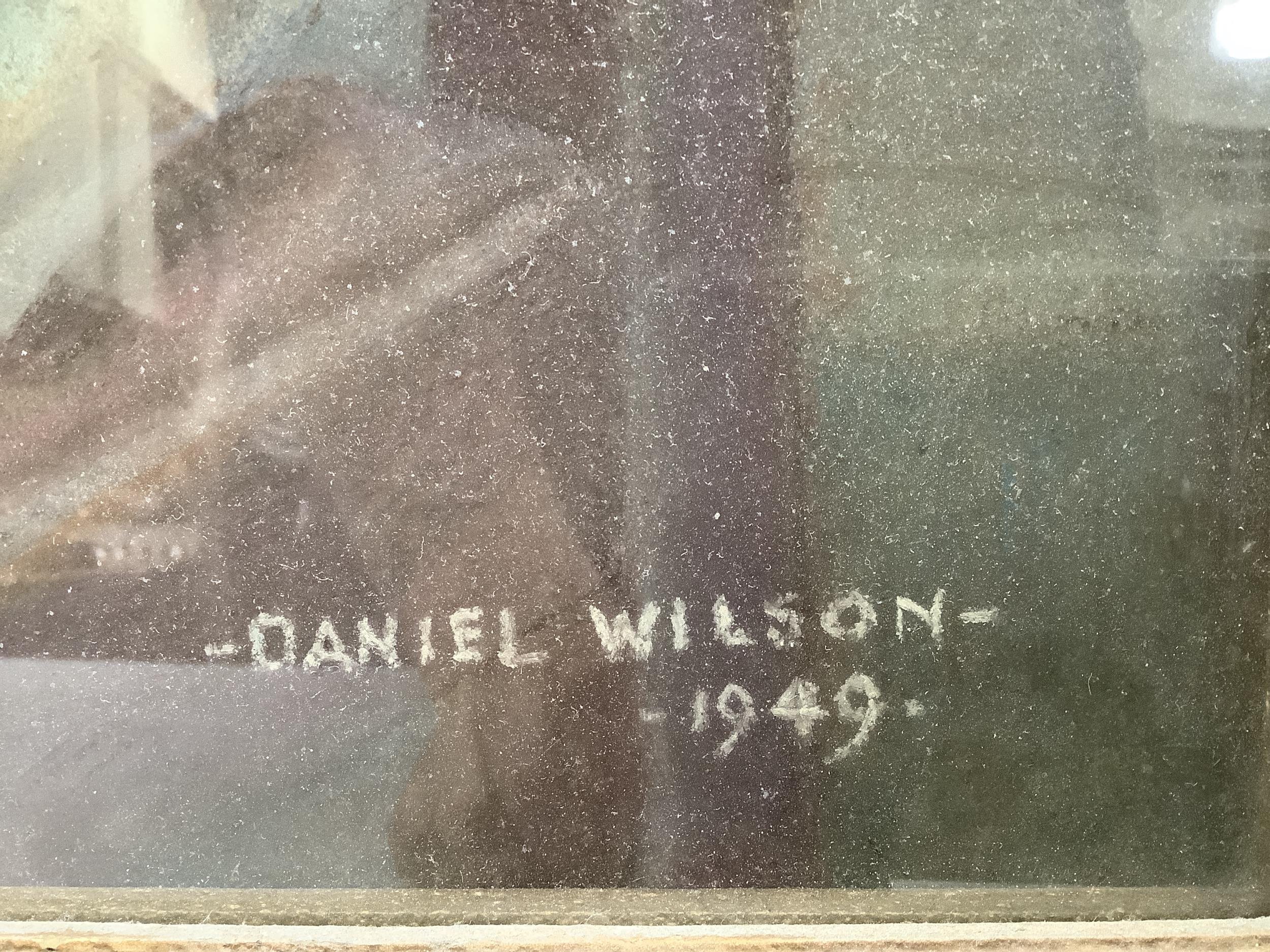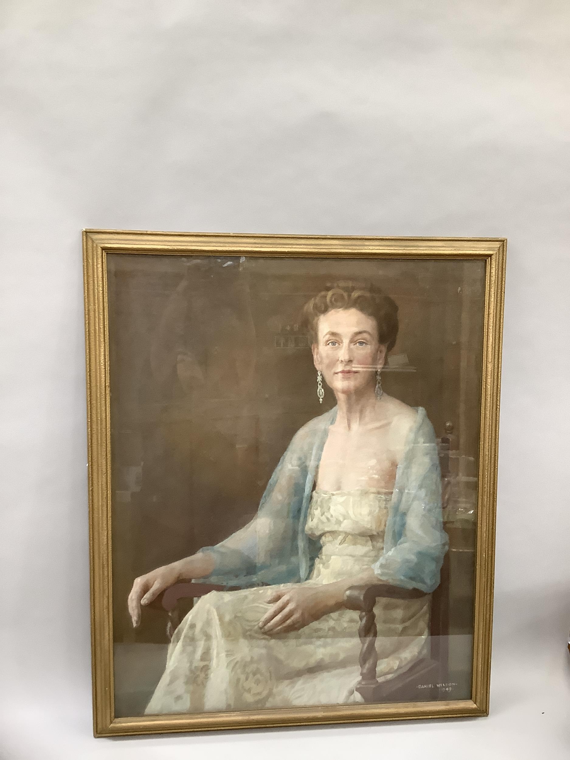 Daniel Wilson, three-quarter portrait of a lady in evening gown and diamond pendent earrings sitting in a chair, pastel, signed and dated 1949 to lower right, 96cm x 77cm