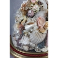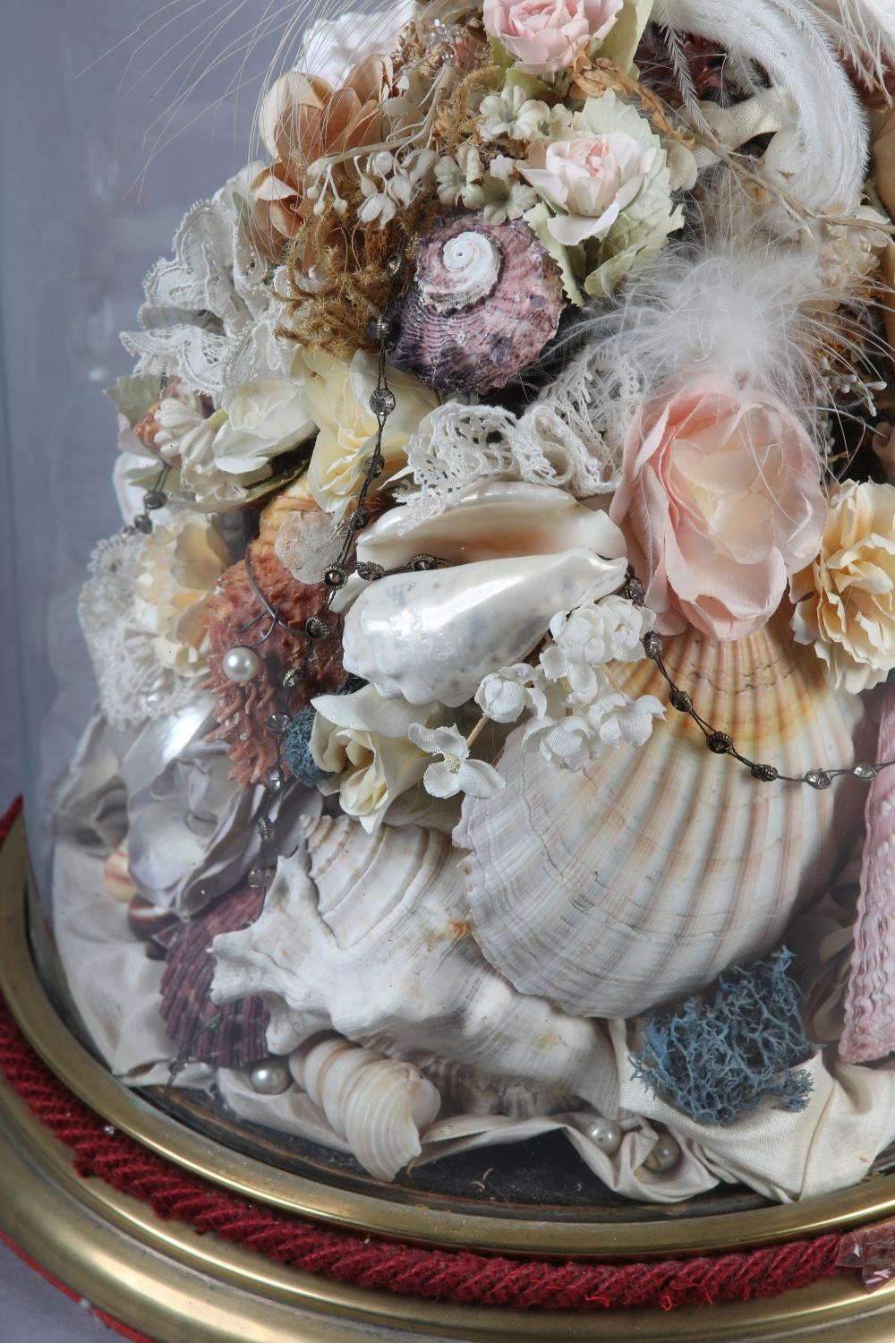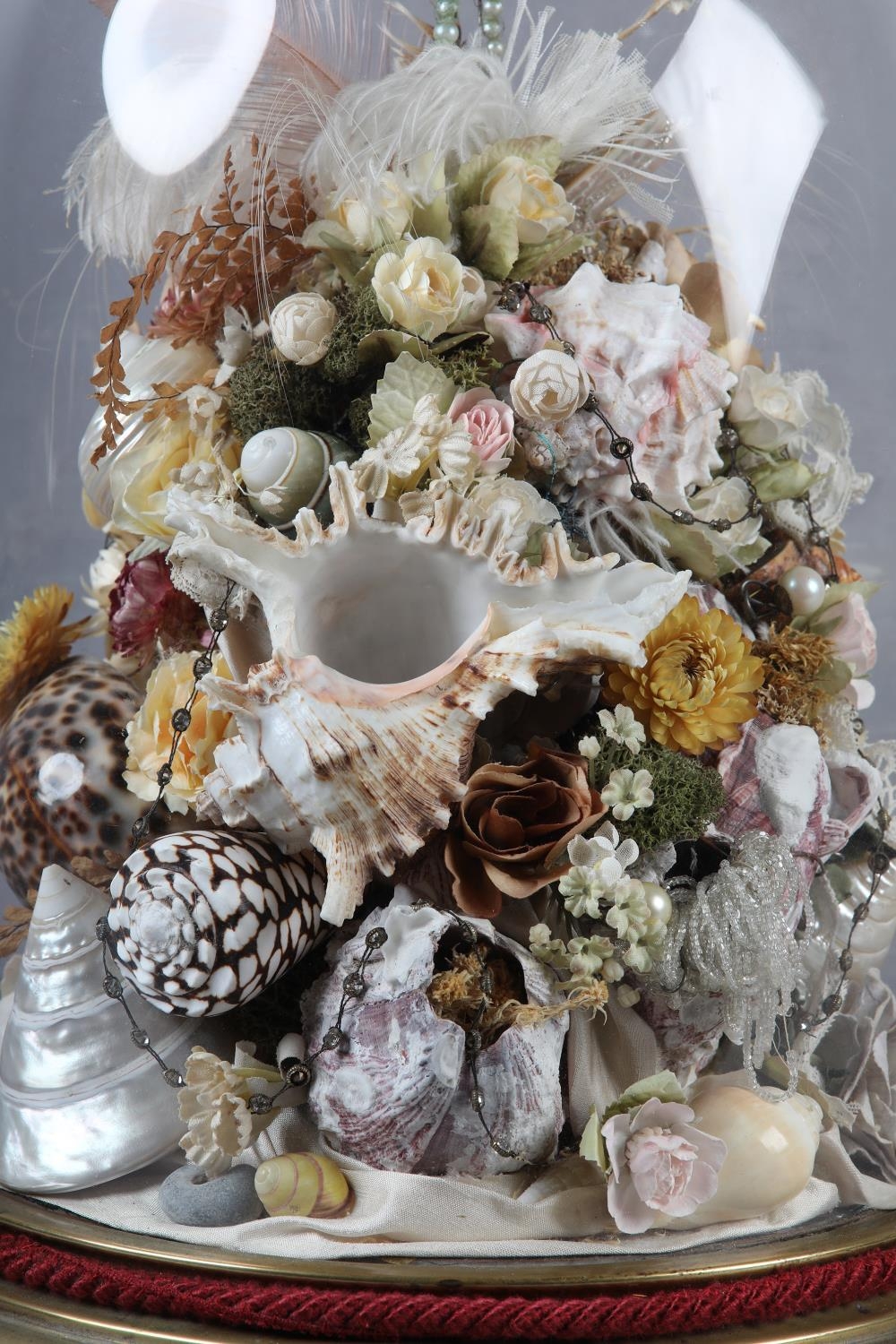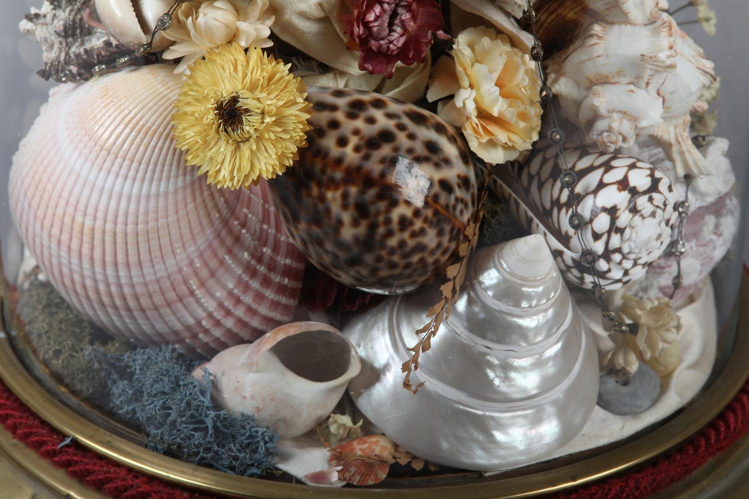 A VICTORIAN DISPLAY OF SHELL, FEATHERS AND DRIED FLOWERS, under a glass dome with circular brass plinth base, 39.5cm high x 31cm diameter