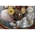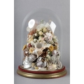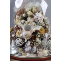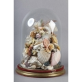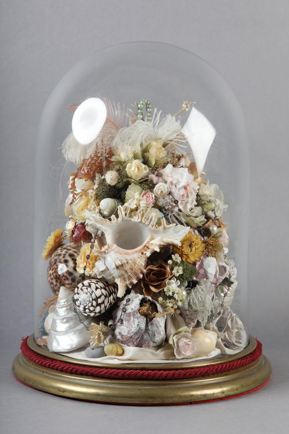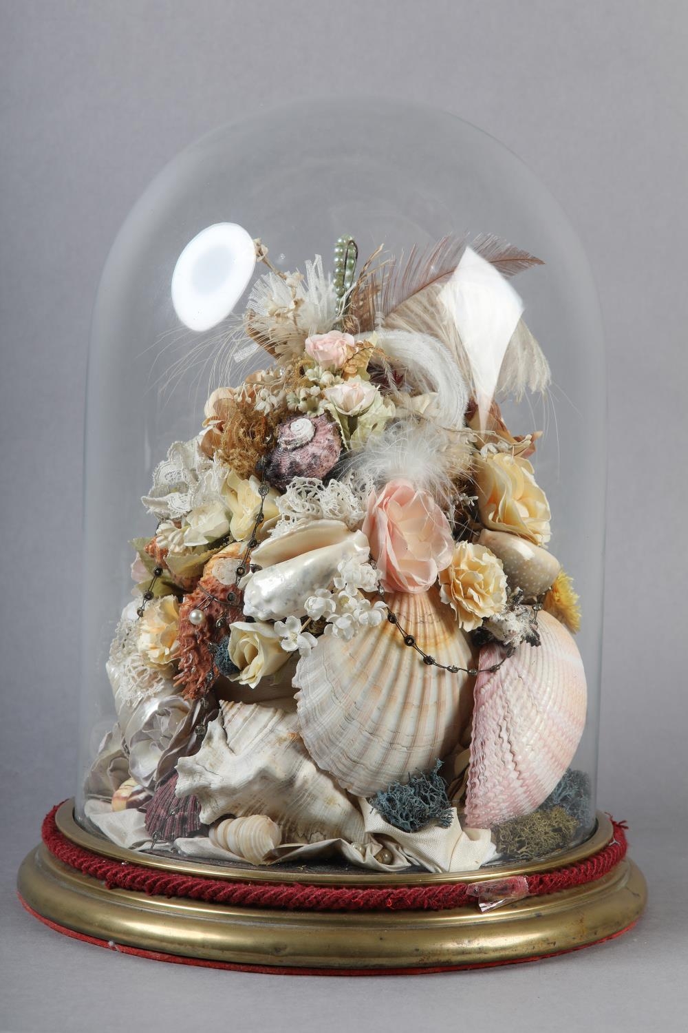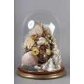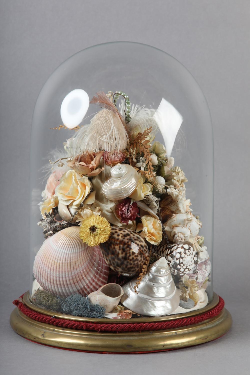 A VICTORIAN DISPLAY OF SHELL, FEATHERS AND DRIED FLOWERS, under a glass dome with circular brass plinth base, 39.5cm high x 31cm diameter