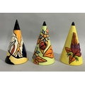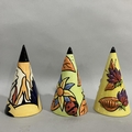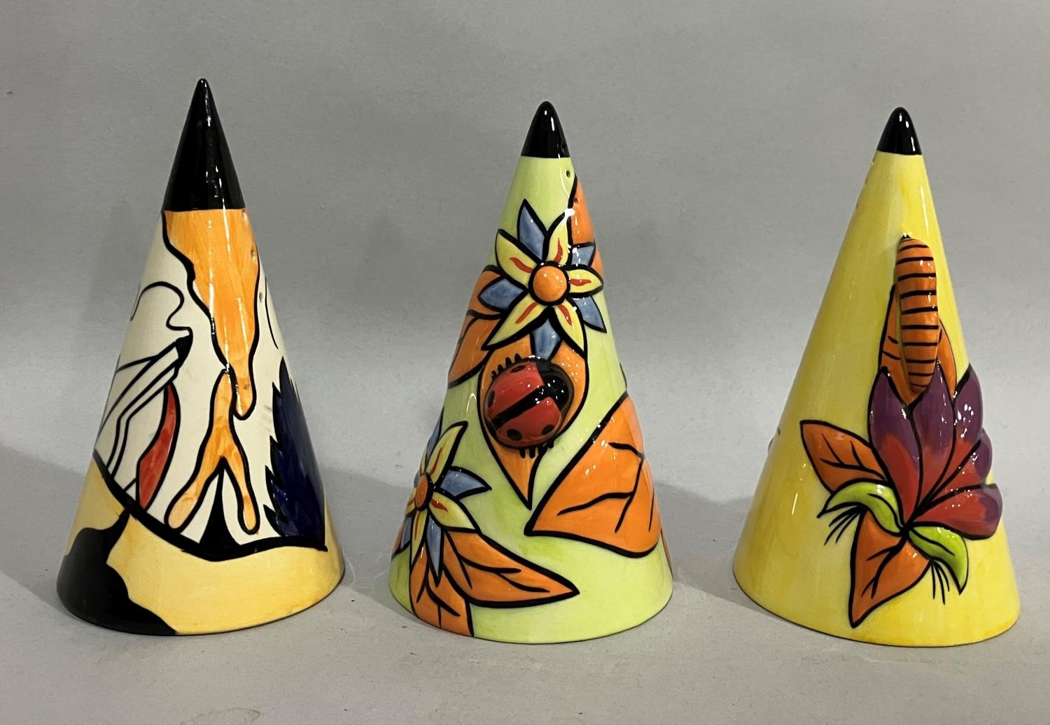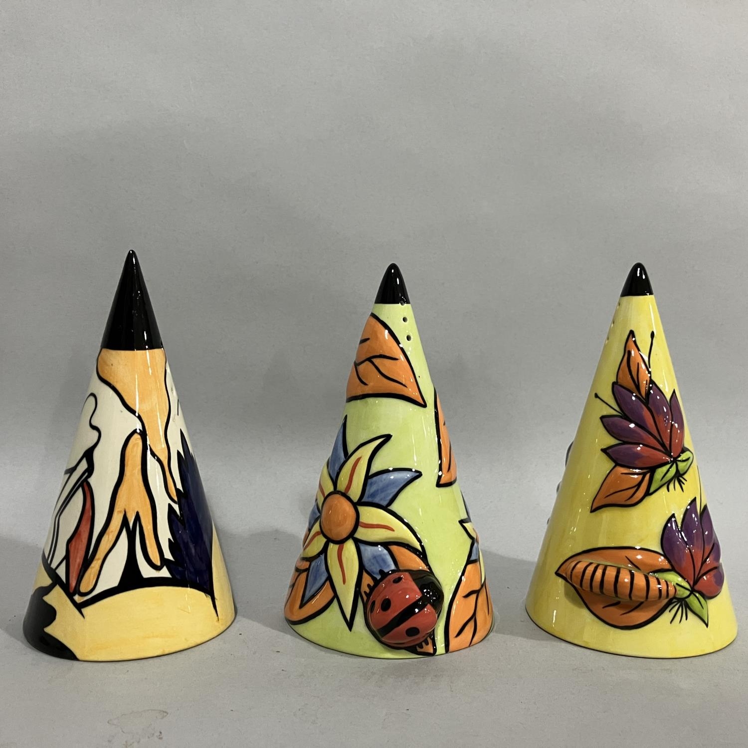 Three Lorna Bailey conical sugar sifters in the style of Clarice Clif