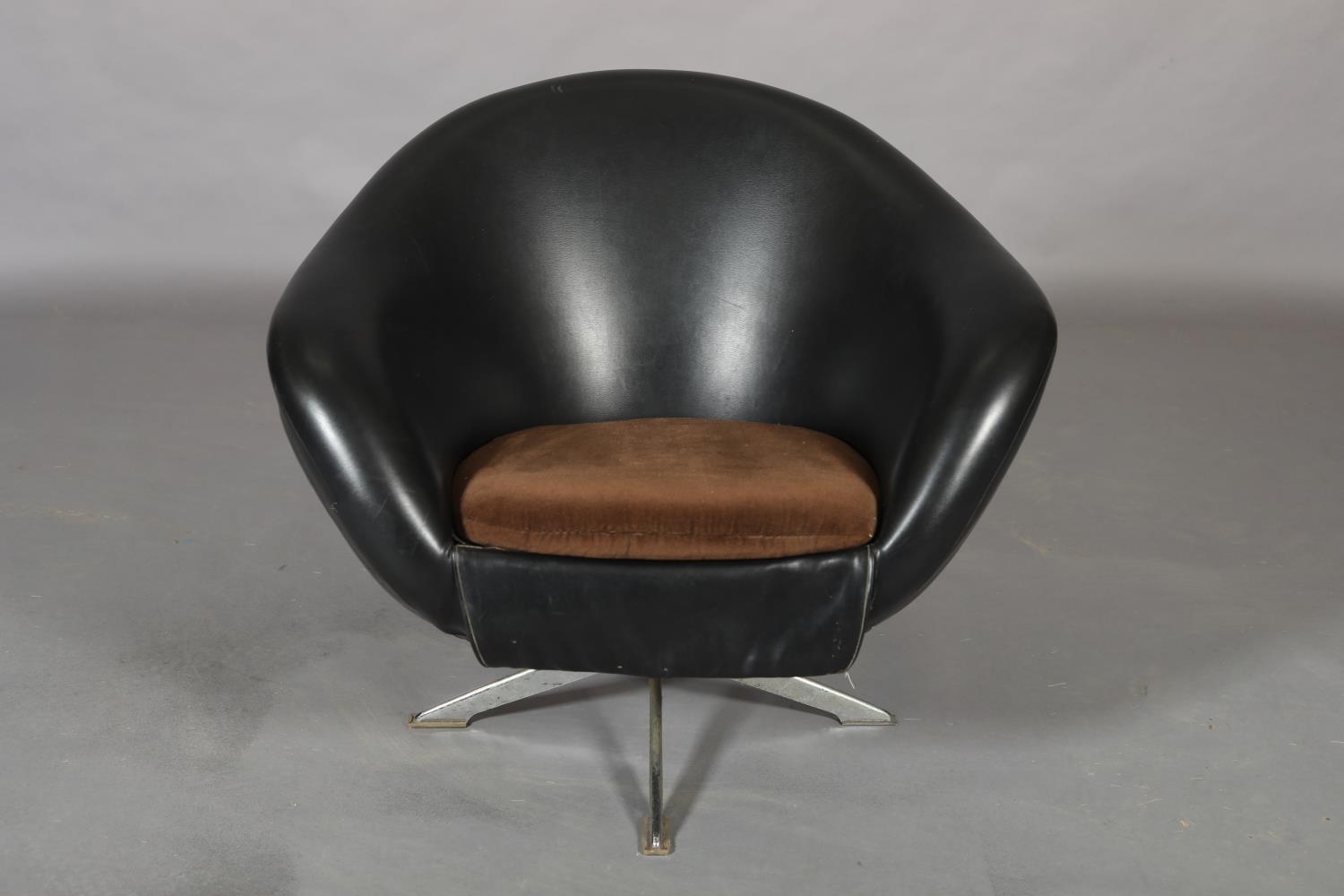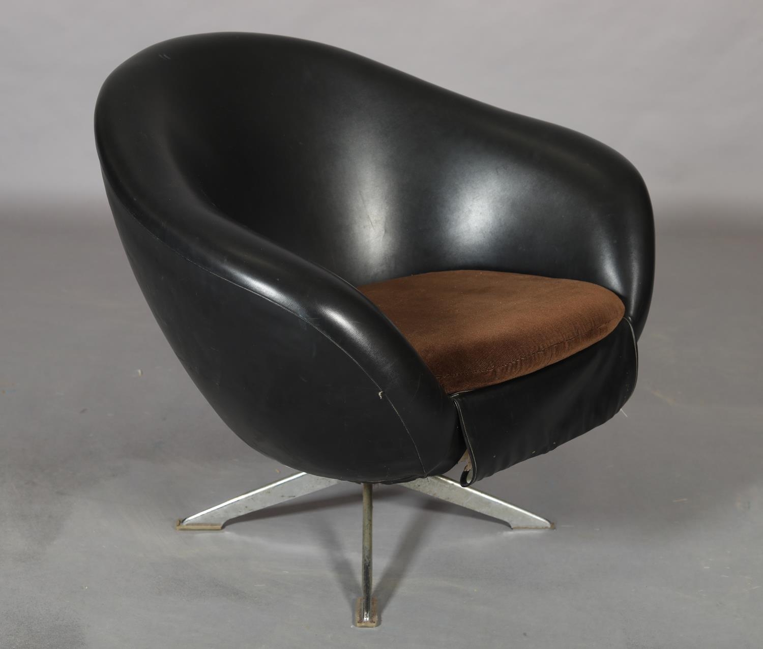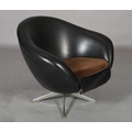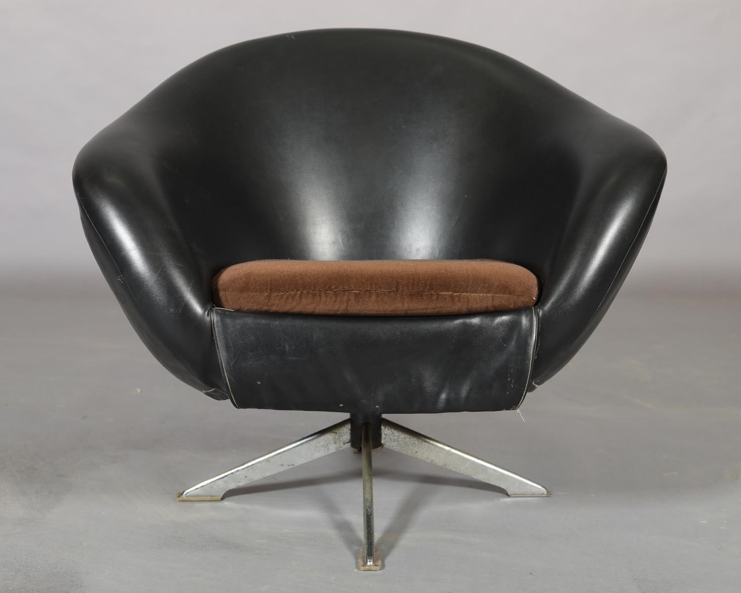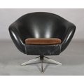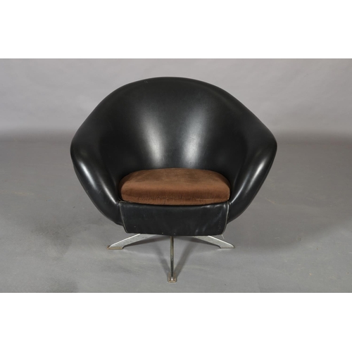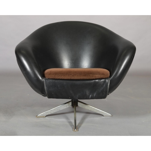 A 1960s black leather-effect swivel chair, brown velour seat cushion, on four chrome leg base