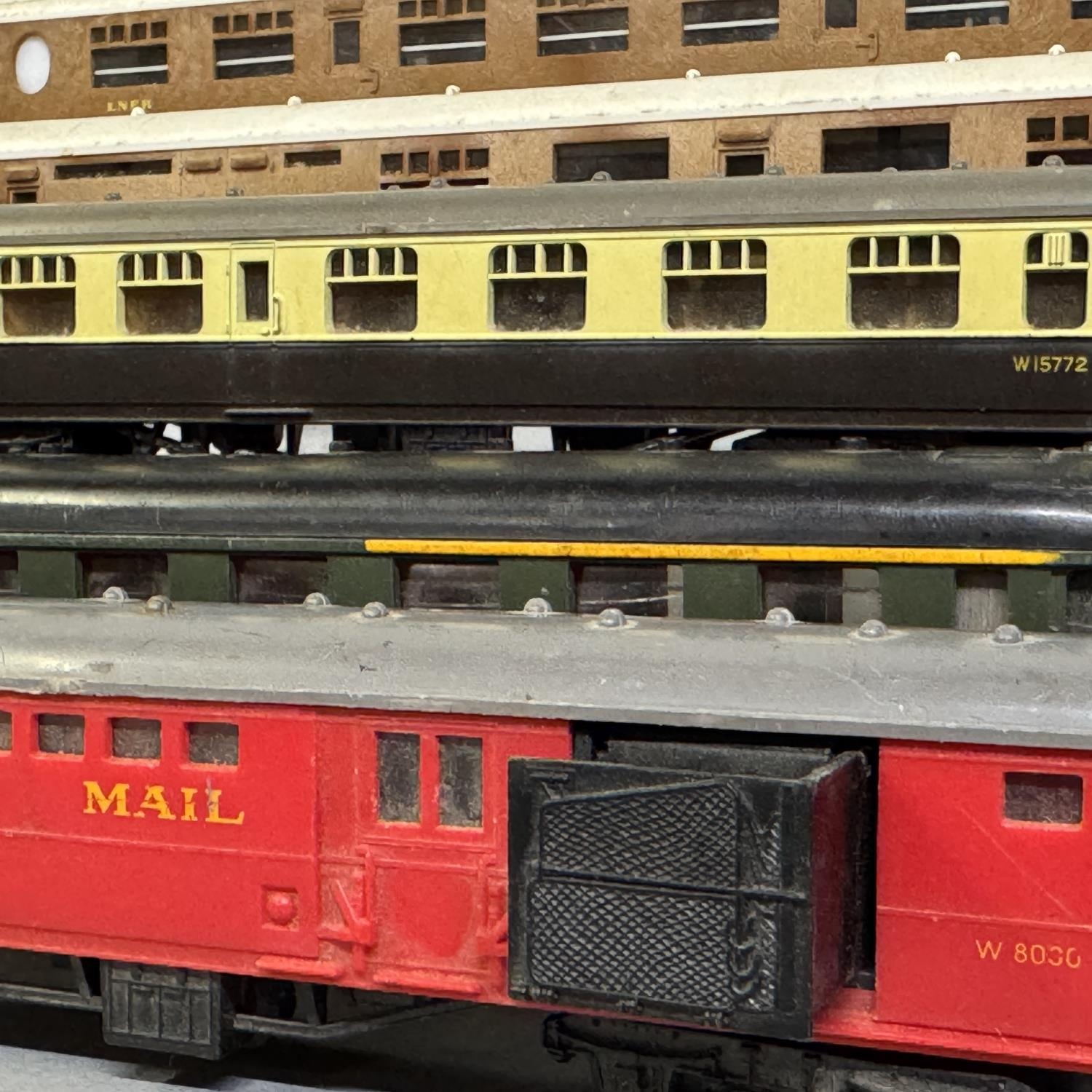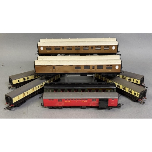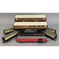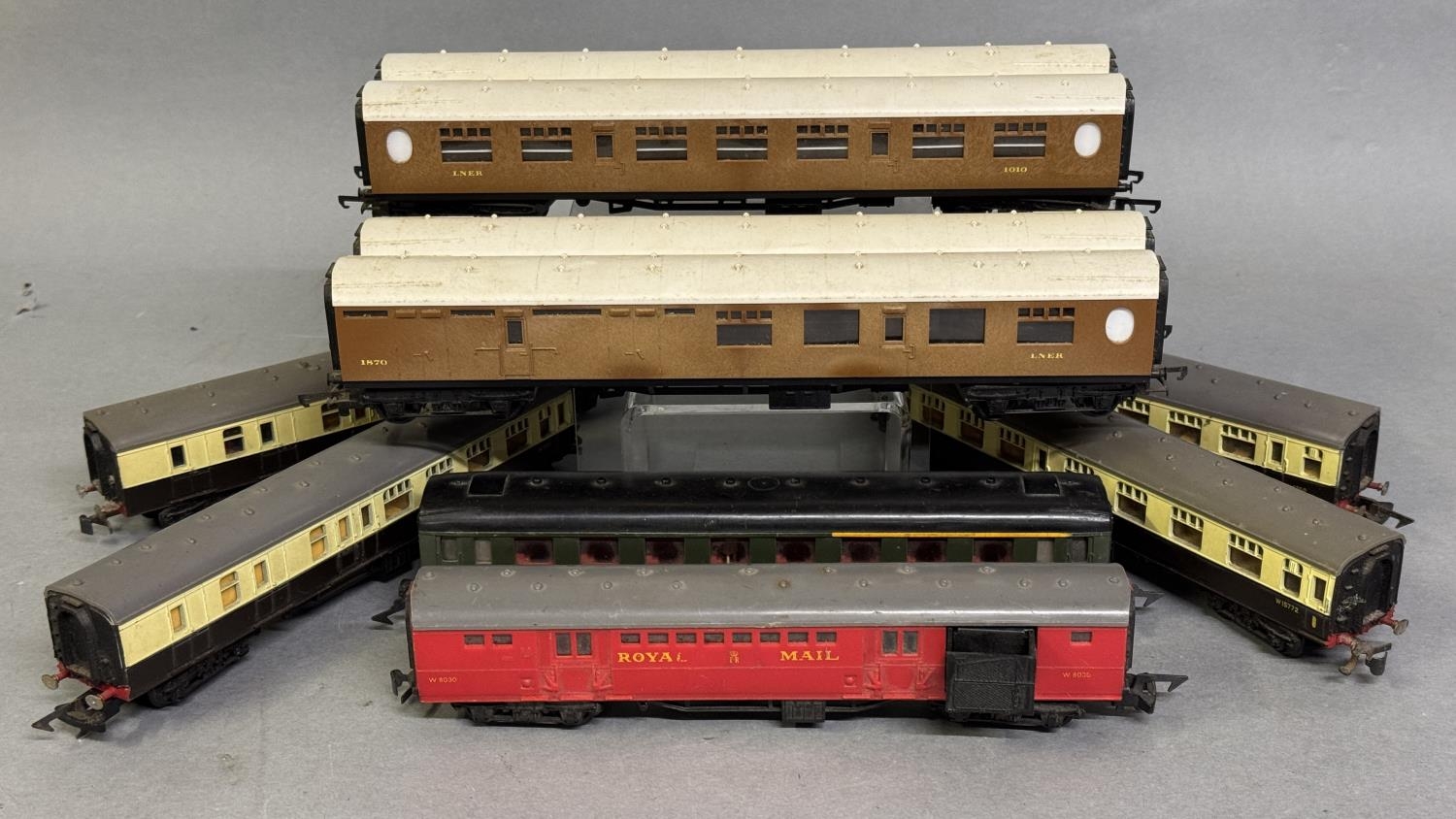 Four Triang LNER teak coaches, along with four Jouef Southern Railway coaches including a restaurant car, a Jouef SNCF composite coach and a a Jouef Royal Mail wagon with collection drawer