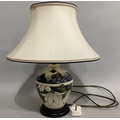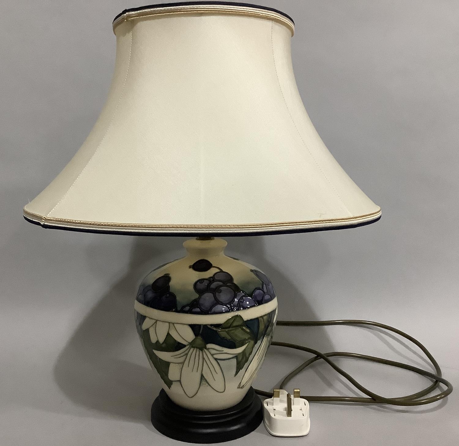 A Moorcroft table lamp of Juneberry pattern designed by Anjl Davenport, ovoid form, on base, with shade, 20cm high without fitting