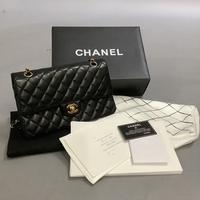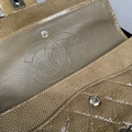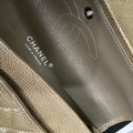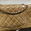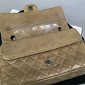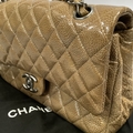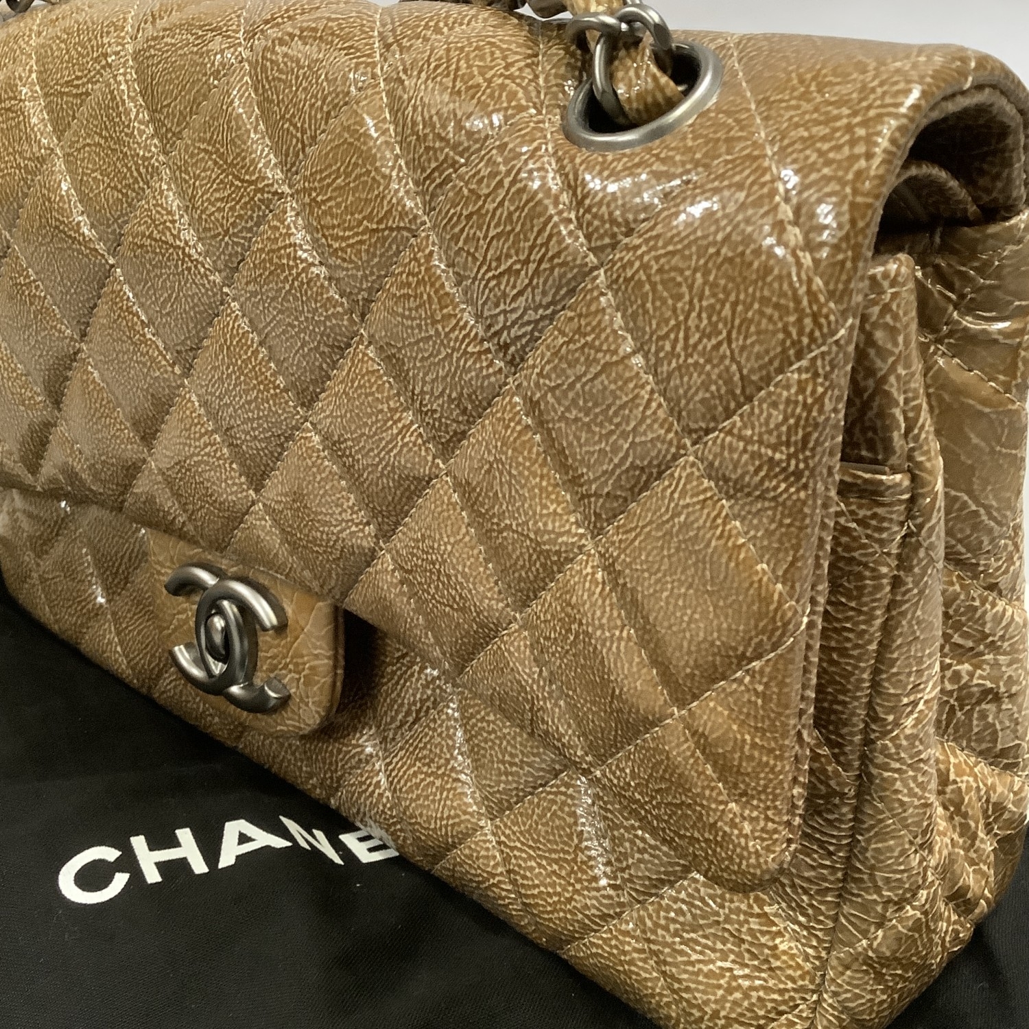 A Chanel caramel crinkled patent leather single flap bag with double-chain strap, 25cm wide, with authentication card No. 12288388, dust bag and box