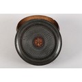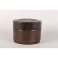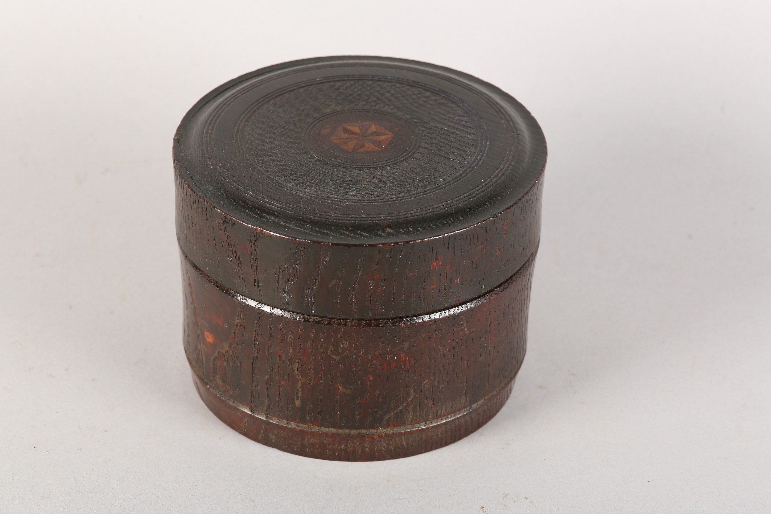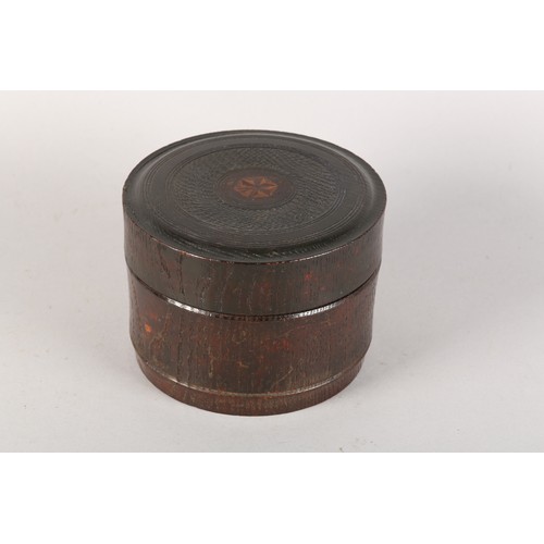 A 19TH CENTURY ELM DRUM SHAPED BOX, the turned cover inlaid with a six point star to the centre, internally with an integral vase and cover, 17cm diameter x 12cm high