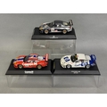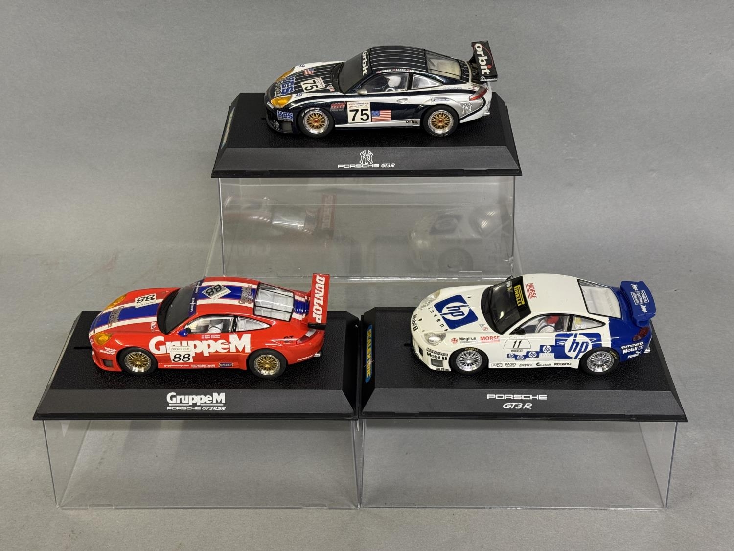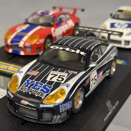 Three Scalextric NASCAR/FIA GT models, including a NY Yankees Porsche 911 GT3-R, a Gruppe M Porsche 911 GT3-R and an HP Porsche 911 GT3-R, all boxed