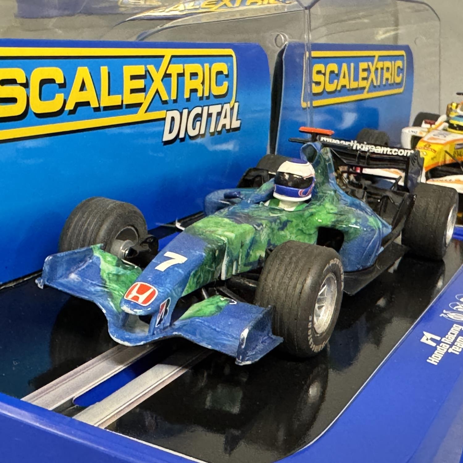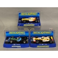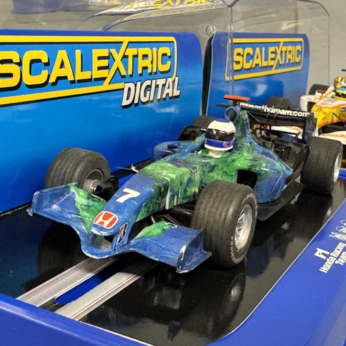 Three Scalextric F1 model cars, including a Renault F1 2009 Piquet, a Honda F1 No7 and a Renault F1 2007, all boxed