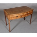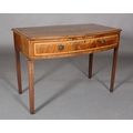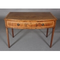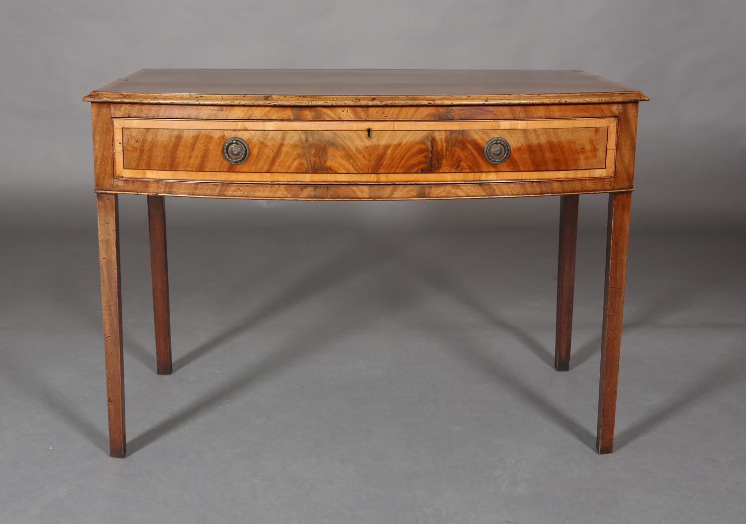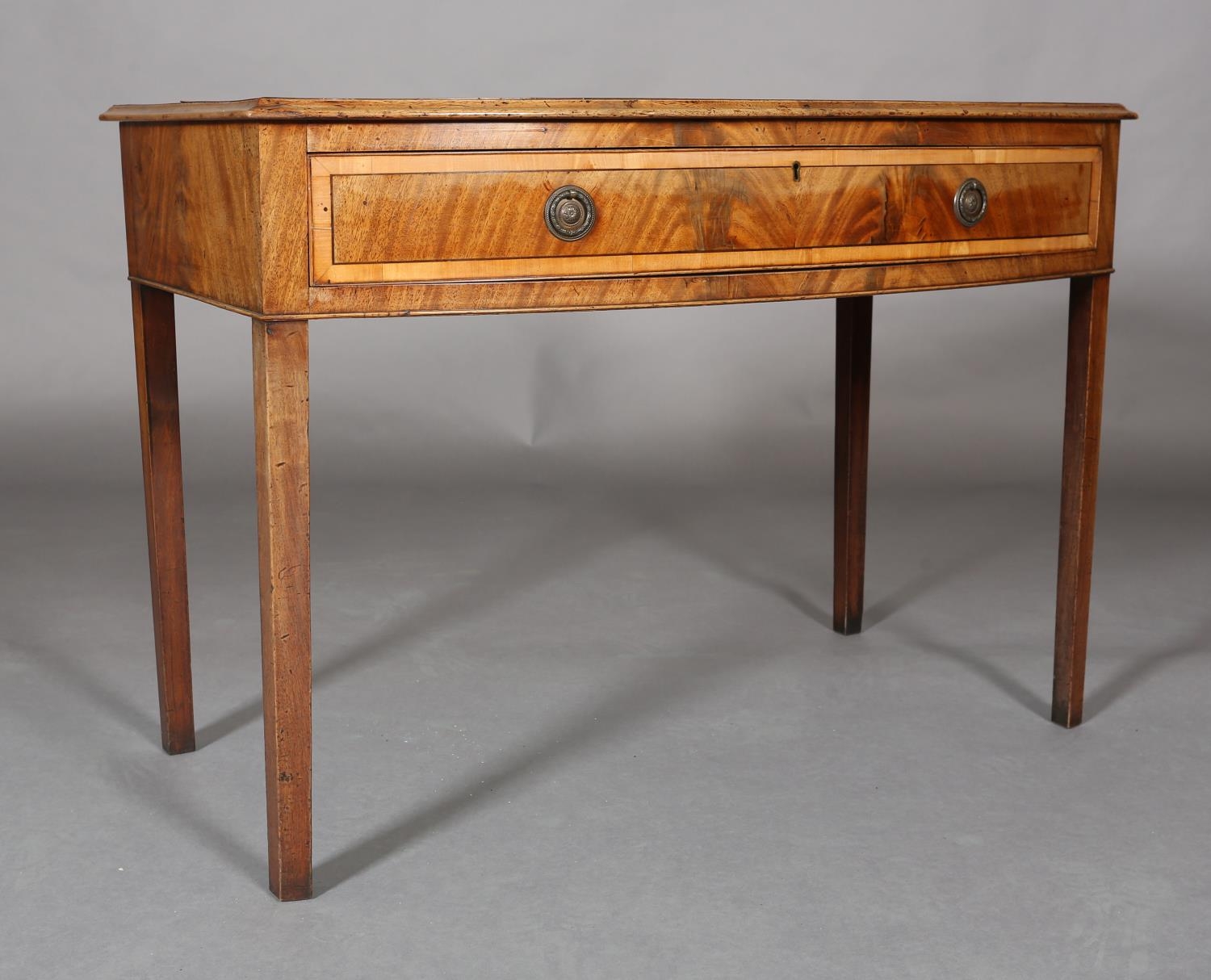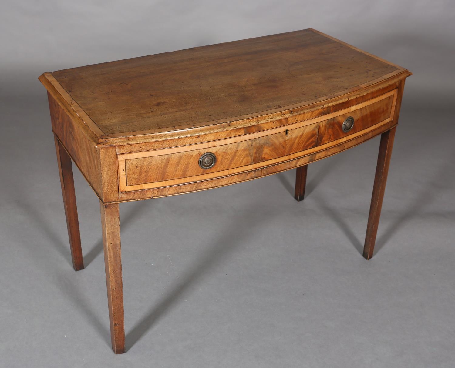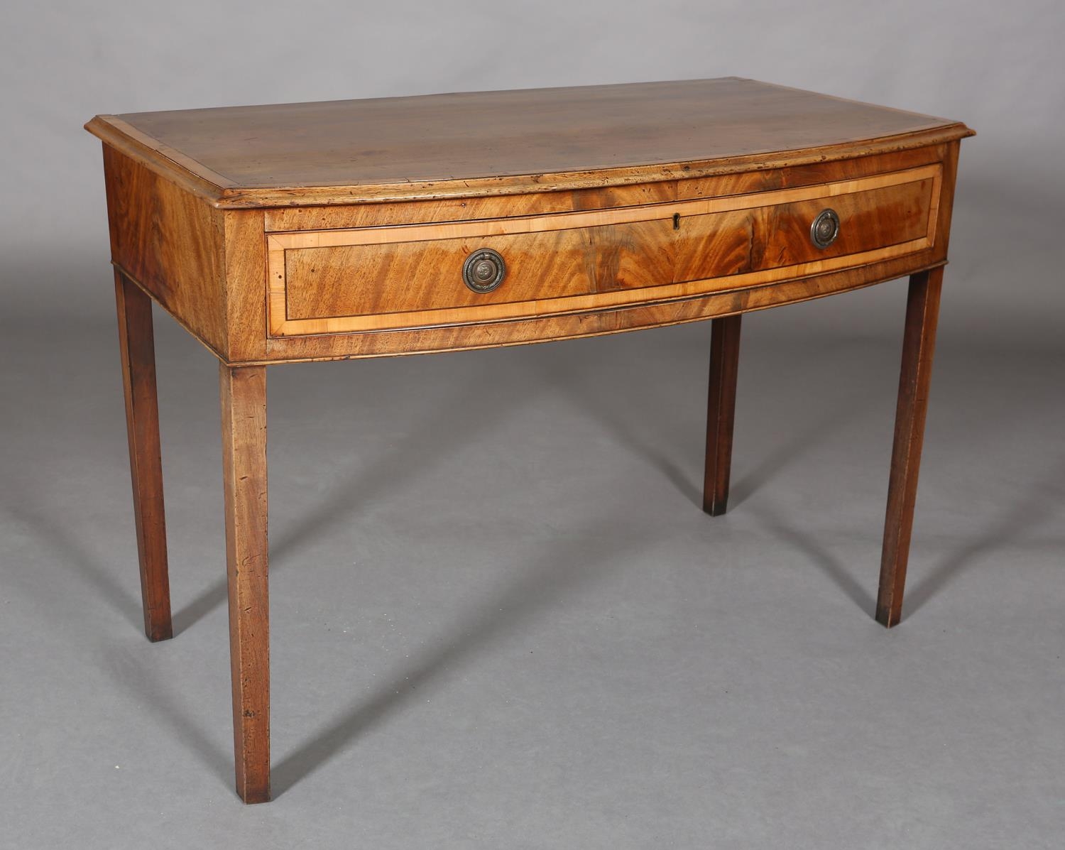 A GEORGE III MAHOGANY CROSSBANDED AND EBONY LINE INLAID BOW FRONTED SIDE TABLE, having a drawer to the apron with rosette and ring handles on square legs, 106cm wide x 60cm deep x 74cm high
