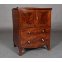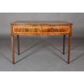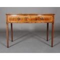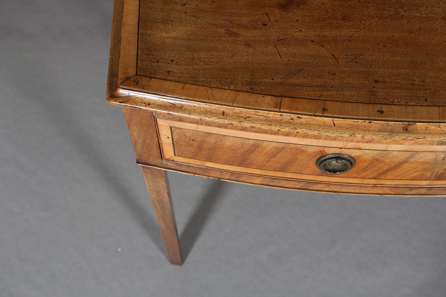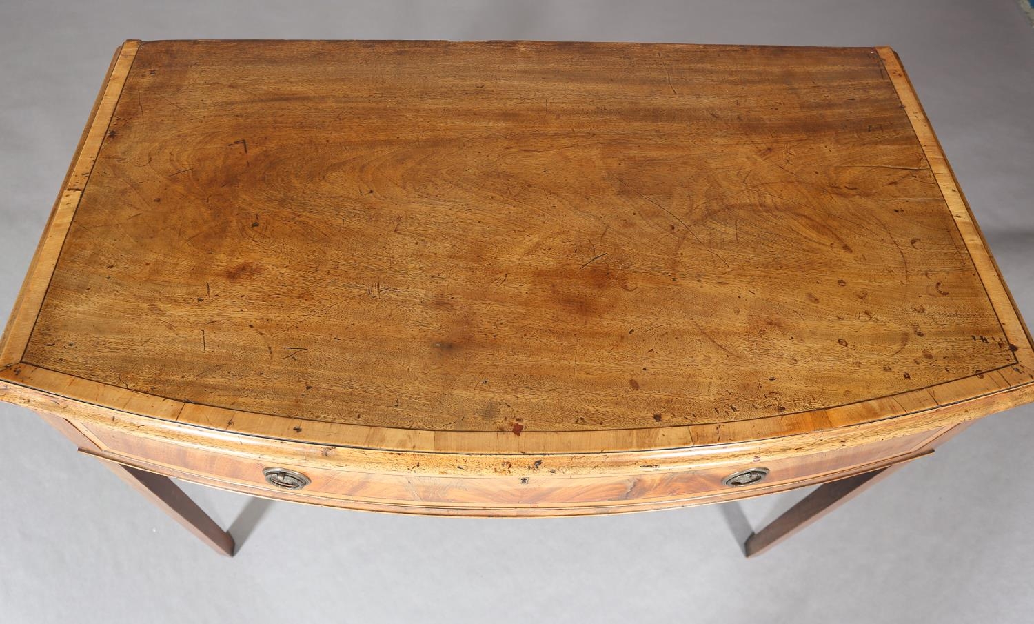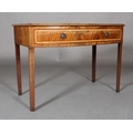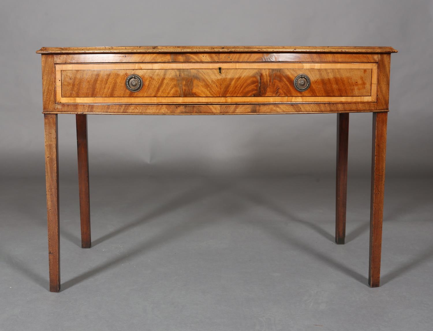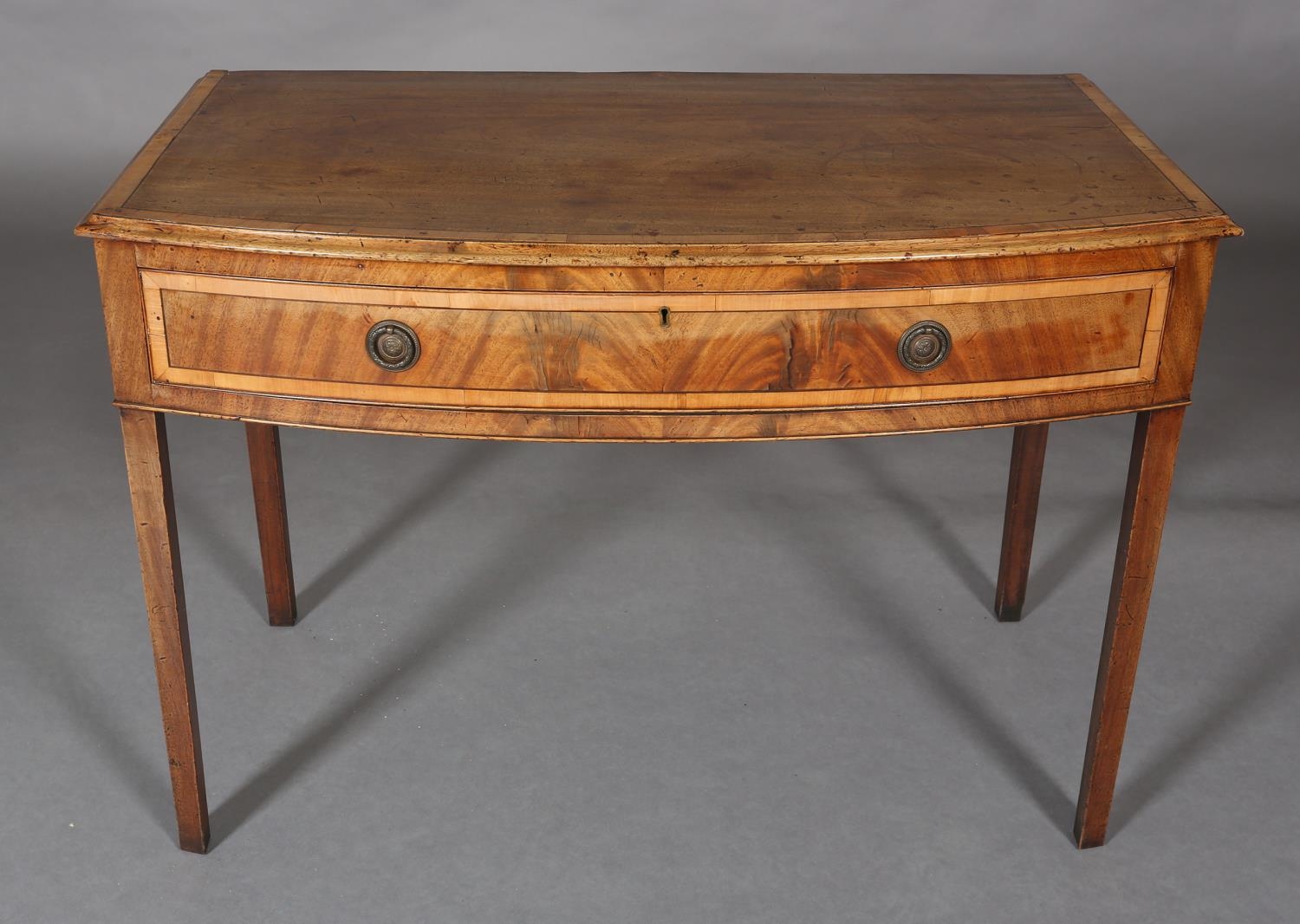 A GEORGE III MAHOGANY CROSSBANDED AND EBONY LINE INLAID BOW FRONTED SIDE TABLE, having a drawer to the apron with rosette and ring handles on square legs, 106cm wide x 60cm deep x 74cm high
