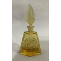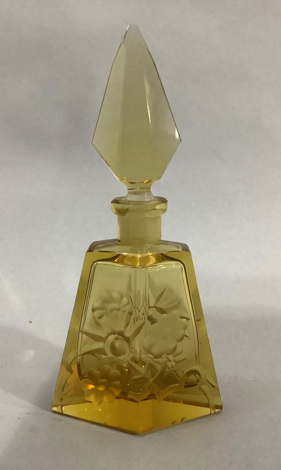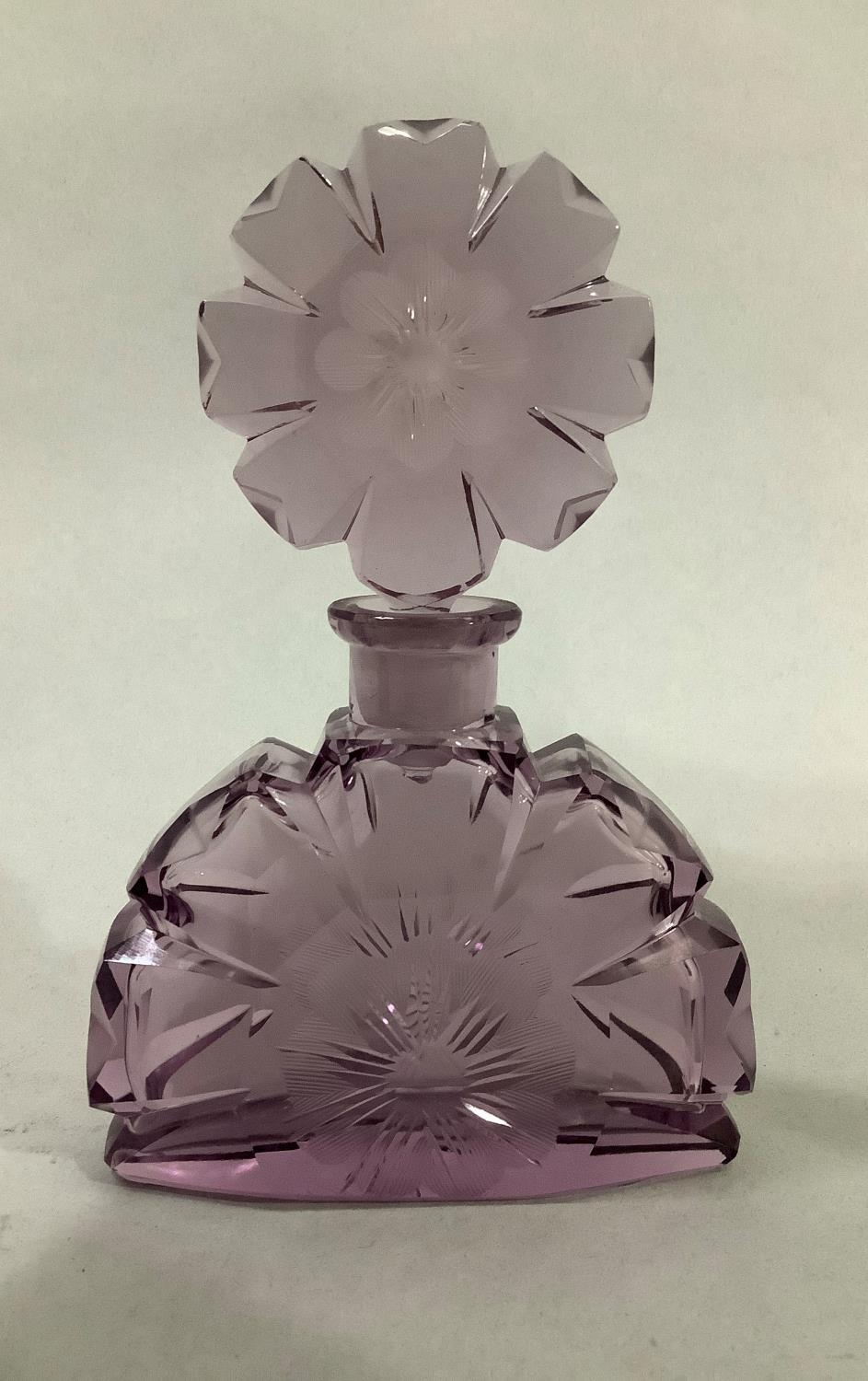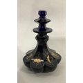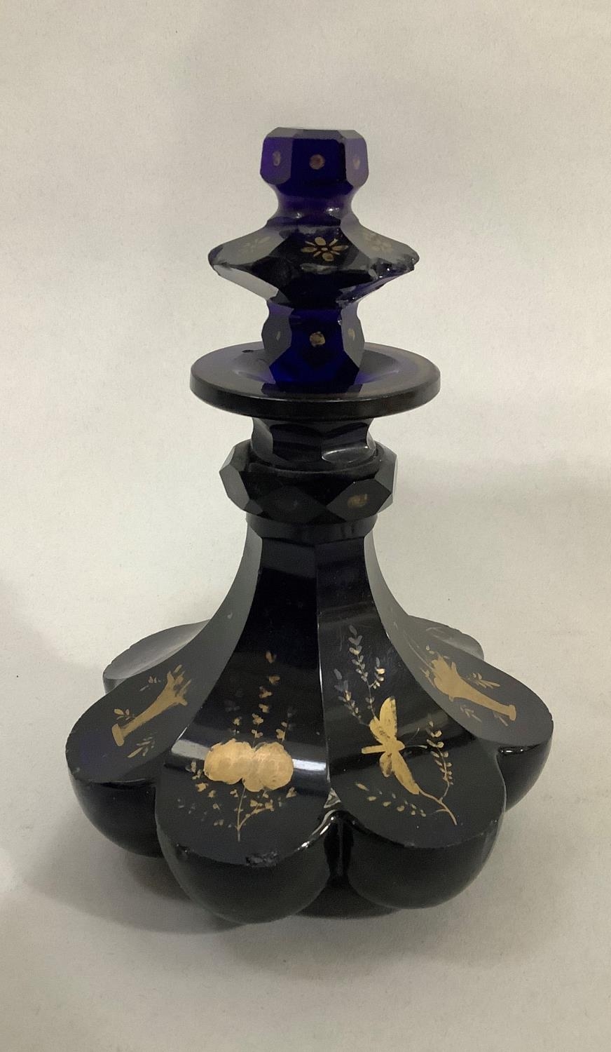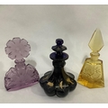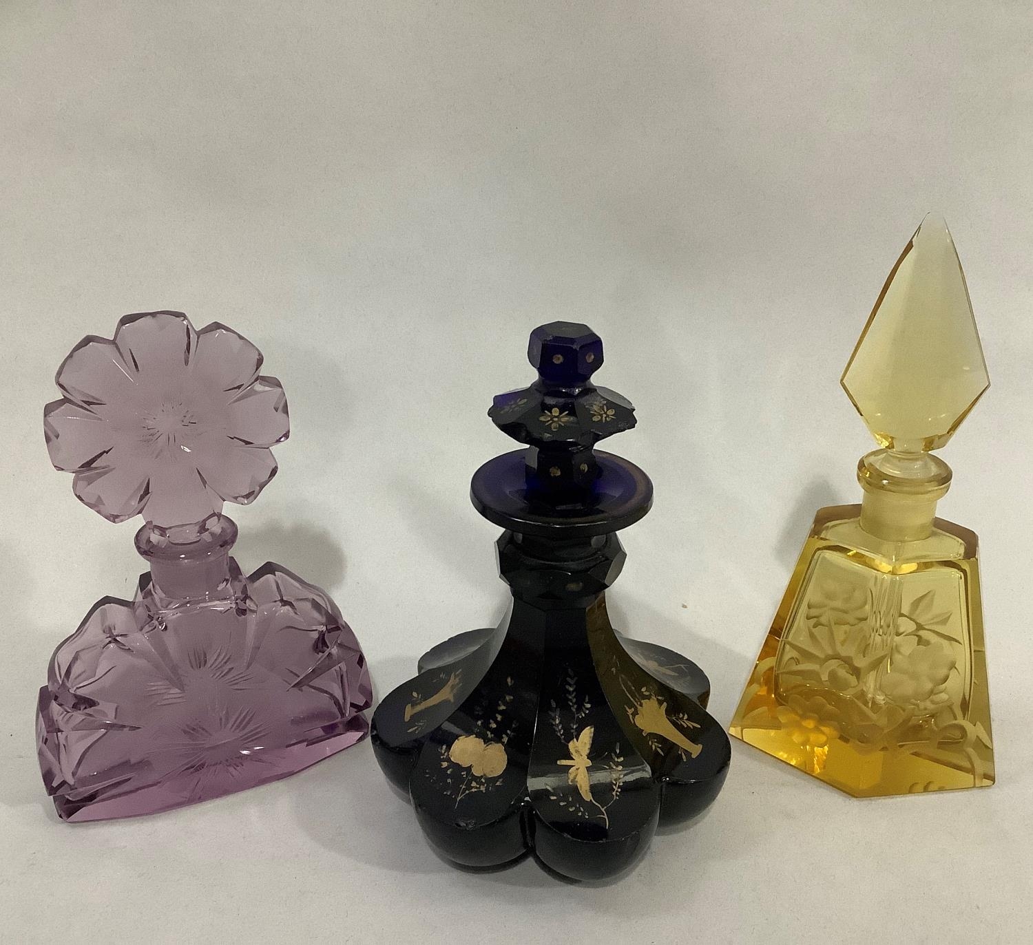 A Victorian 'Bristol' blue and gilt perfume bottle of scalloped outline together with two Art Deco perfume bottles in amethyst cut and etched with flowerhead and an amber scent bottle with lozenge shaped stopper, highest 17cm