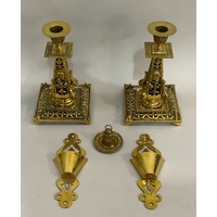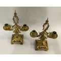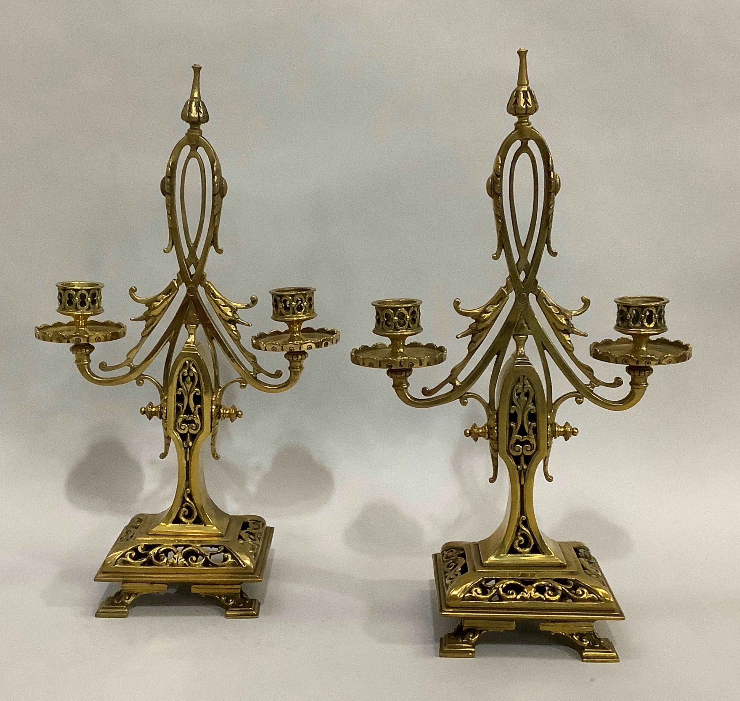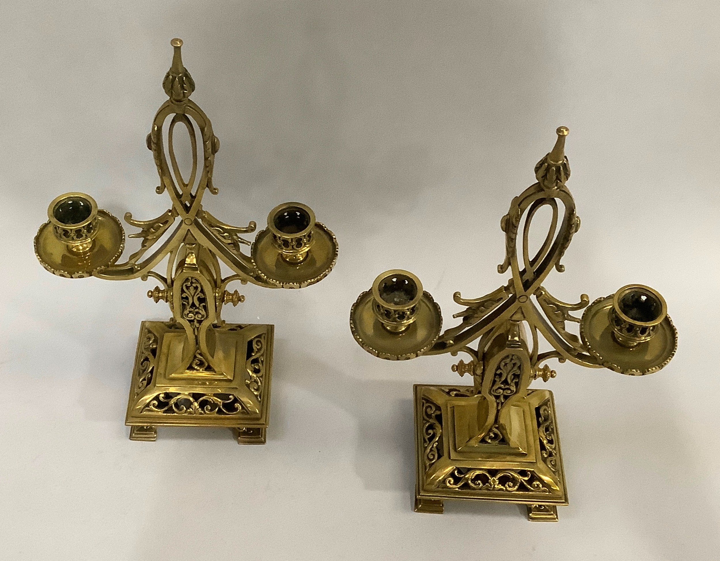 A pair of Victorian brass twin sconce candlesticks with looped handles on rectangular bases with bracket feet, 34cm high