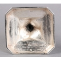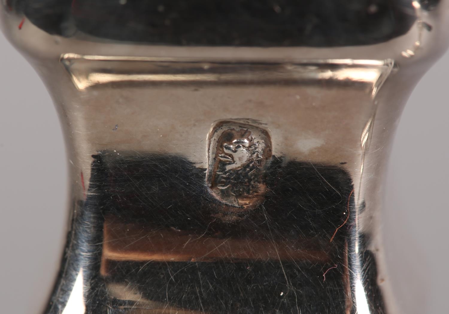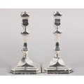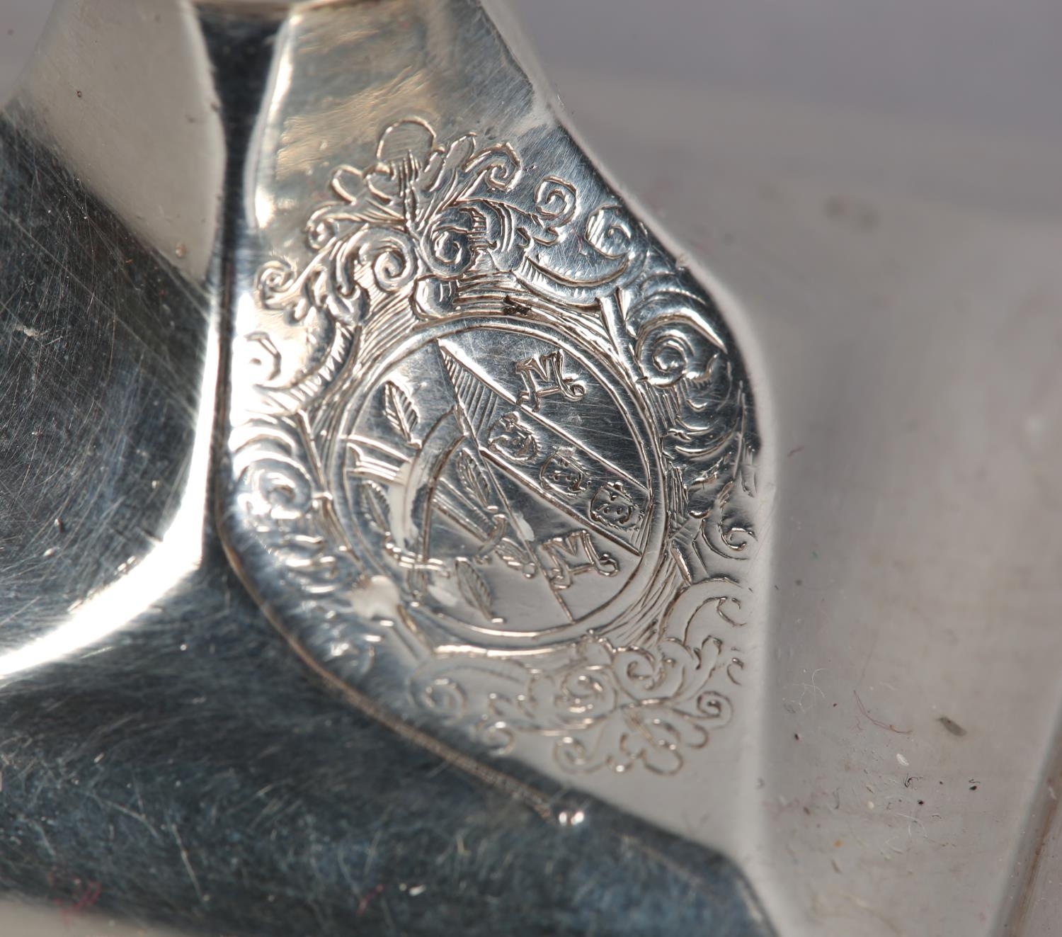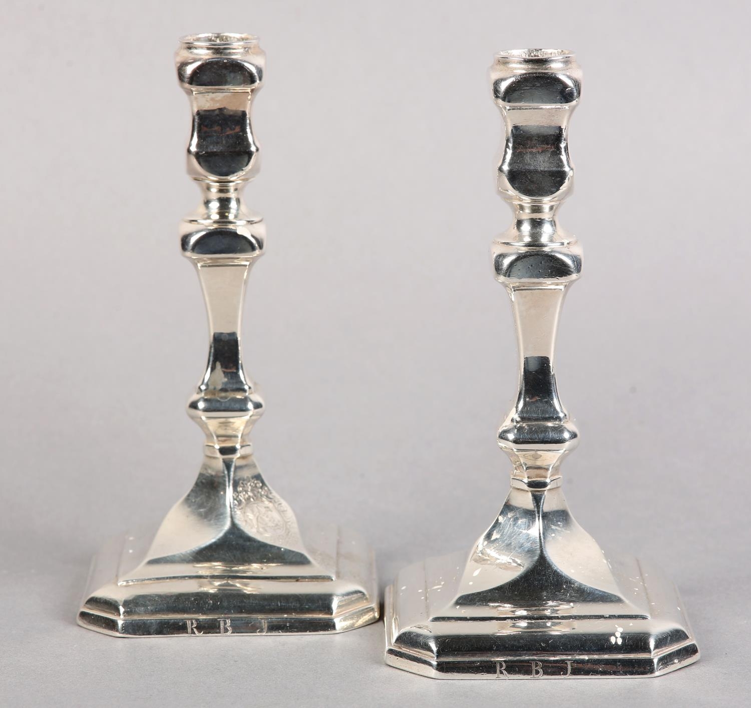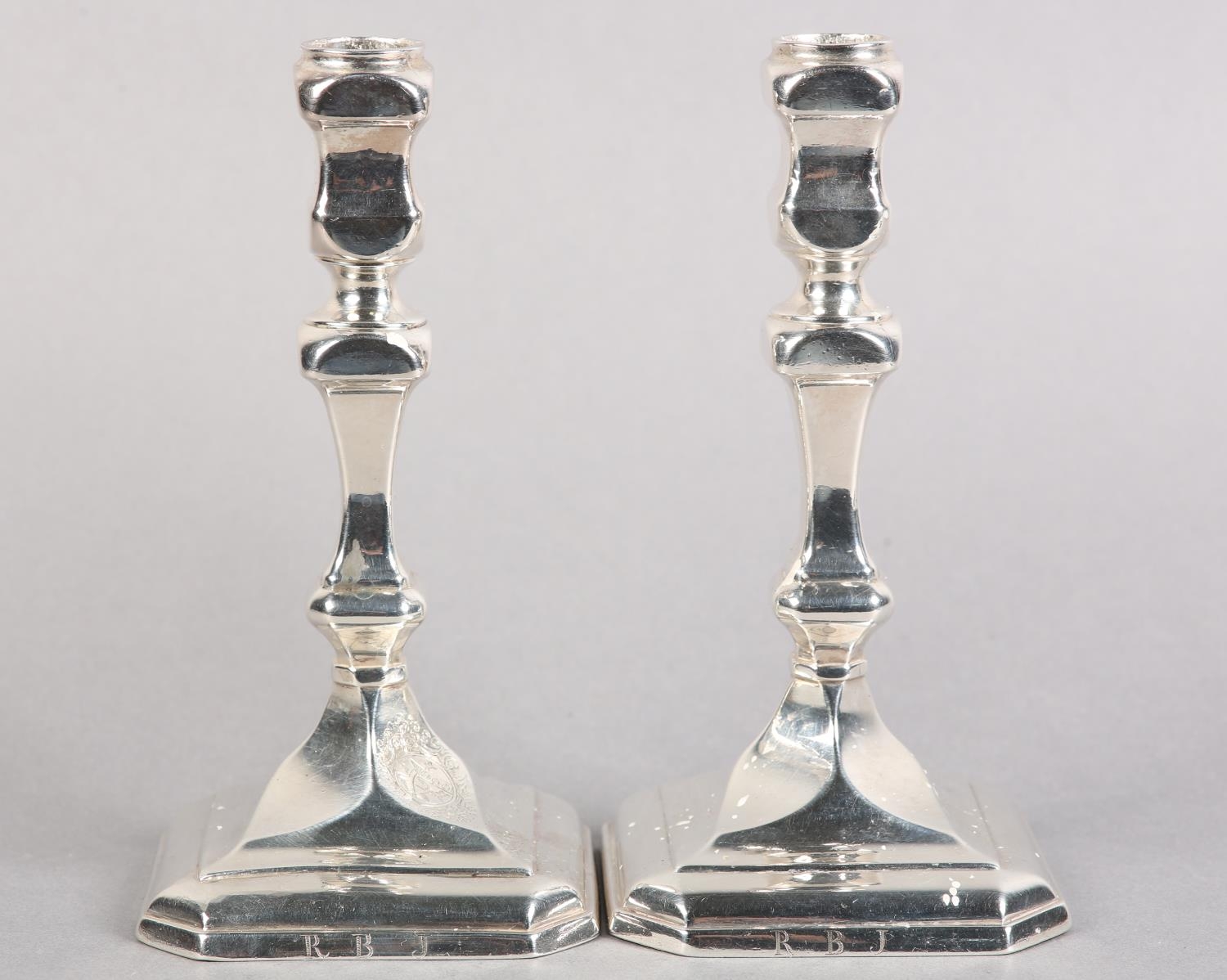 A PAIR OF GEORGE I BRITANNIA SILVER TAPER STICKS, London 1718, Edmund Holaday, each of baluster tapered octagonal stems on square canted bases, engraved to the navette facet with coat of arms and initialled RBJ to one edge of the foot, approximate height 17cm, total approximate weight 17oz