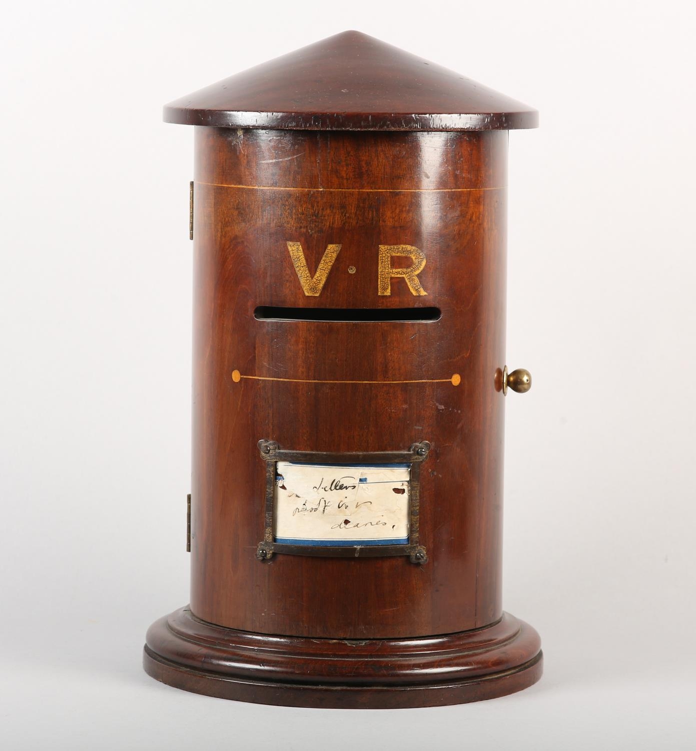 A VICTORIAN MAHOGANY AND BRASS MOUNTED COUNTRY HOUSE LETTER BOX, gilded with VR above the slot, satinwood horizontal line inlay, on circular foot, 41.5cm high