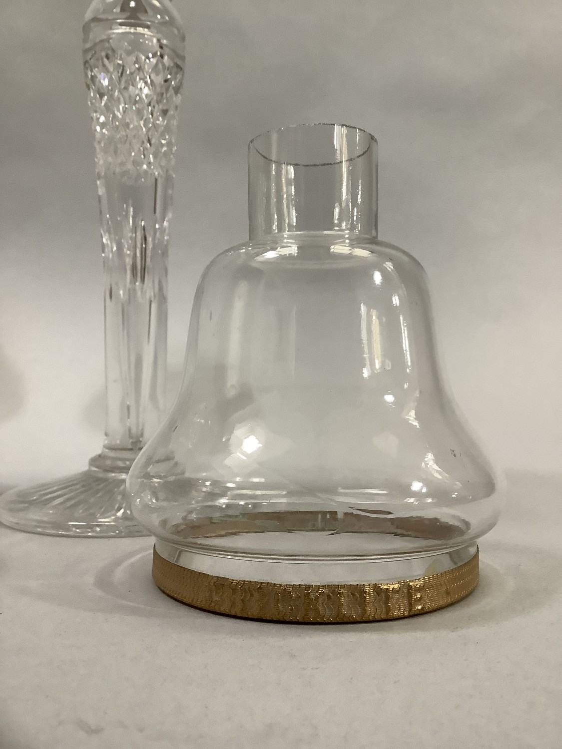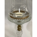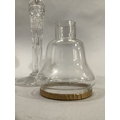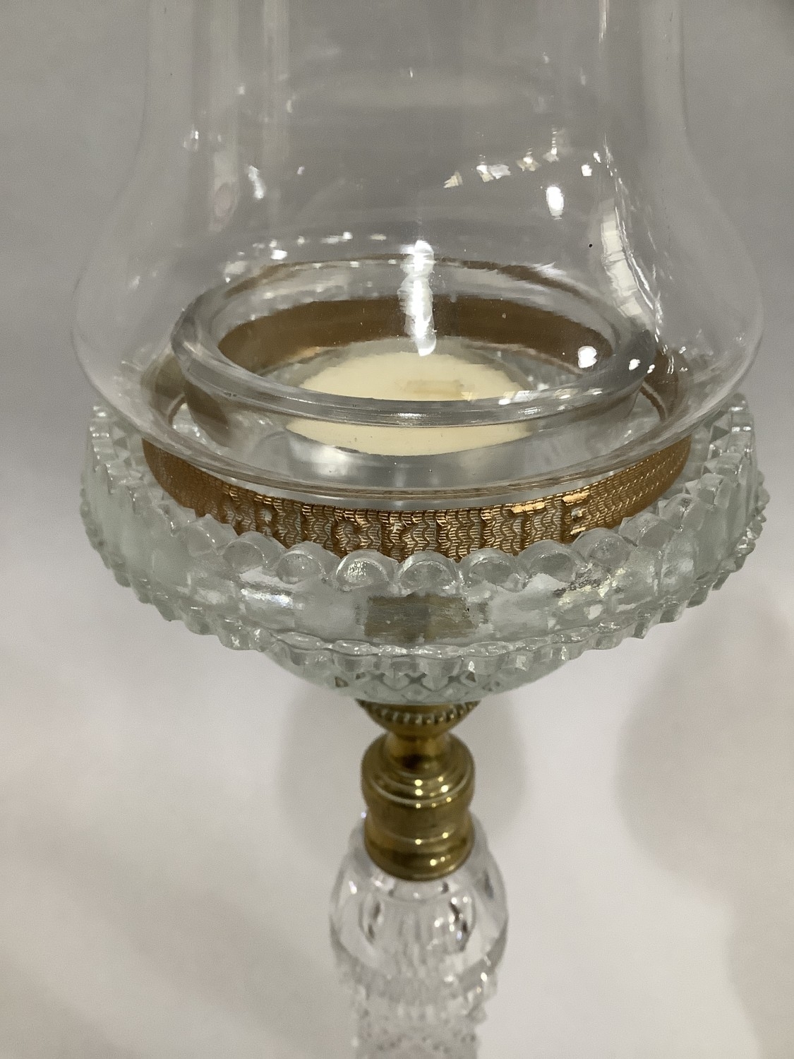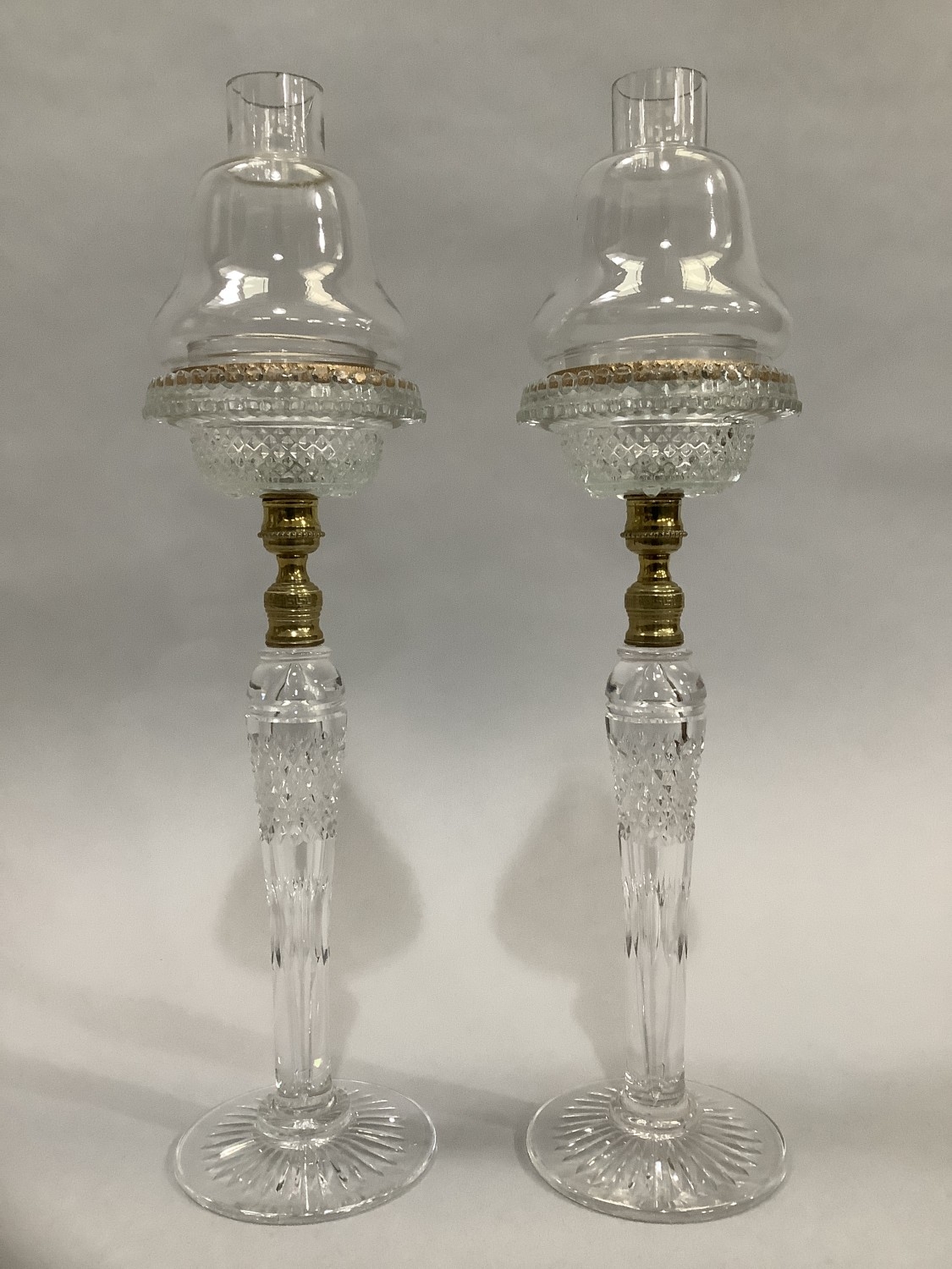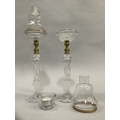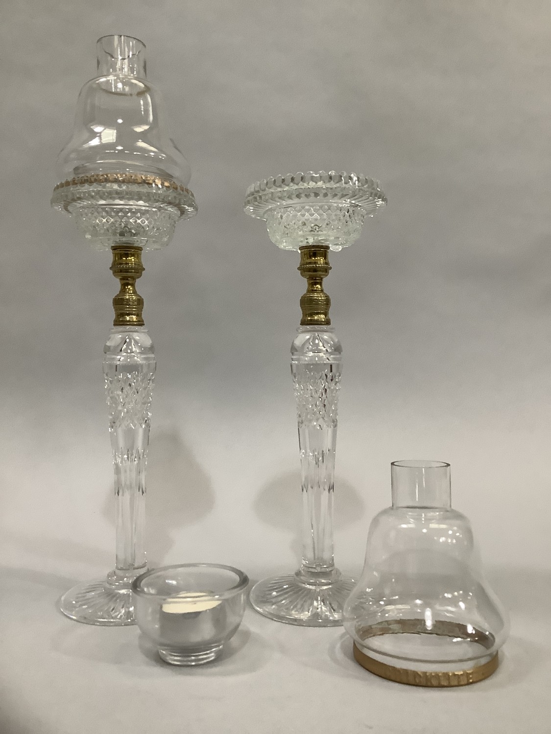 A PAIR OF CLARKE'S PATENT CRICKLITES C.1880, having brass collared cut glass stems on circular foot, moulded glass sconces complete with glass candle light dish and glass bell shaped shade with gilt metal mounted rim embossed 'cricklite' 40cm high