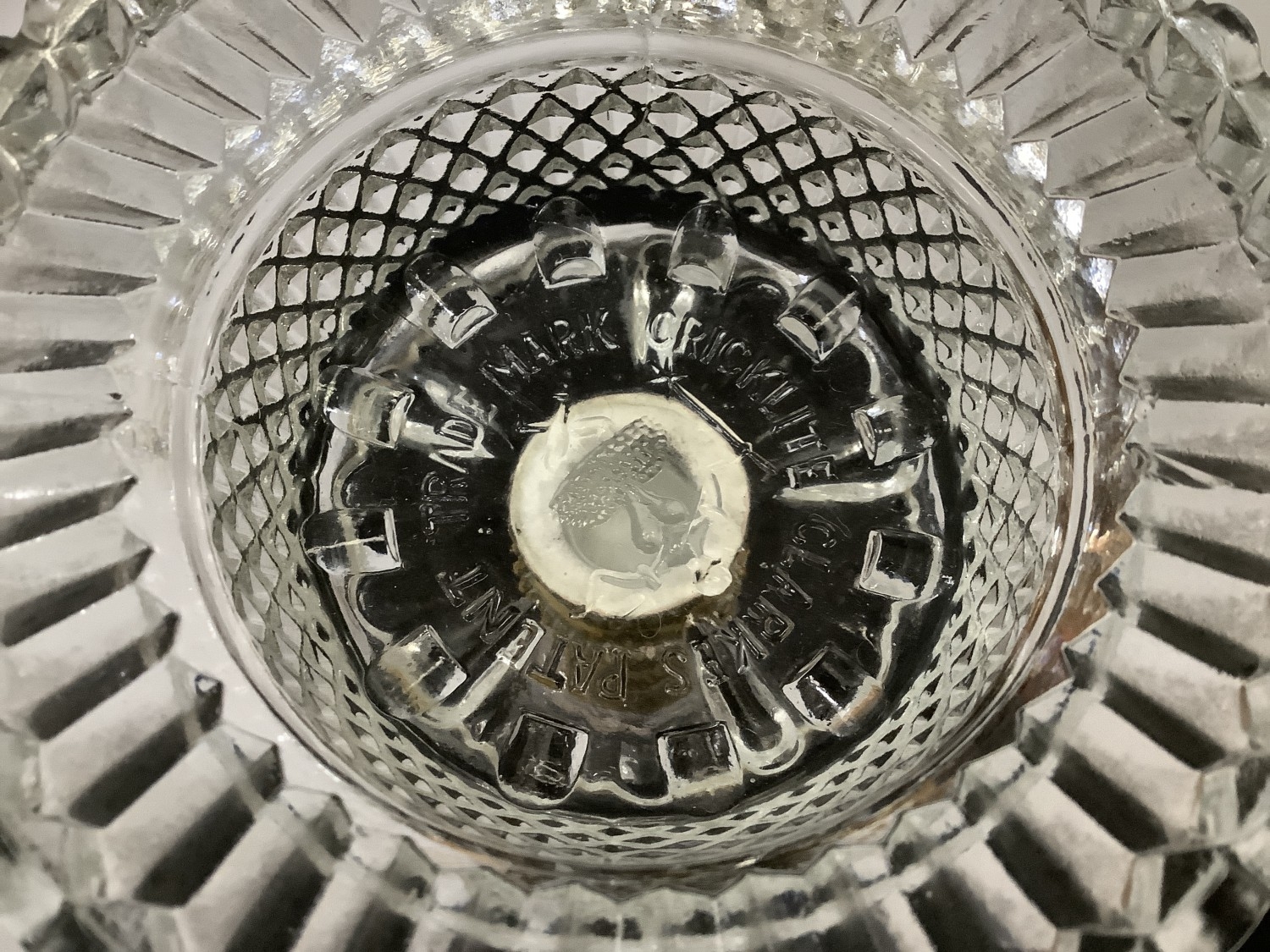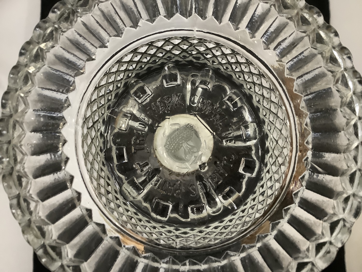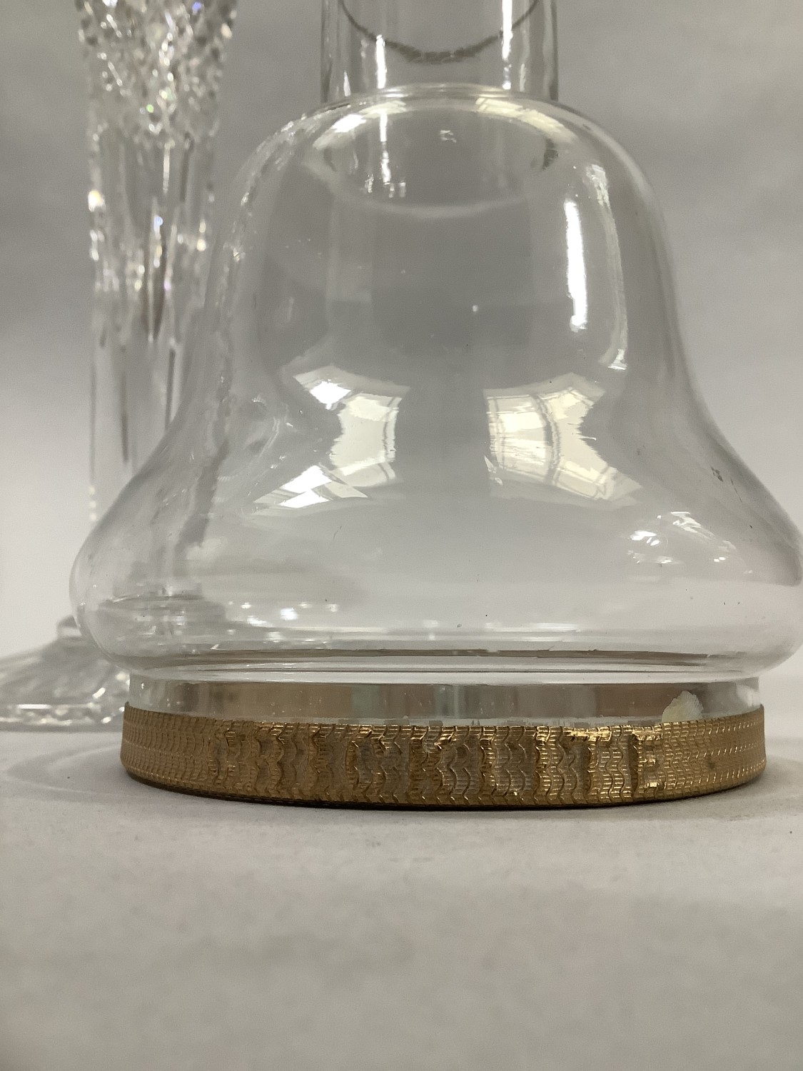 Shades - no chips or cracks. Metal band in good order. One candle dish has a chip to foot rim. One stick has a tiny chip on an angle amongst the linear cut to the stem. One scallop on top rim has a small chip to the front - not on the profile. Hard to see - found more on touch. Second stick also has tiny chip on angle amongst linear cut/ The flange on the top dish has three small chips again not immediately noticeable, only a closer inspection.
