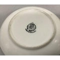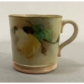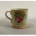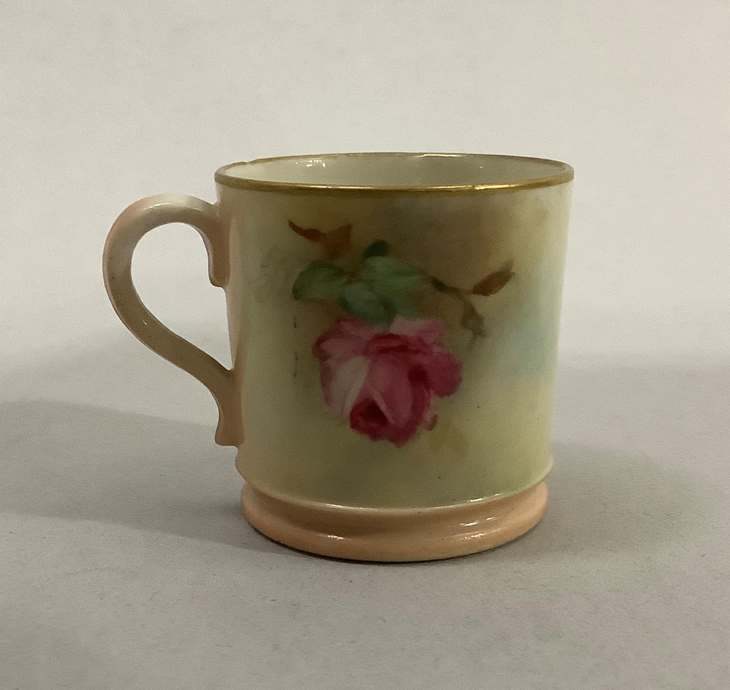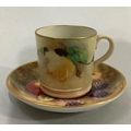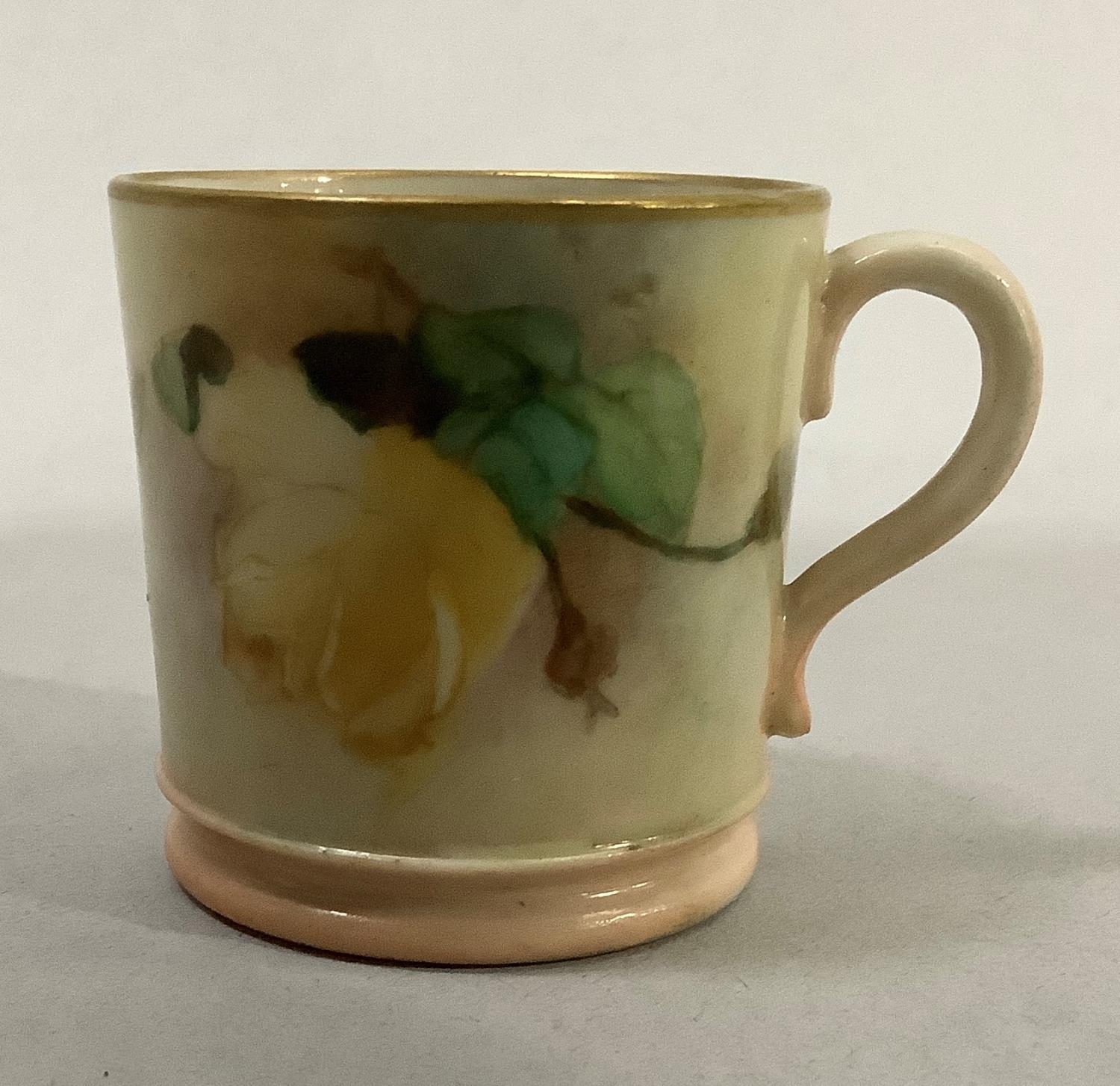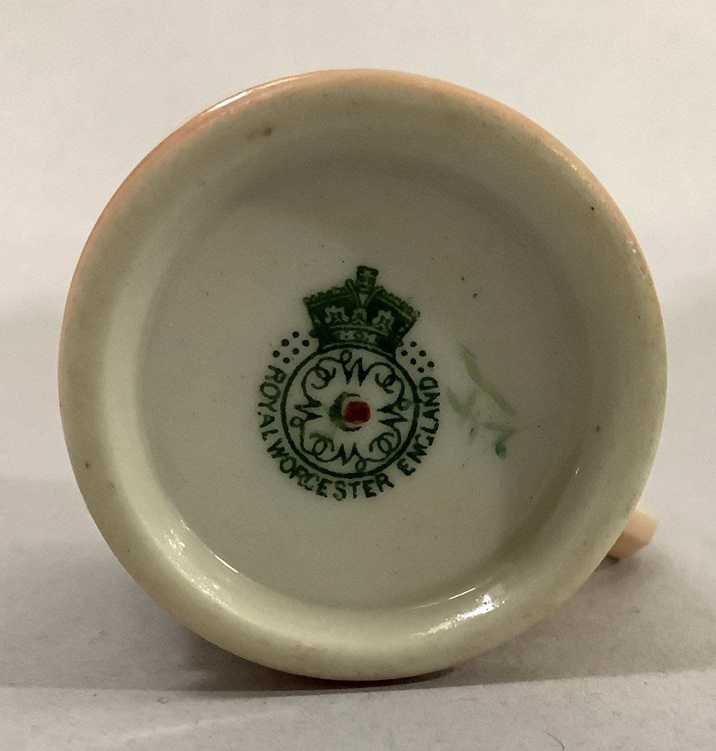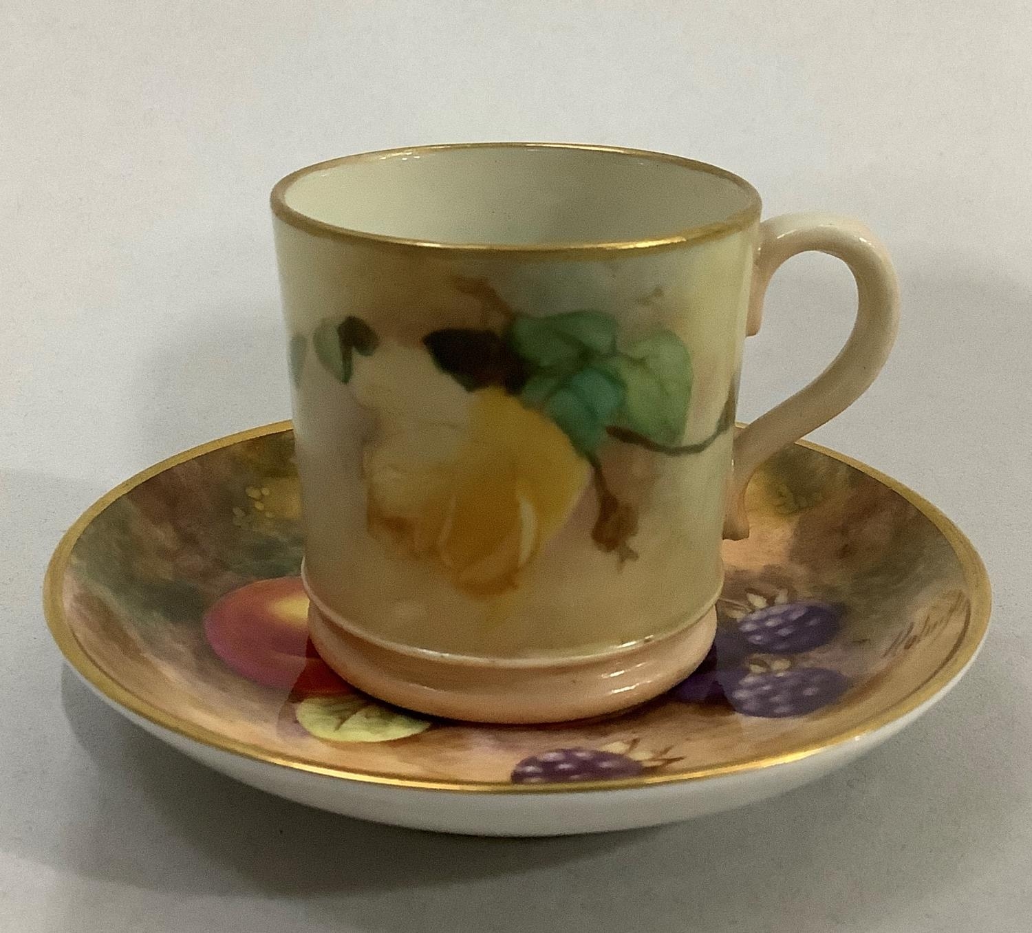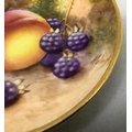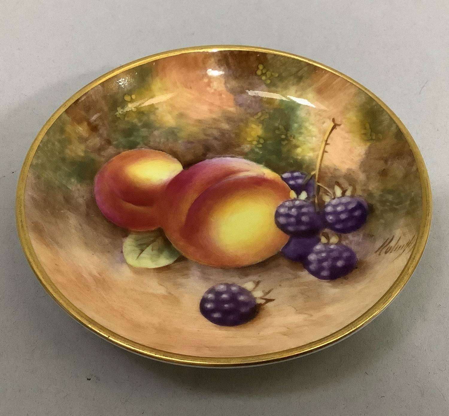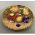 A ROYAL WORCESTER FRUIT PAINTED PIN DISH, circular, signed Rolings and painted with peaches and blackberries, black printed mark for 1953, 9cm diameter together with a miniature rose painted mug, 4.5cm high
