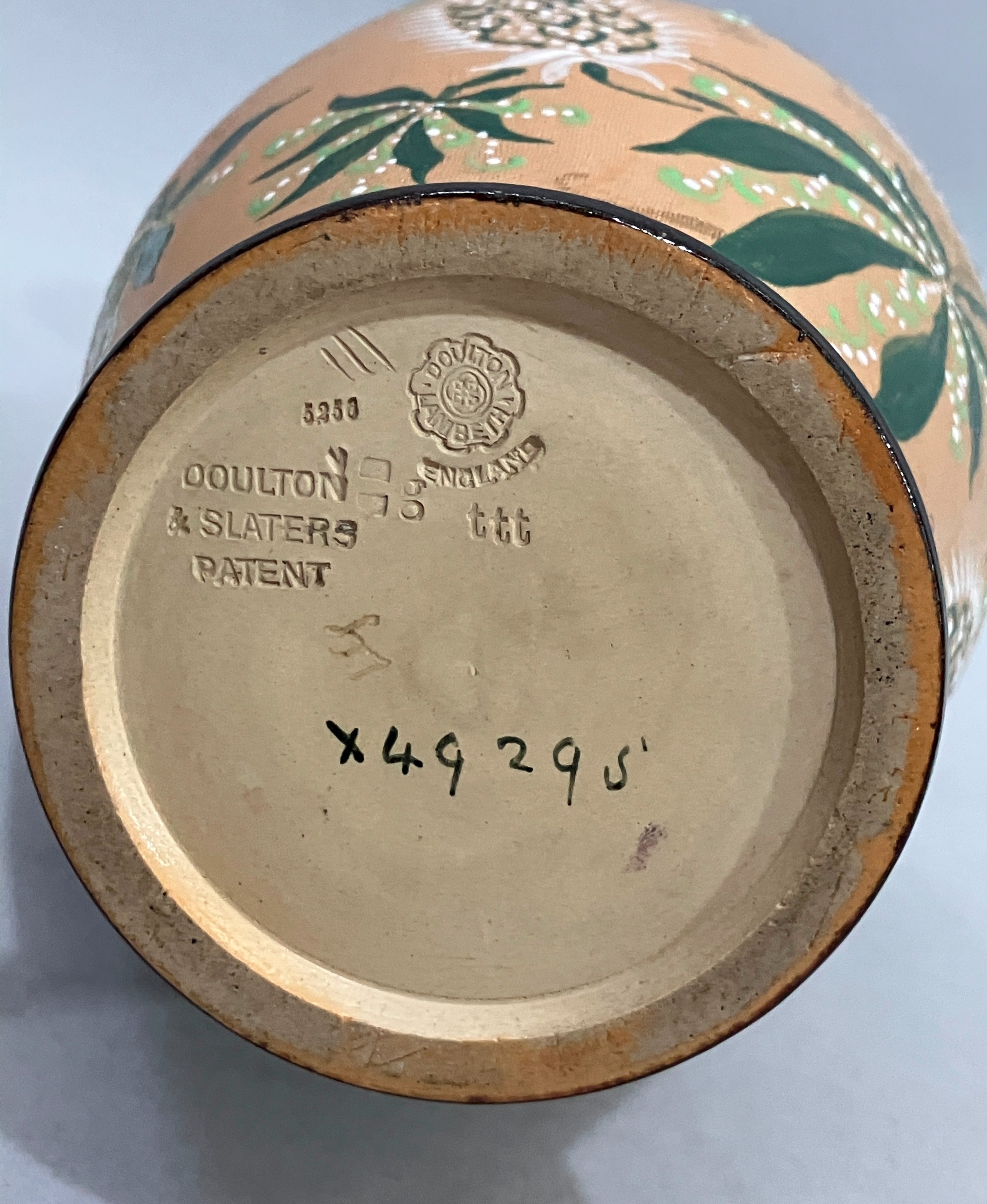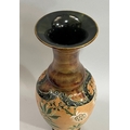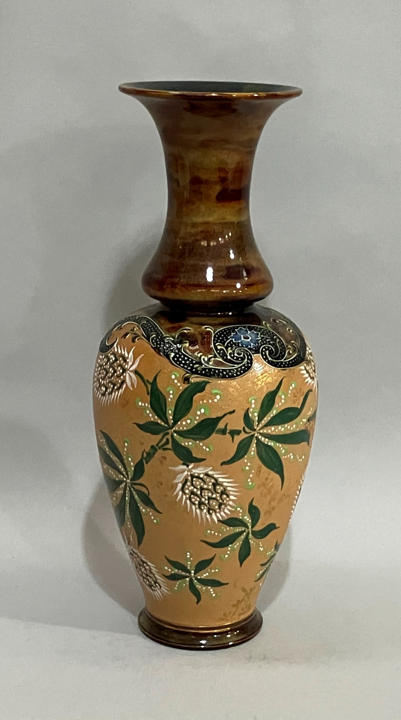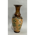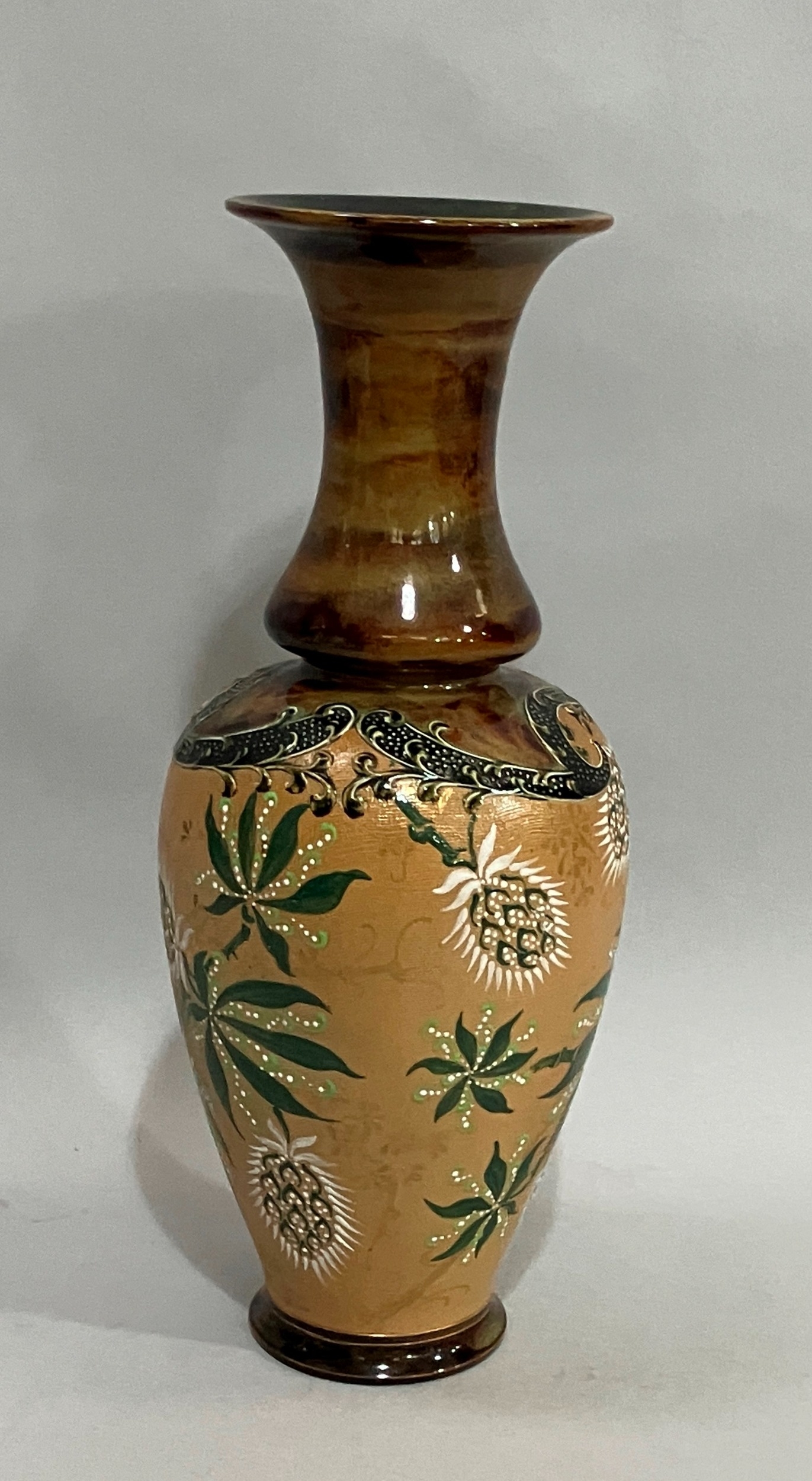A Doulton Slater stoneware vase, the body buff ground enamelled in green and white with flowers and having a brown mottled neck with everted rim, impressed mark to underside, 40cm high