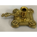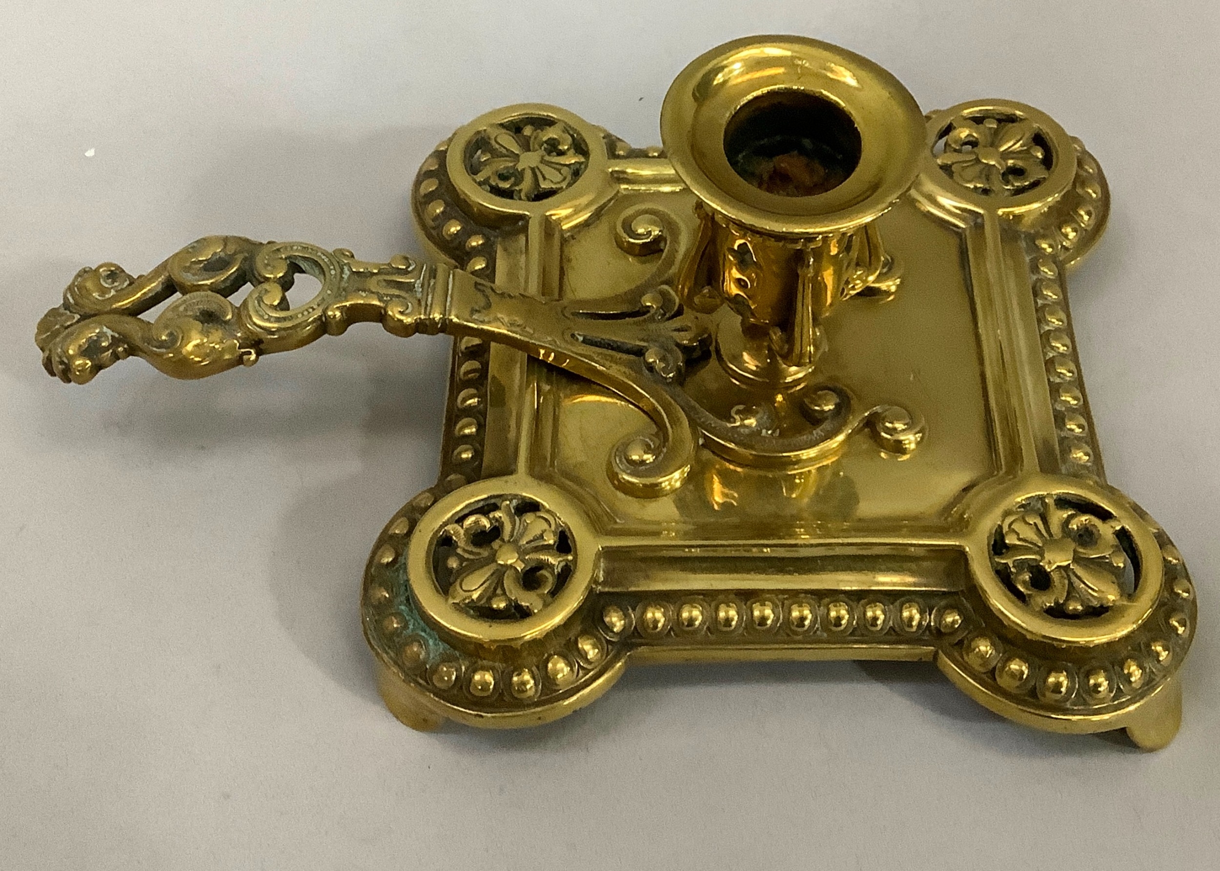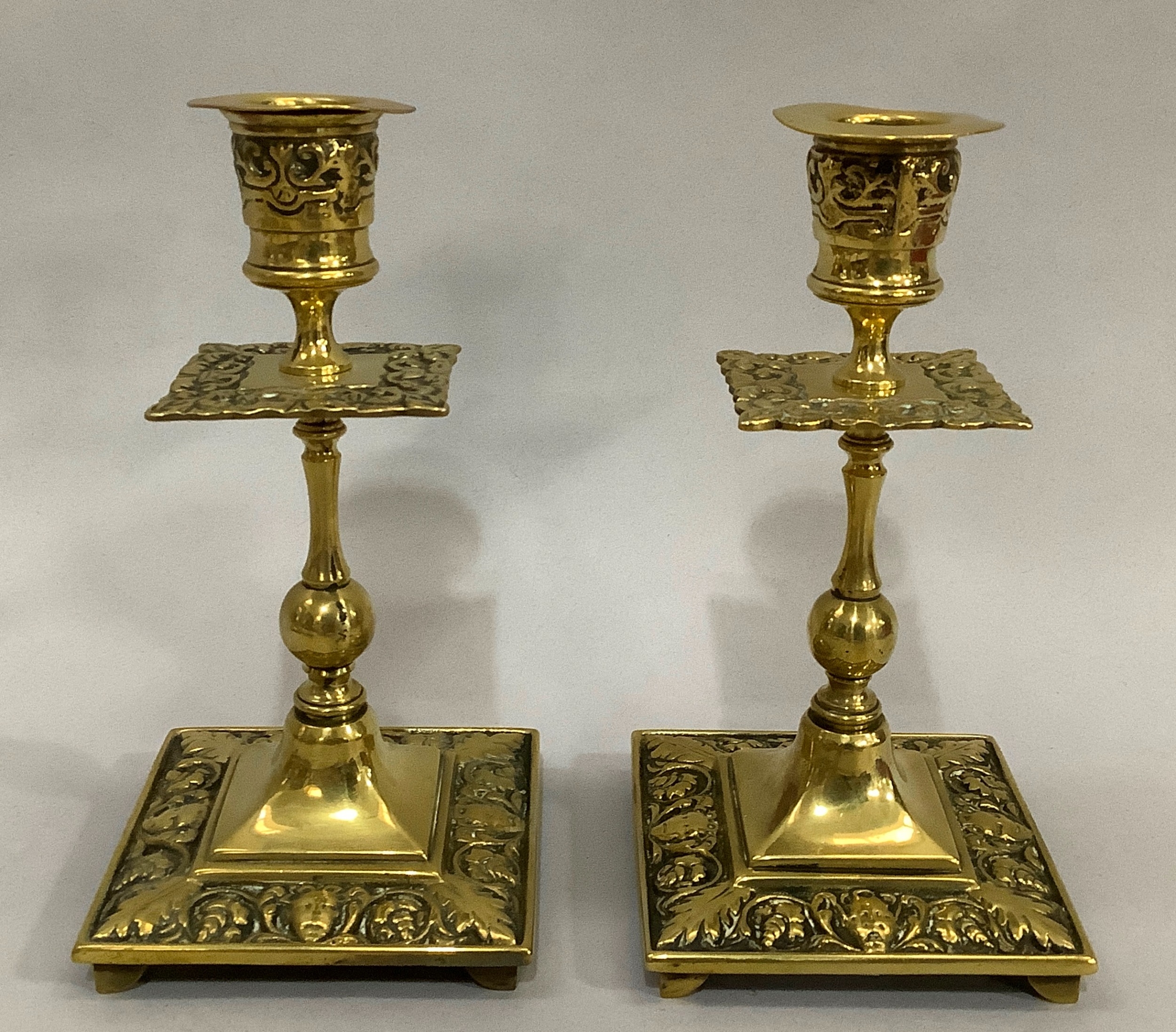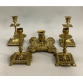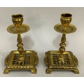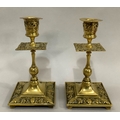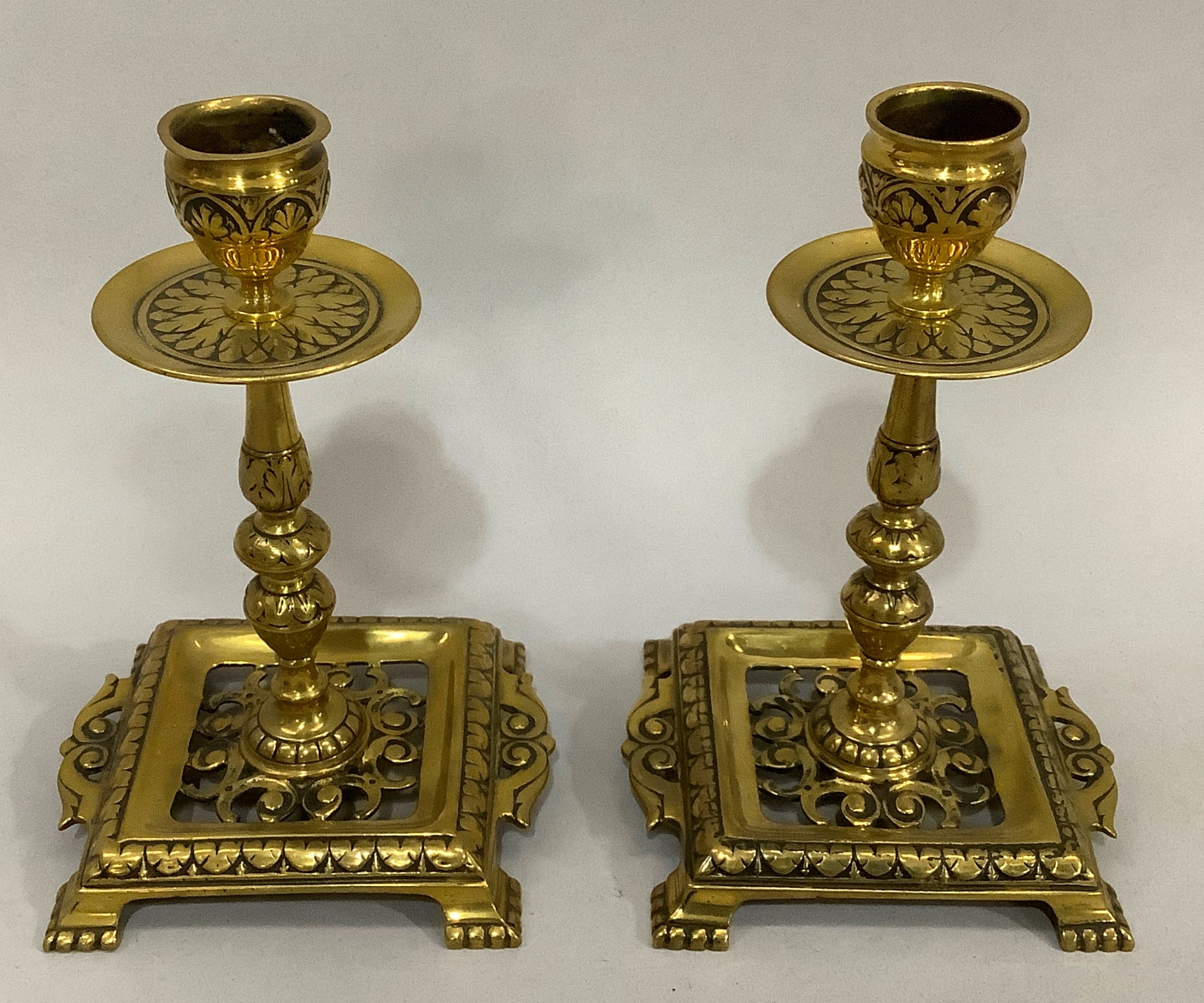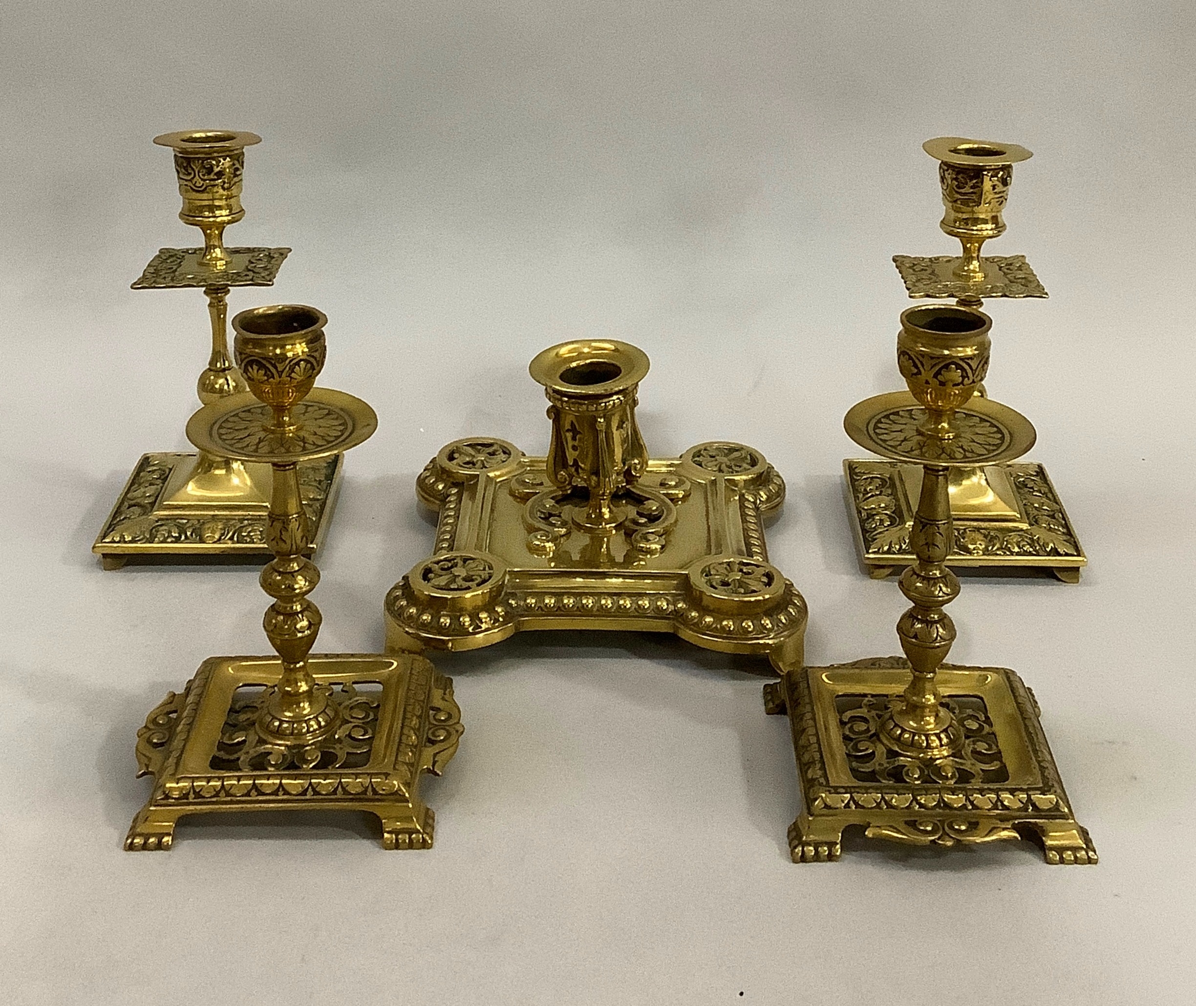 A Victorian brass chamber stick with pierced handle of square outline with rounded corners and beaded rim, together with two pairs of brass candlesticks , 16cm and 15.5cm high