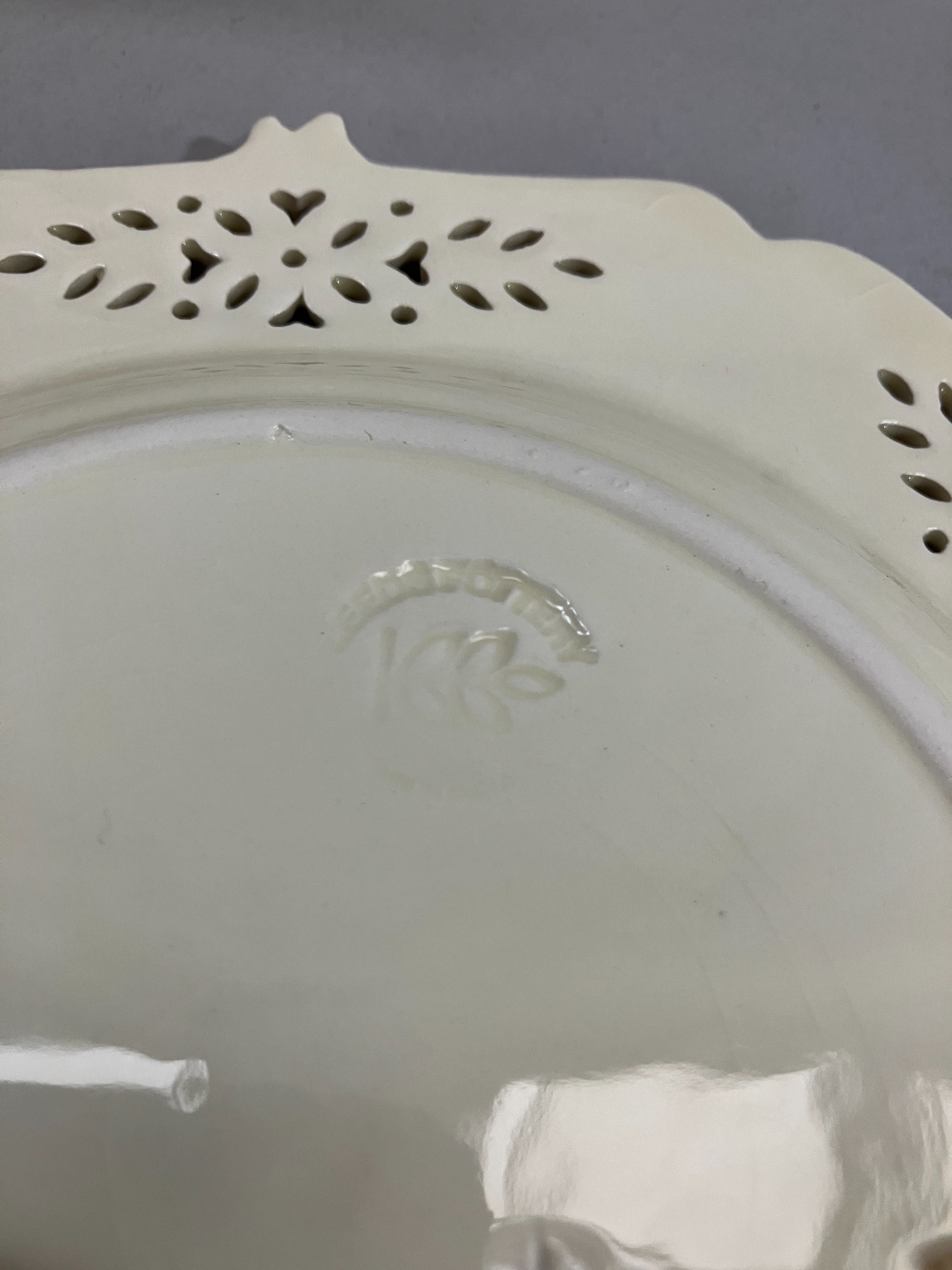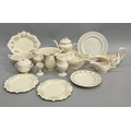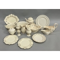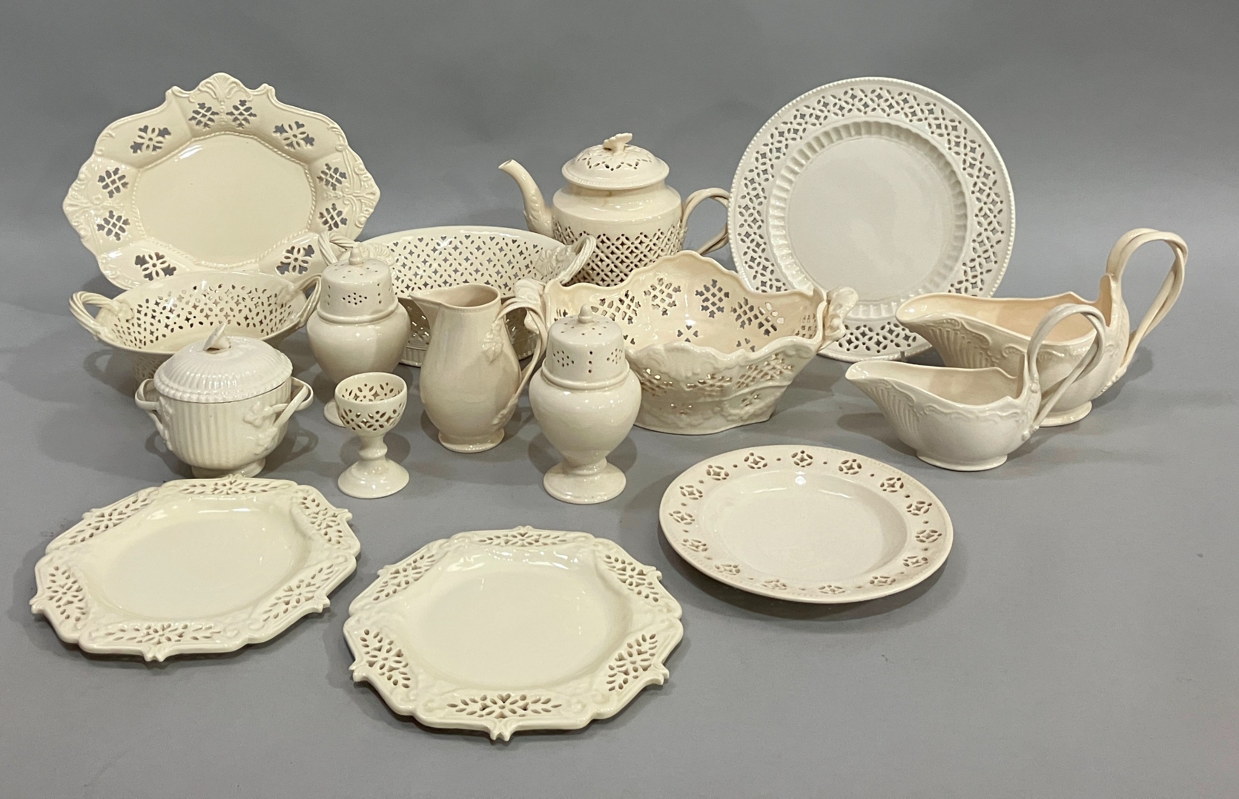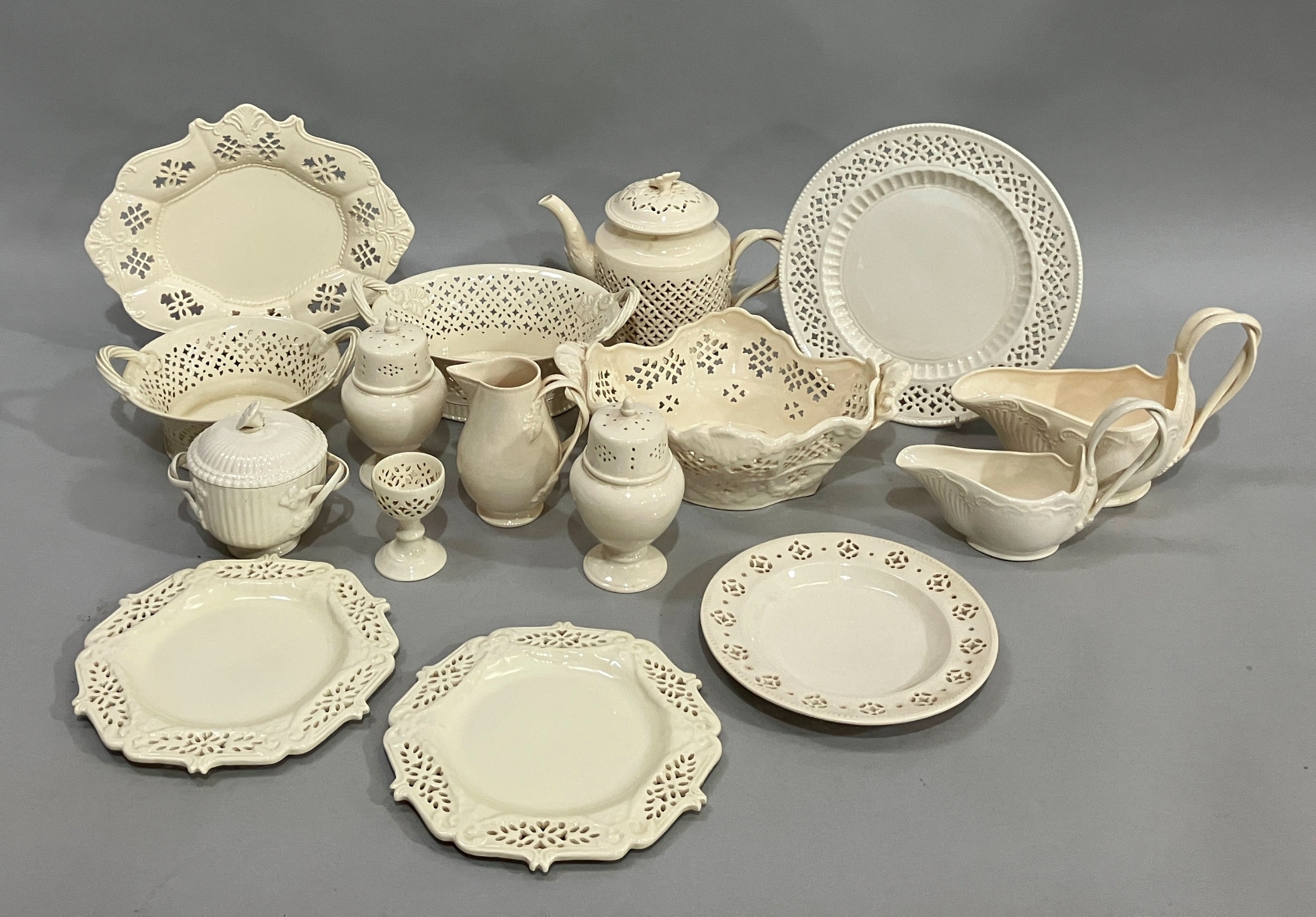 A collection of Leeds Pottery cream ware including two handled baskets, tea pot, sugar sifters, gravy boat, cream jug, two handled sugar bowl, basket plates, etc.