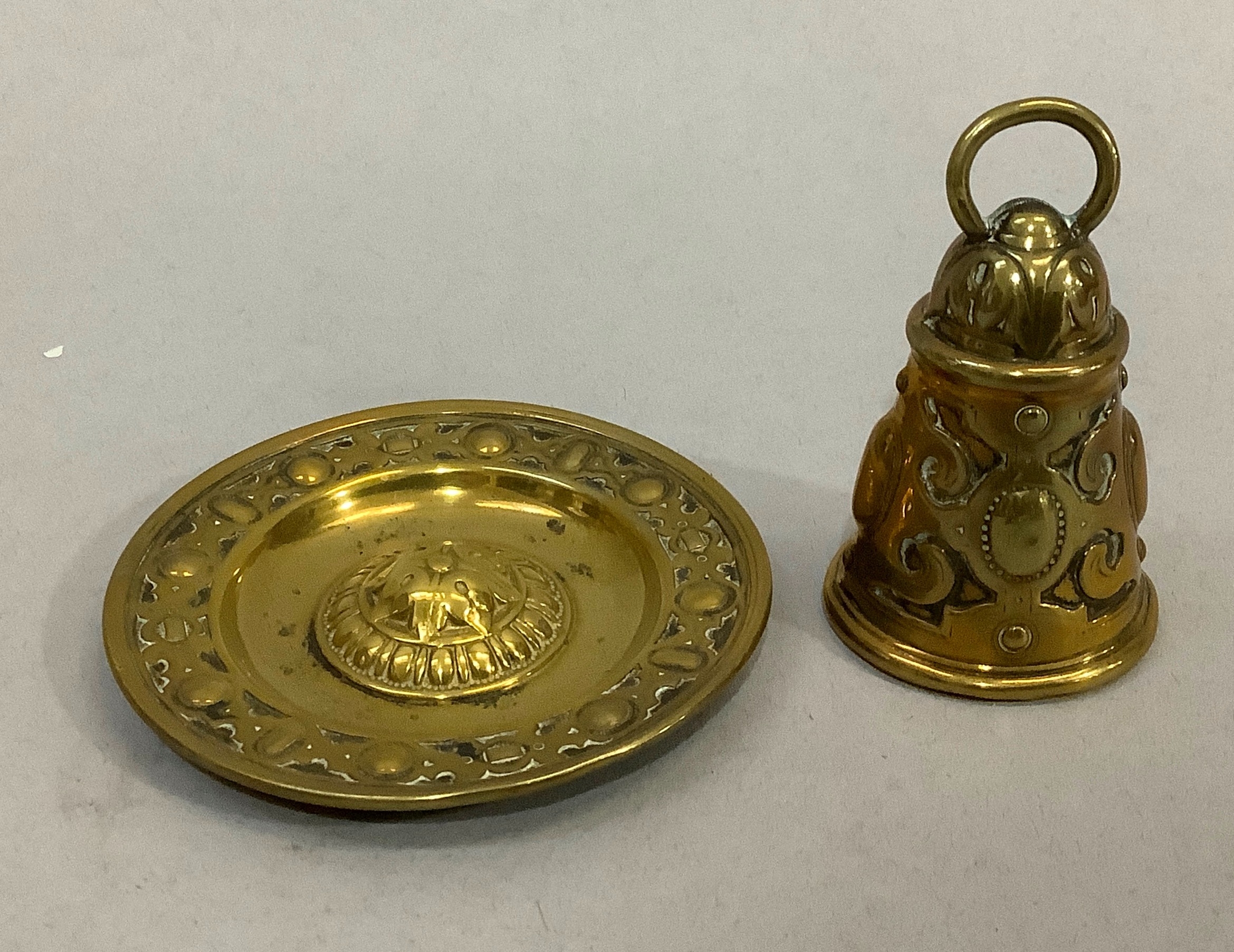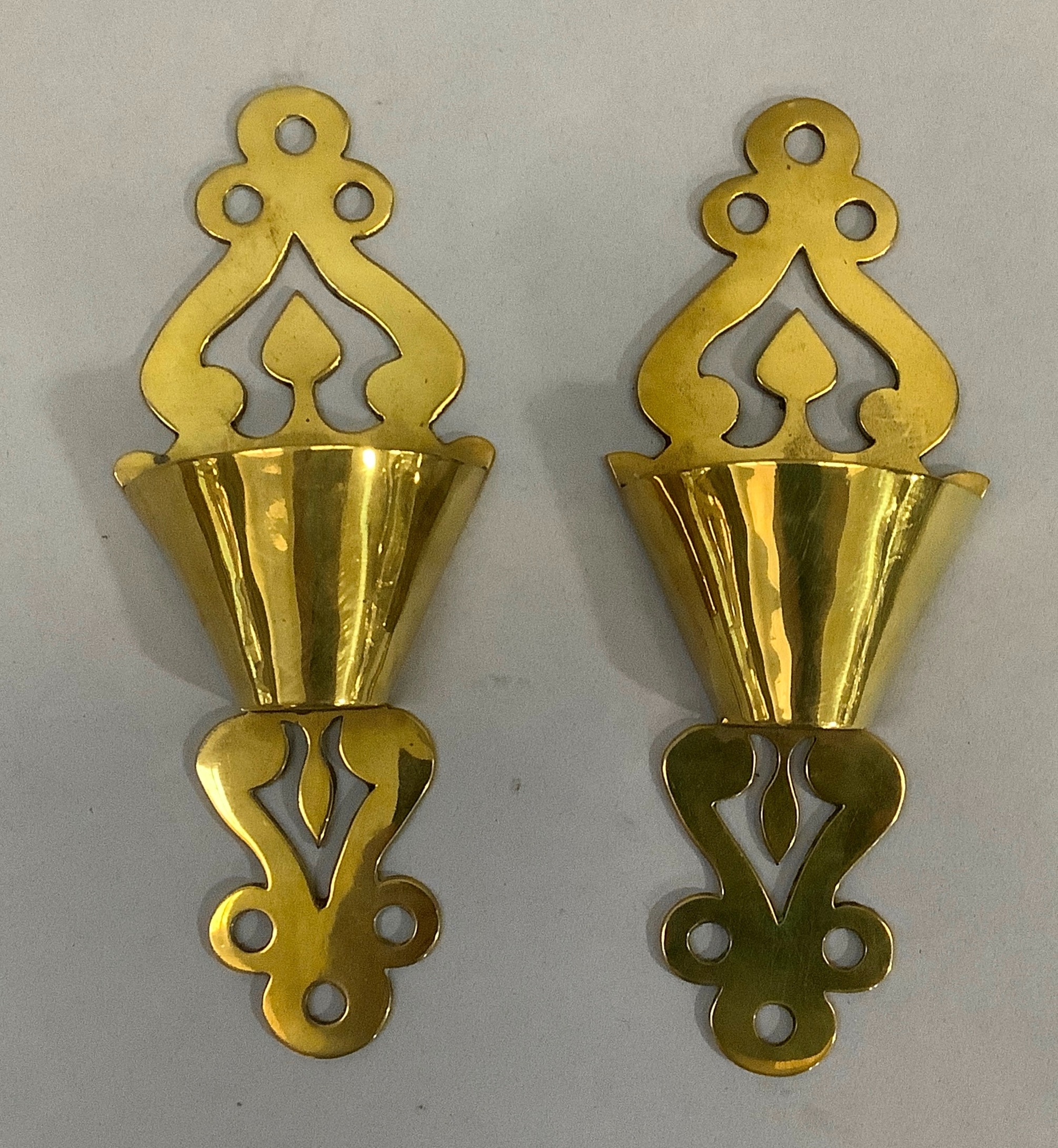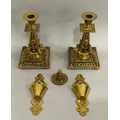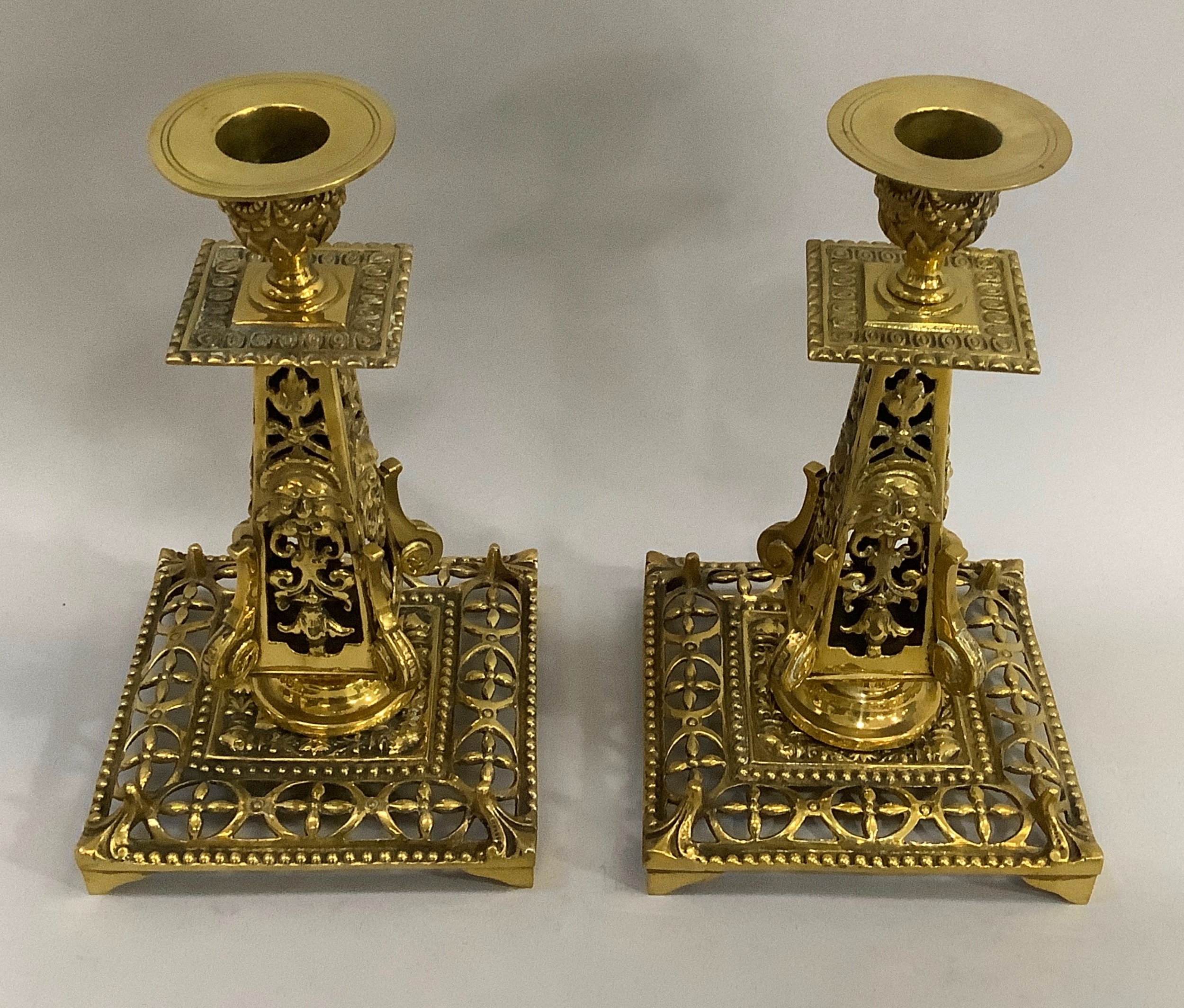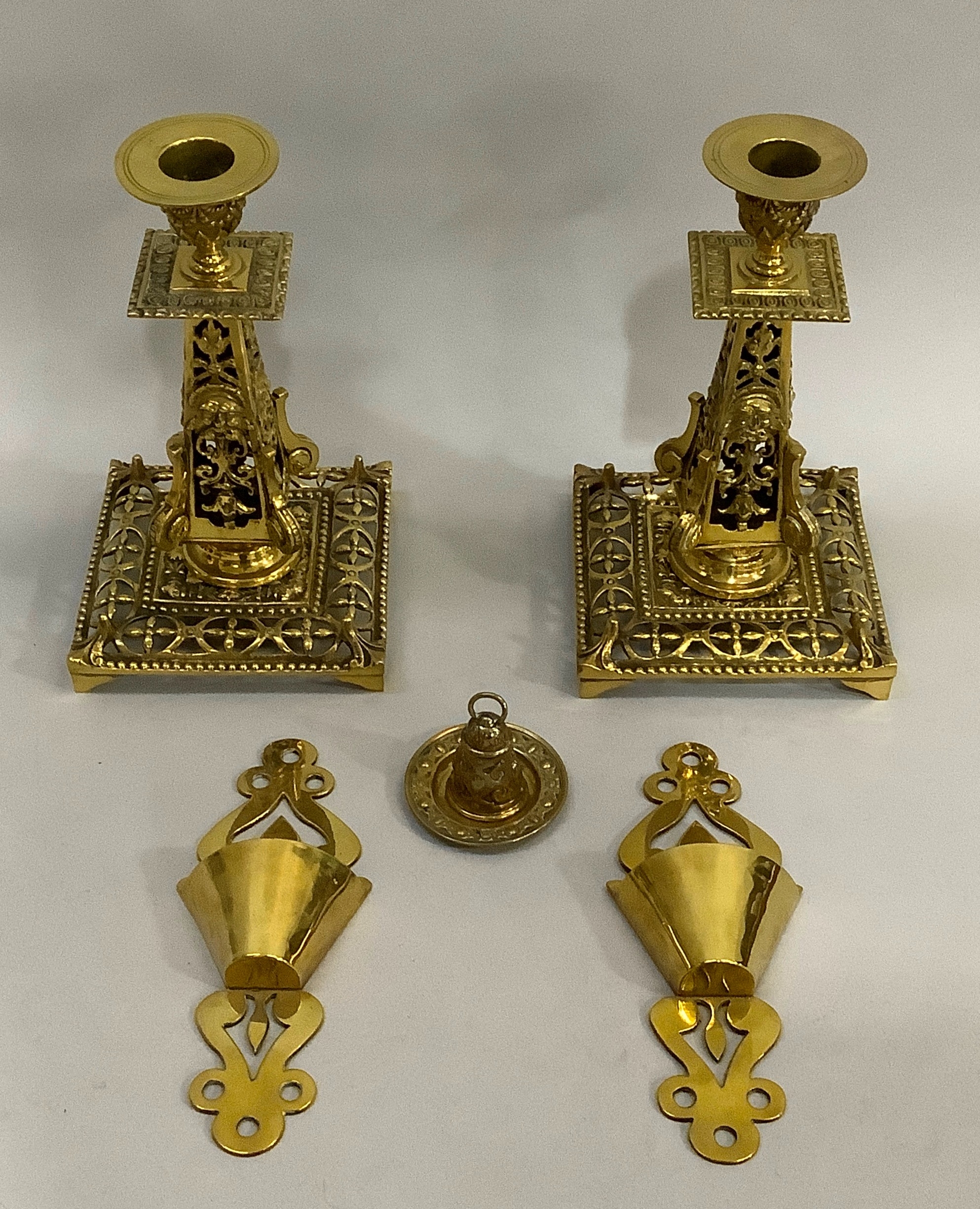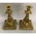 A pair of Victorian brass spill pockets 18.5cm high, together with a pair of brass candlesticks of pierced face mask and foliate decoration on square bases measuring 21.5cm