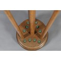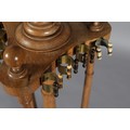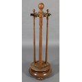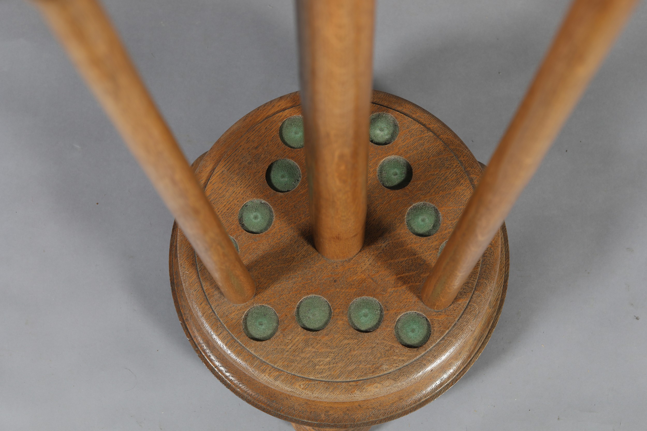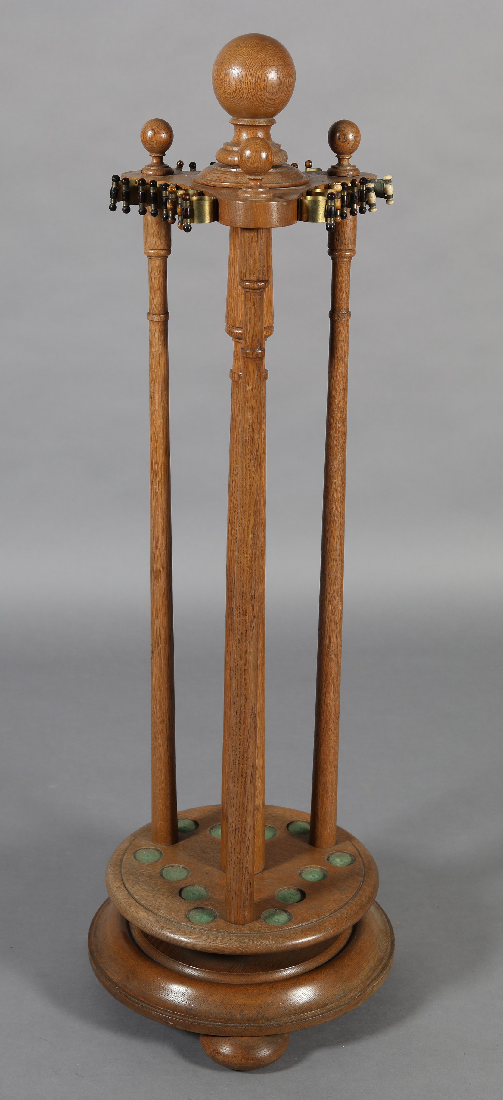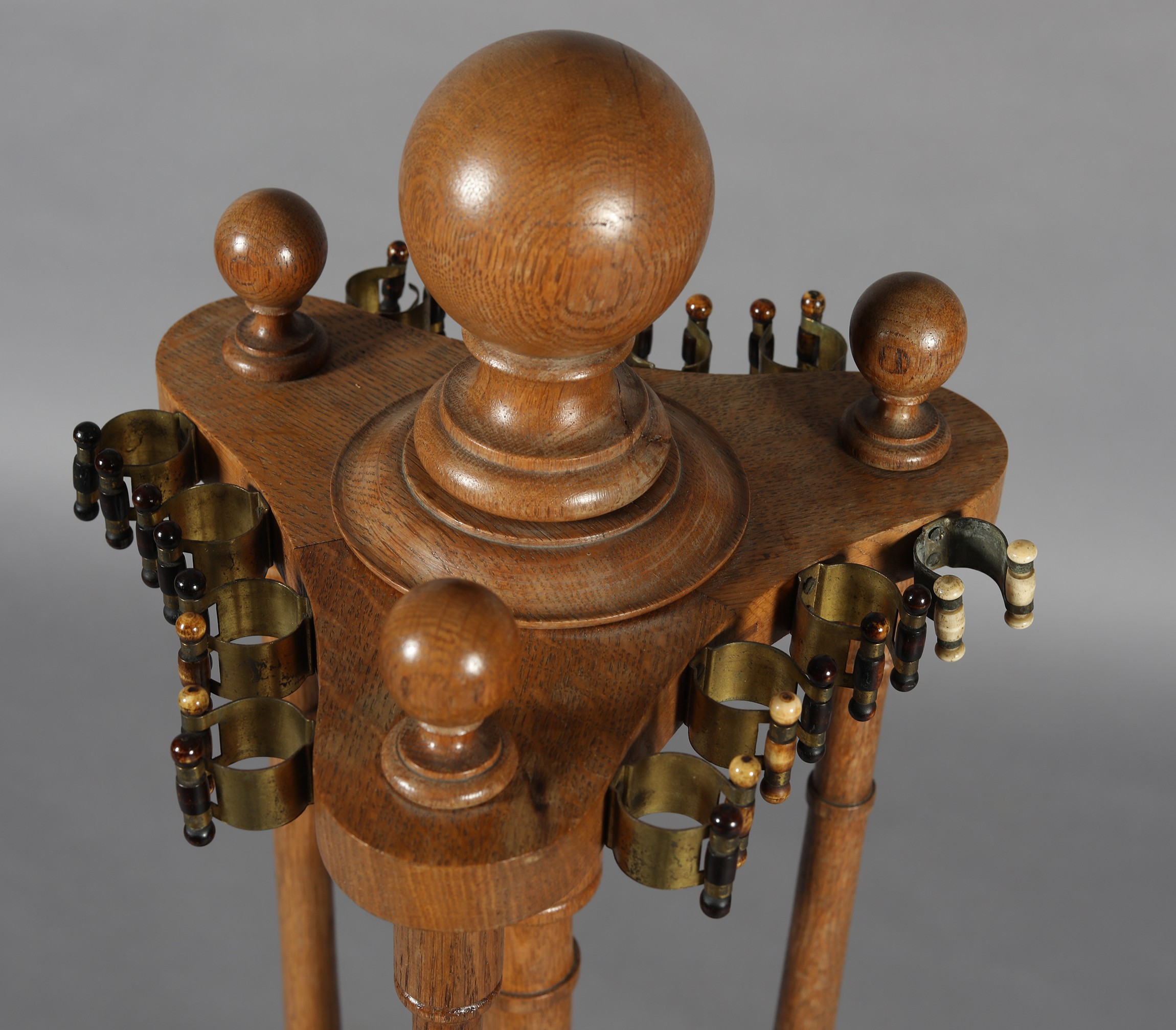 AN EARLY 20TH CENTURY OAK CUE RACK with ball finial, with gilt metal, stained and natural bone clips, turned uprights and revolving plinth on circular base with bun feet, 115.5cm high