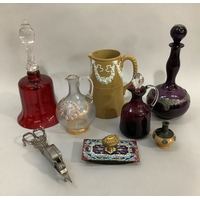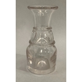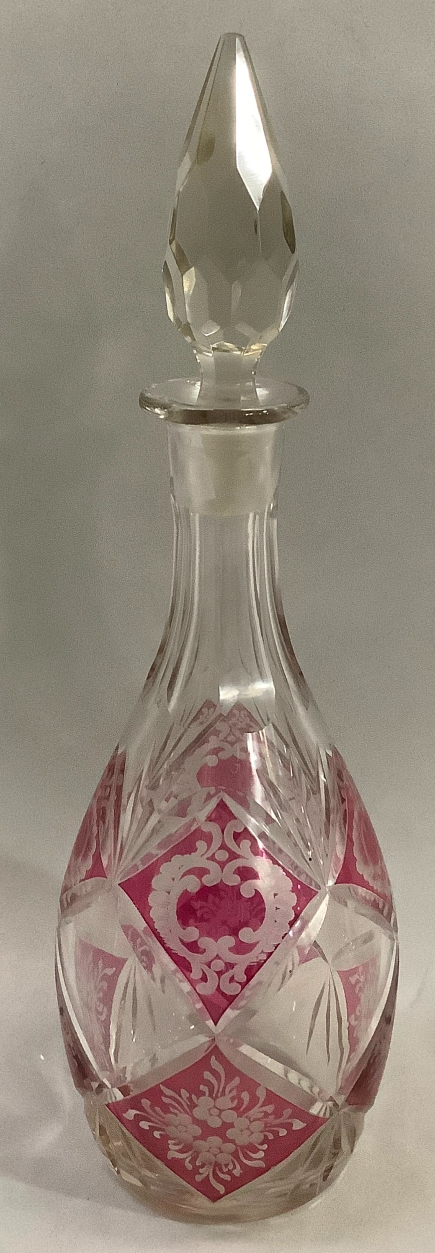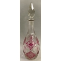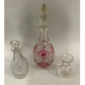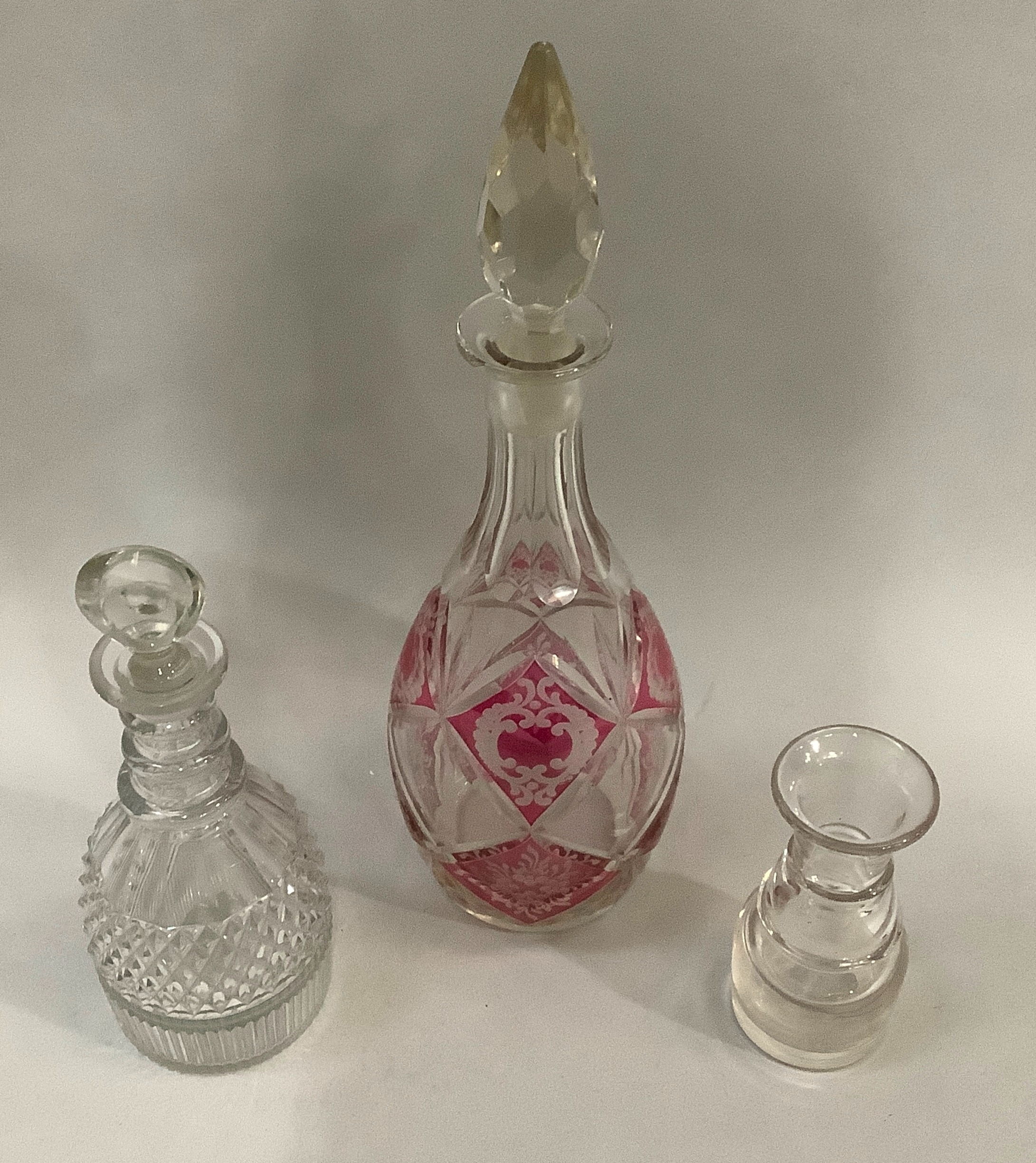 A ruby flashed and cut decanter with spire stopper, 37cm high together with a Georgian triple collar decanter with bullseye stopper, 23.5cm high and a ring turned carafe with smoothed pontil, 13.5cm high