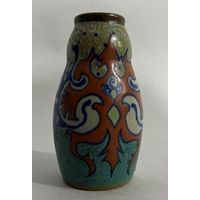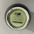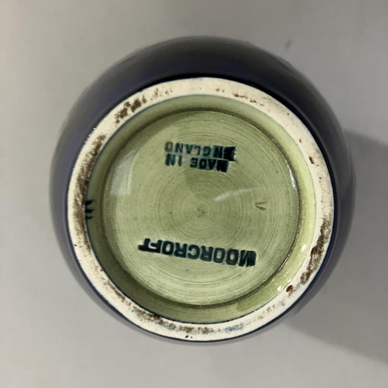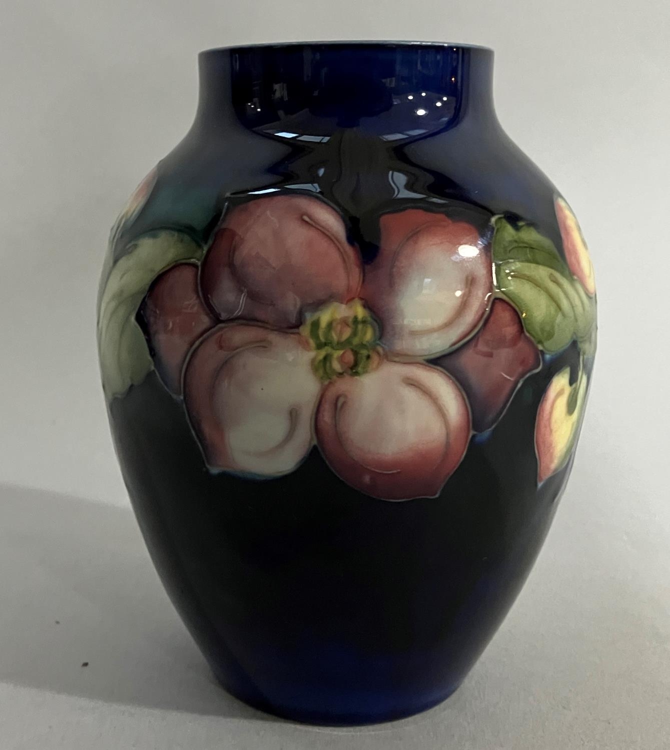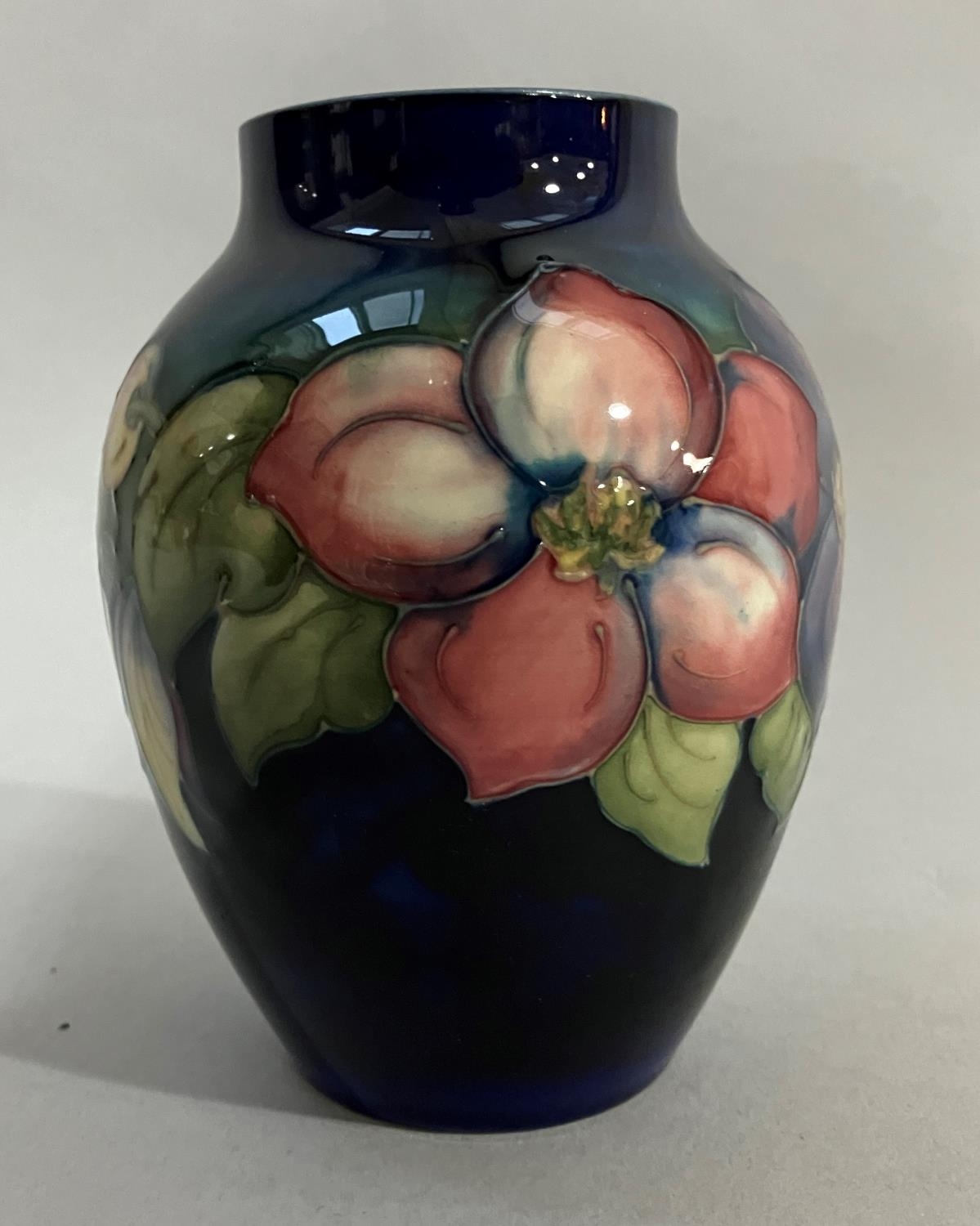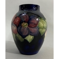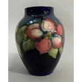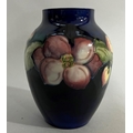 A Moorcroft vase, painted and tube lined with a band of clematis in mauve and green on a blue ground, impressed mark to underside Moorcroft Made in England, 12.5cm high