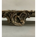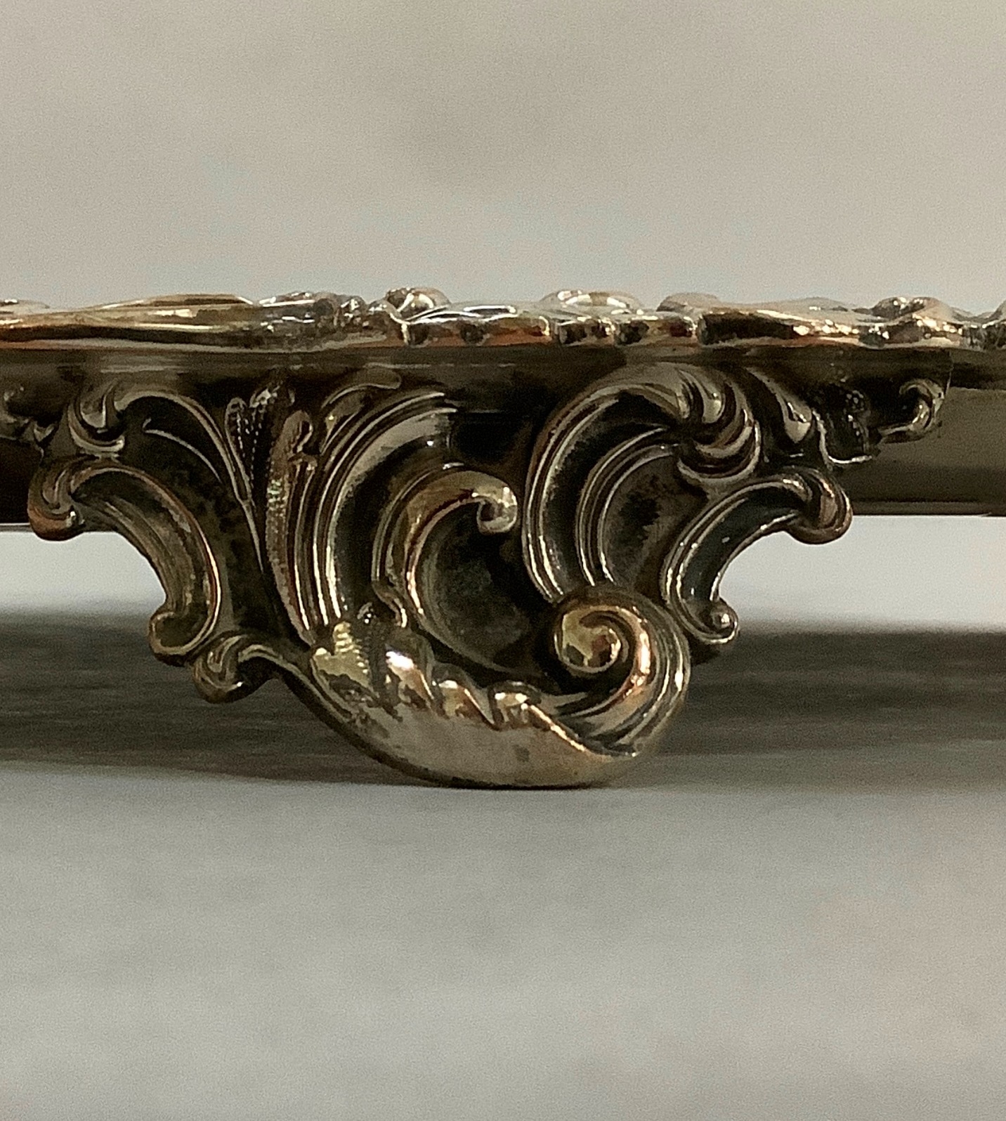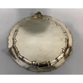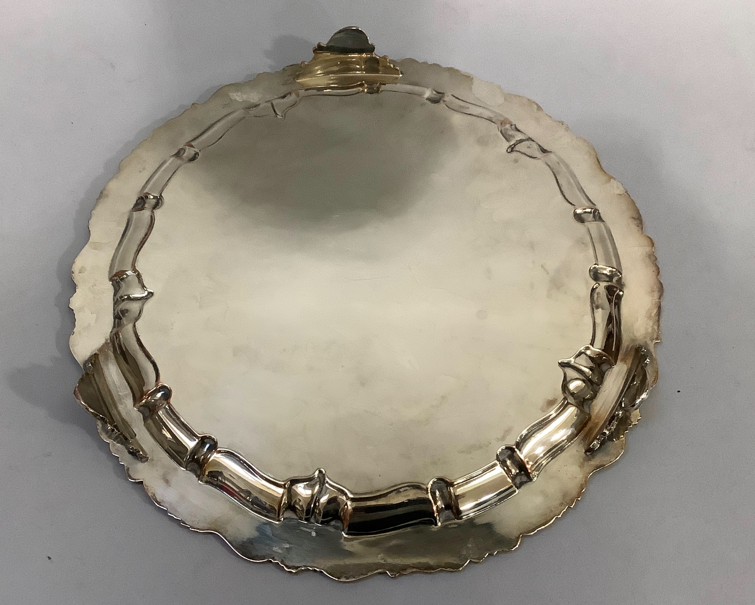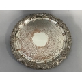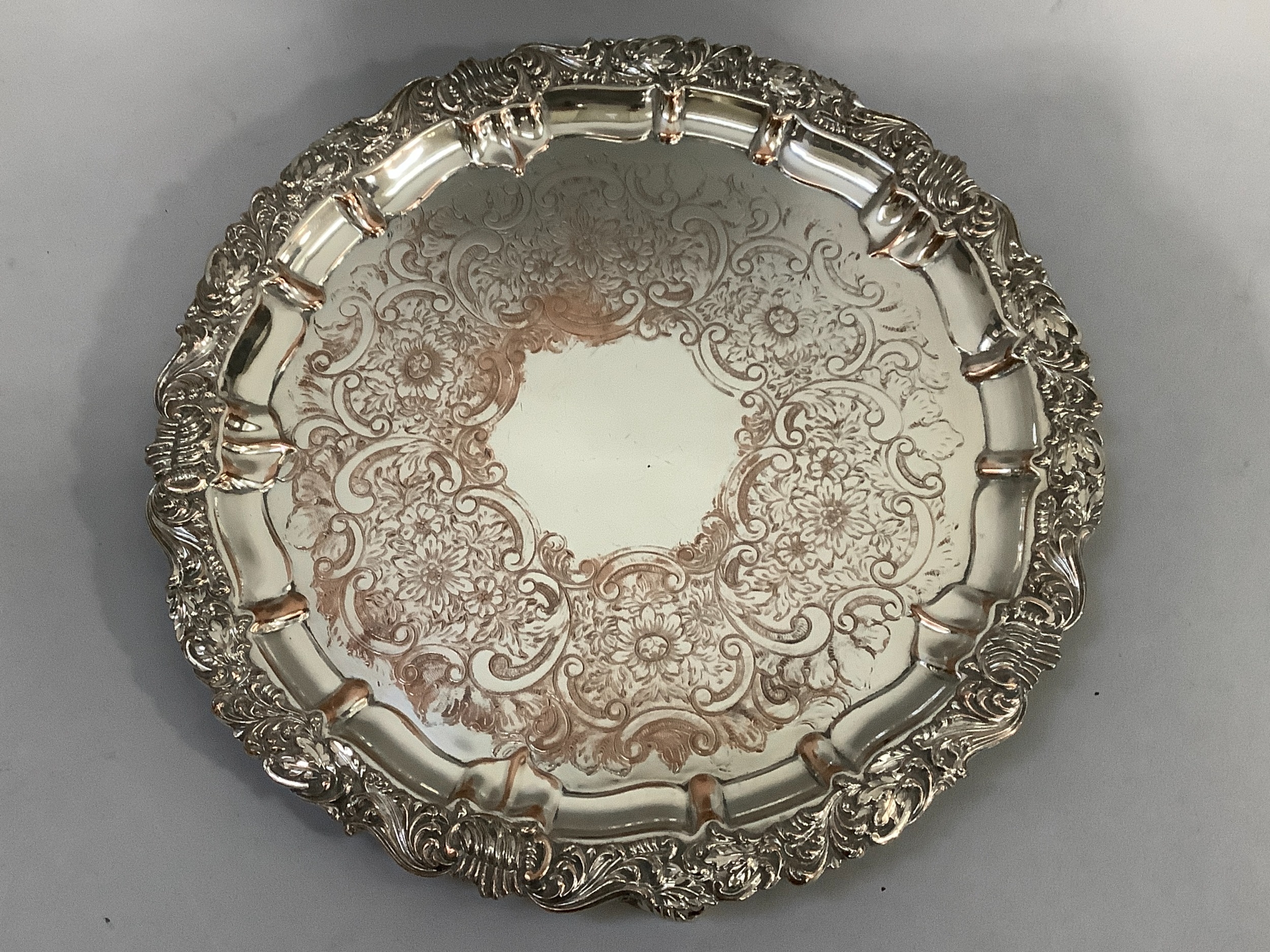 A large plated on copper circular salver, having a pie crust and foliate cast border, the surface chased with flowers and 'c' scrolls on three foliate feet, 35.5cm diameter