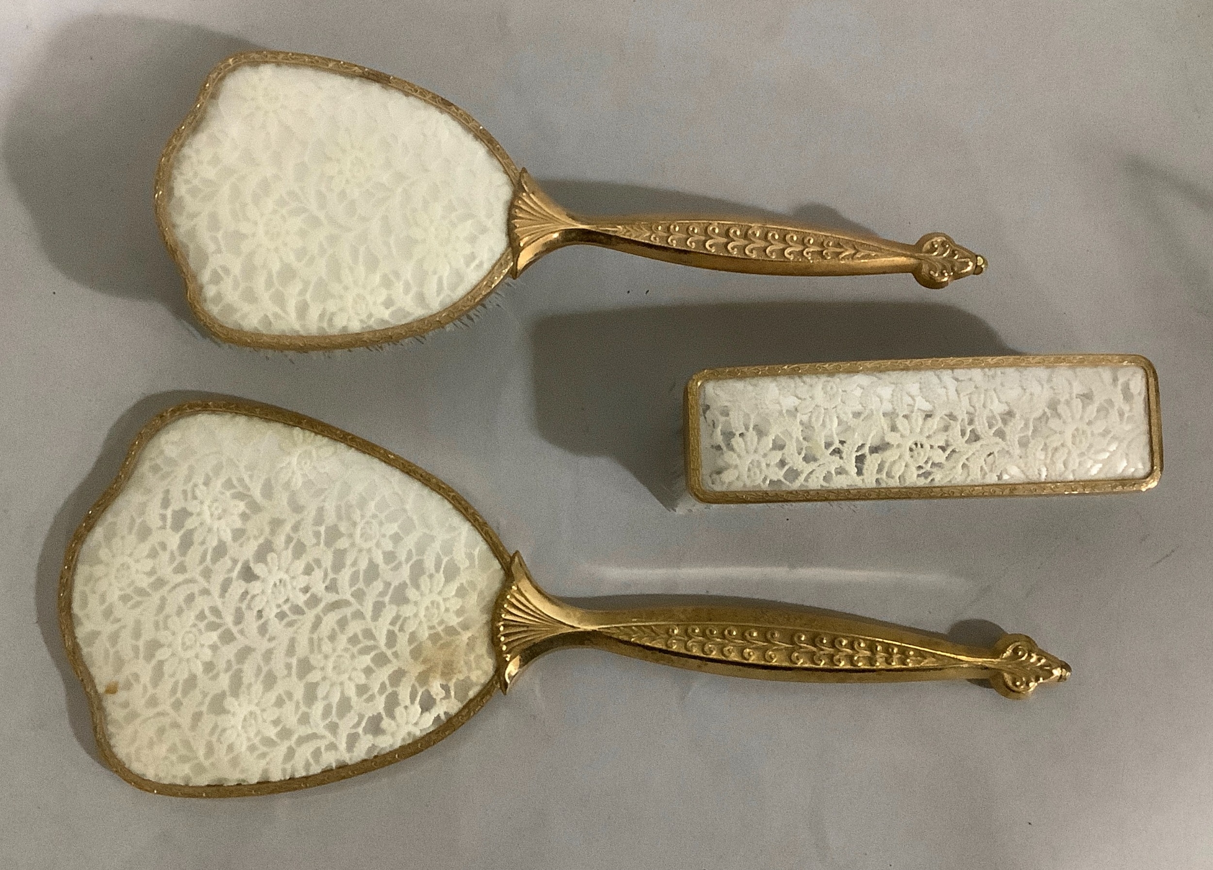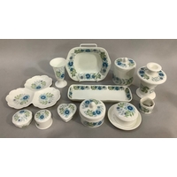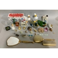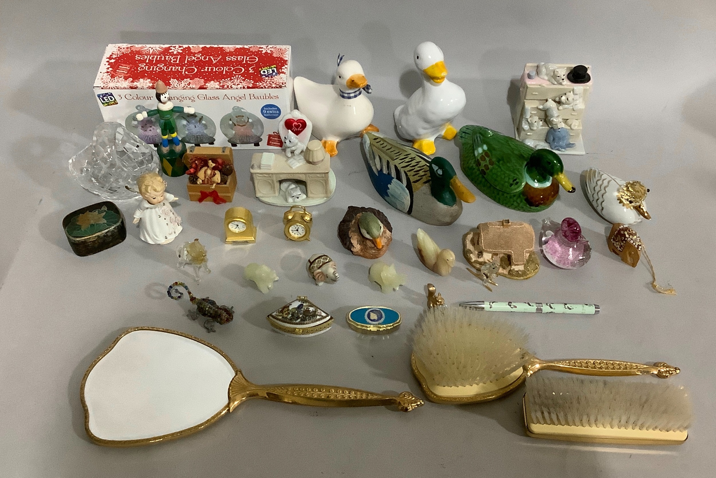 Mixed ornaments including ducks, angel, cut glass basket, dressing table set, model of puppies falling out of chest of drawers, miniature cottage, glass animals, trinket boxes etc.