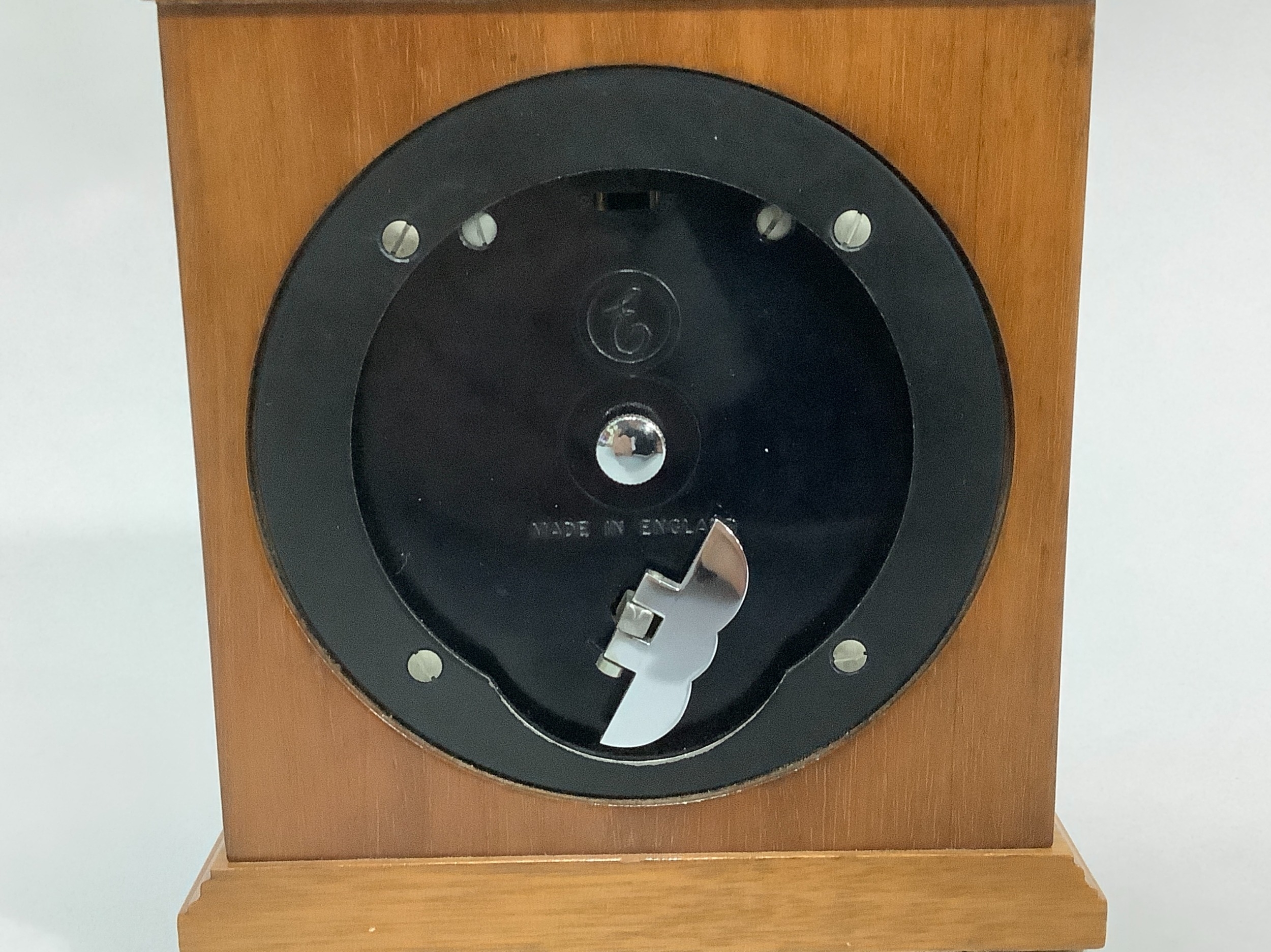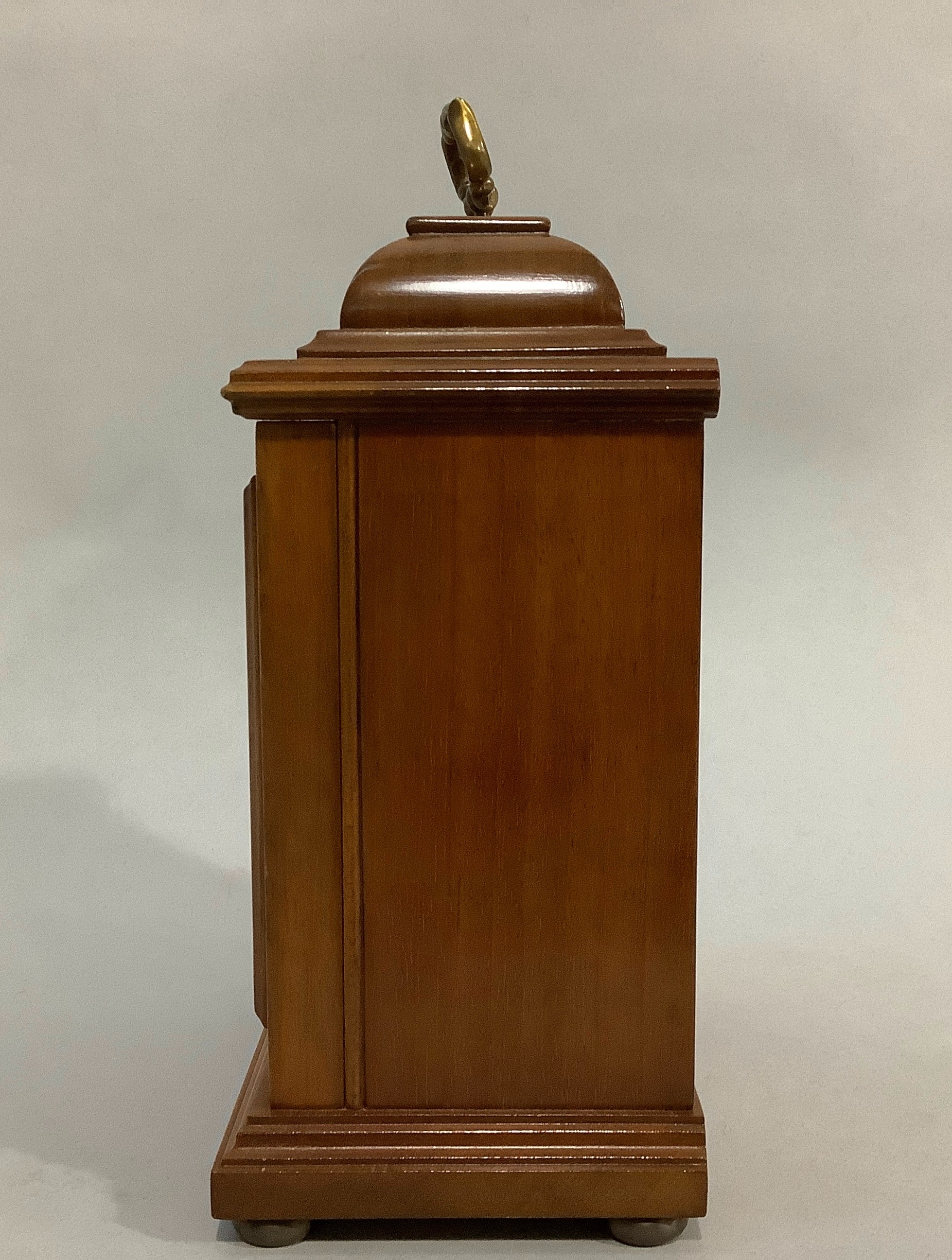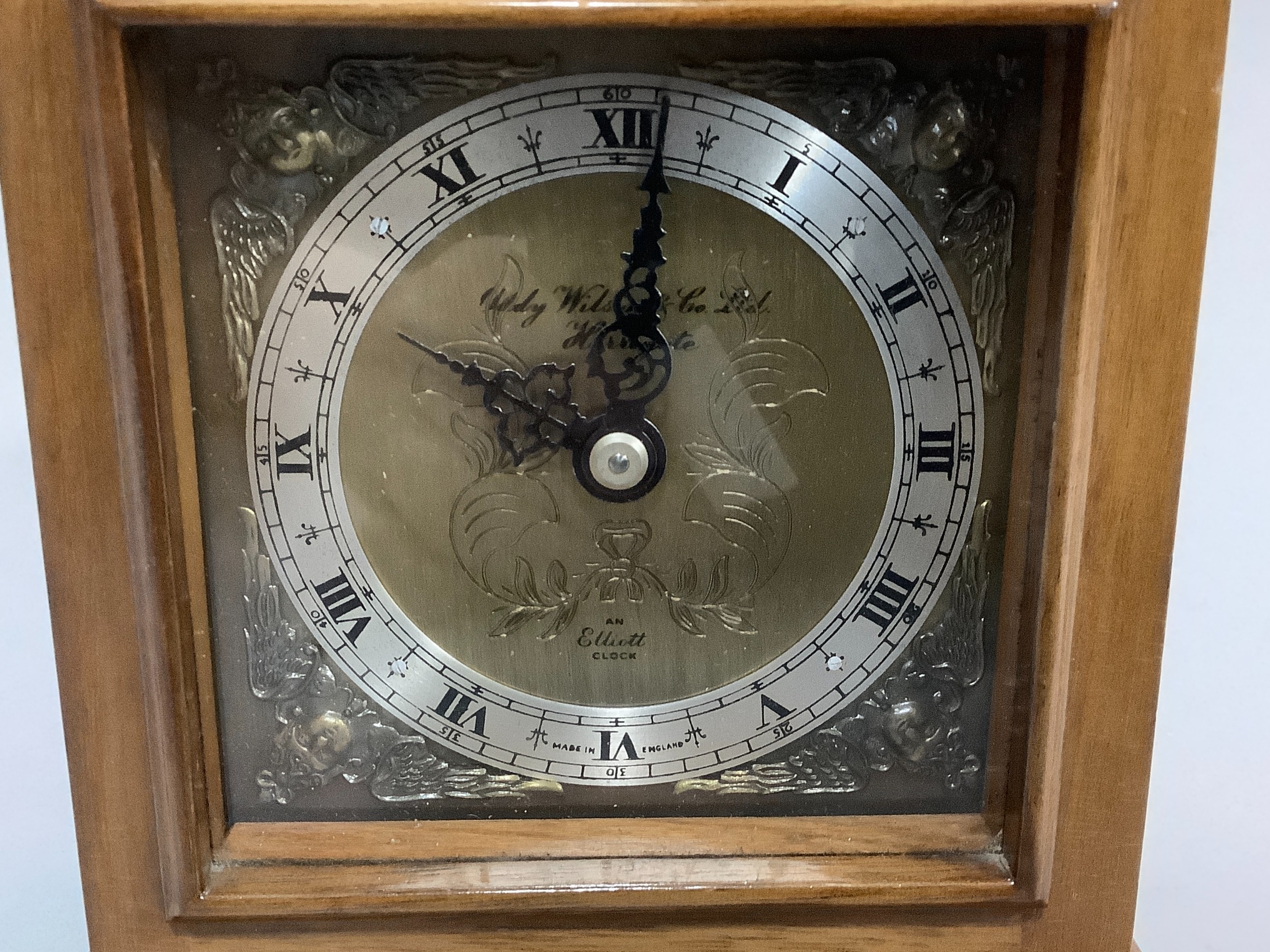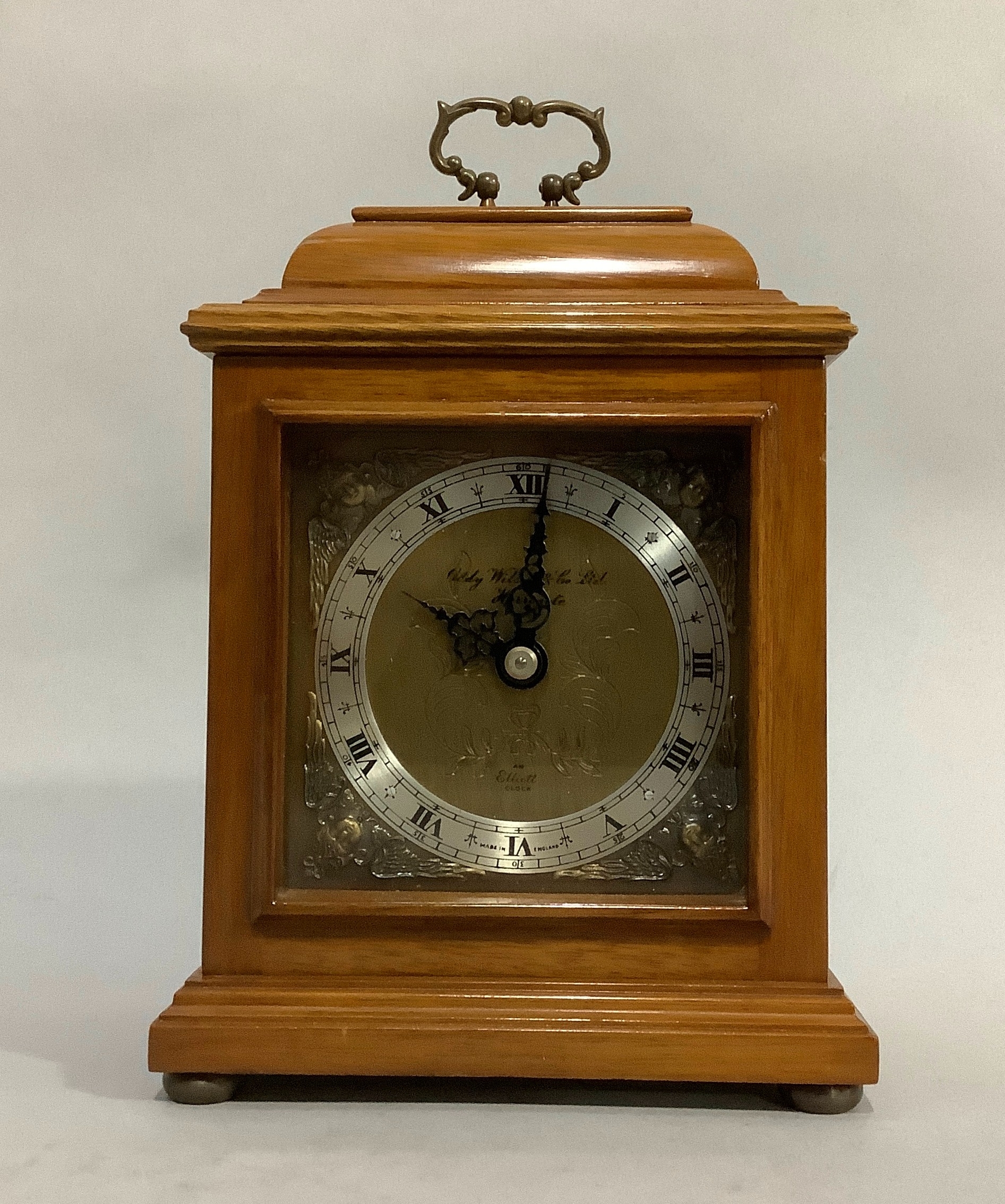 An Elliott mantel clock in mahogany case with carrying handle, 20cm high