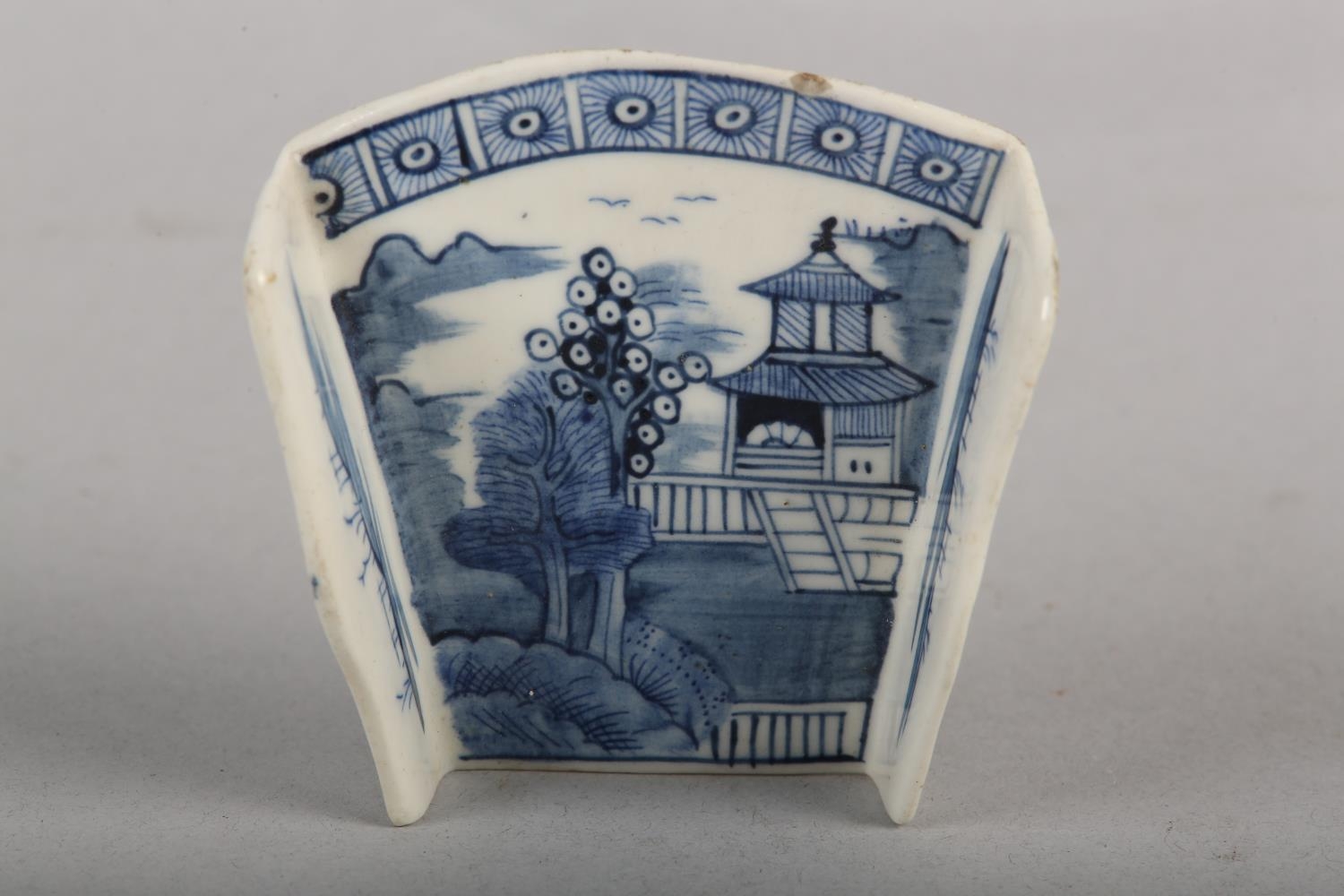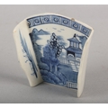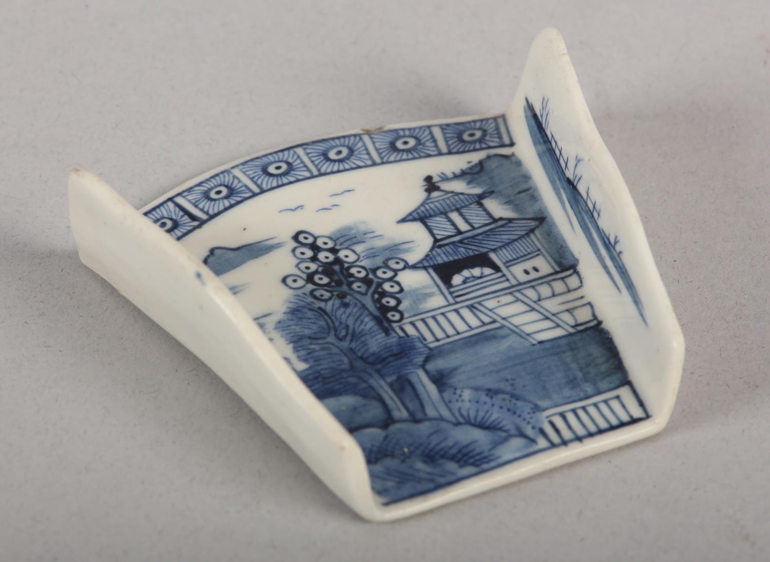 AN 18TH CENTURY DERBY BLUE AND WHITE PORCELAIN ASPARAGUS SERVER, c.1775, painted in underglaze blue with the Pagoda pattern, unmarked, 7cm long x 6.5cm wide max