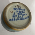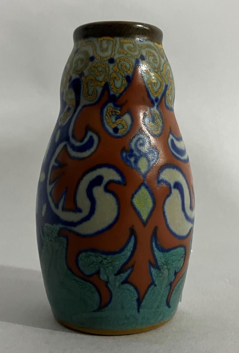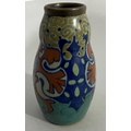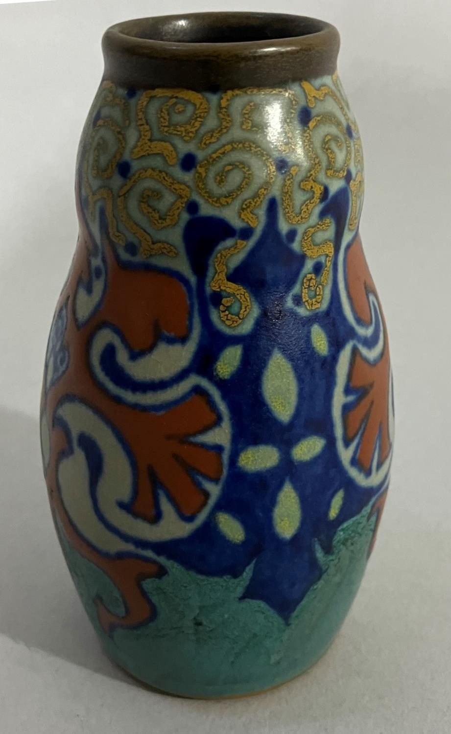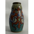 A Westland Gouda vase no. 1564, glazed in turquoise, iron red, blue and amber, painted mark to underside, 11cm high
