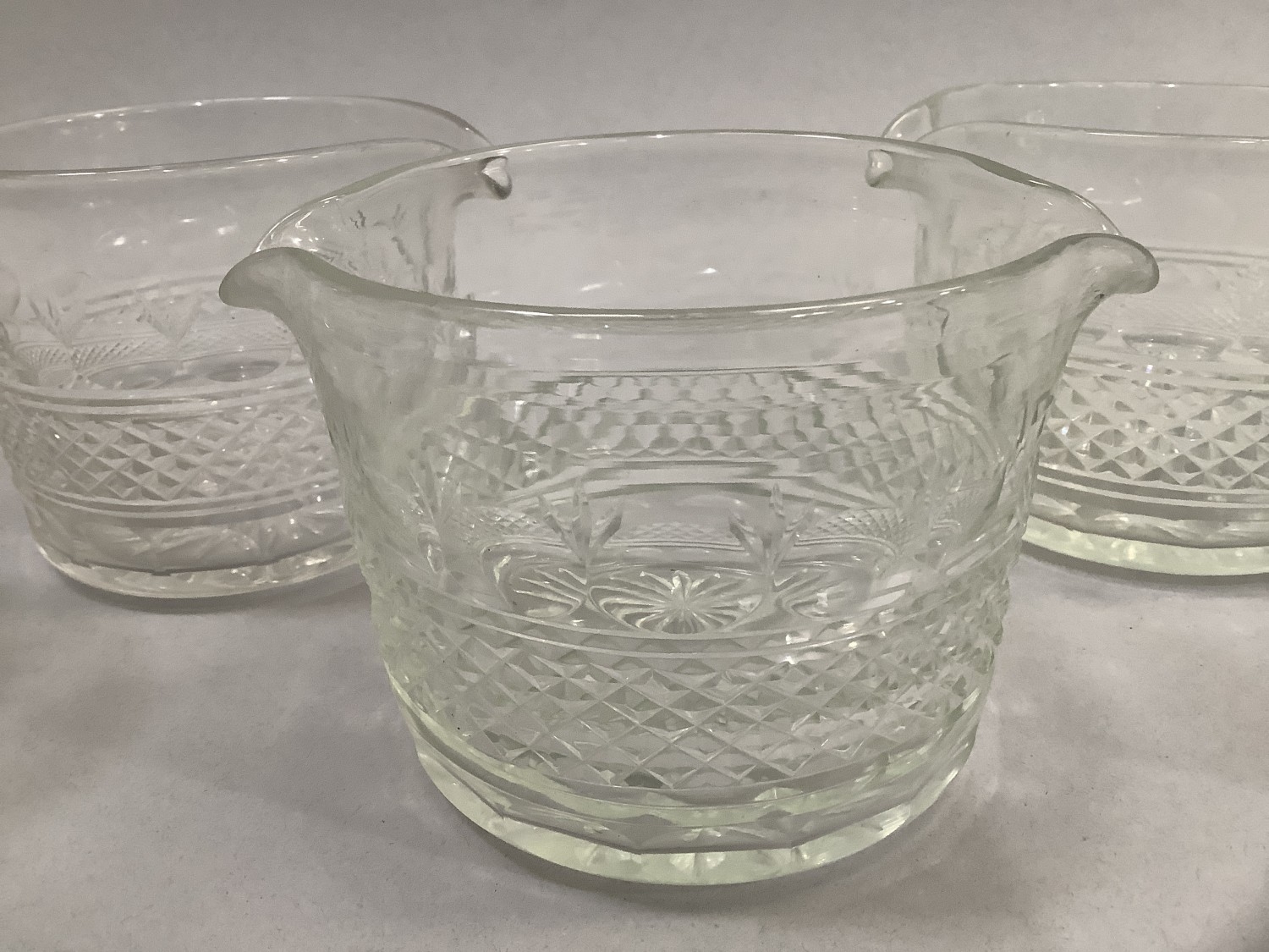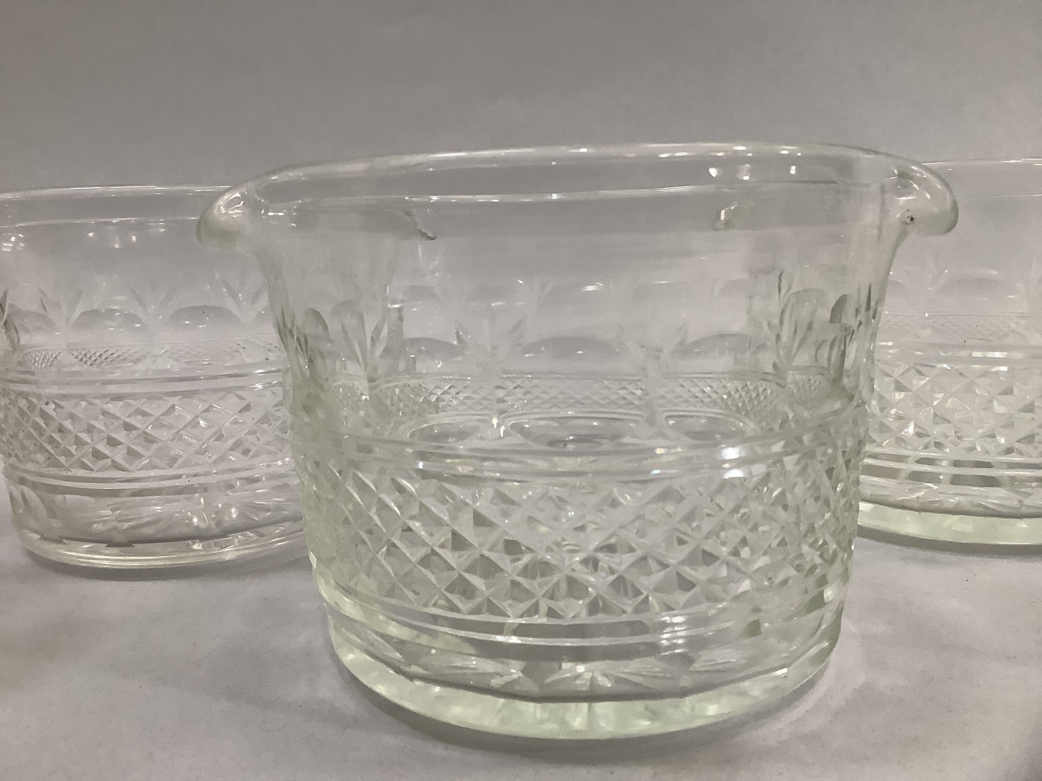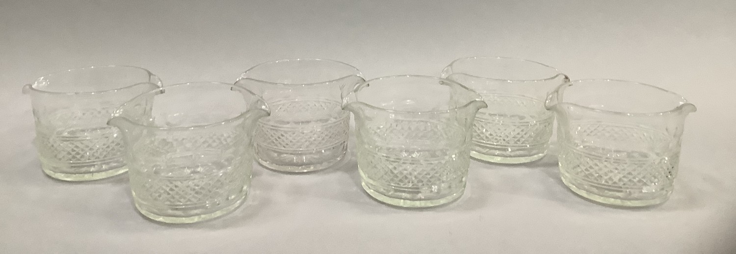 A SET OF SIX 19TH CENTURY WINE GLASS RINSERS, with a diamond cut band within borders of oval slice cut, 11.5cm diameter x 9.5cm high