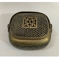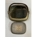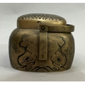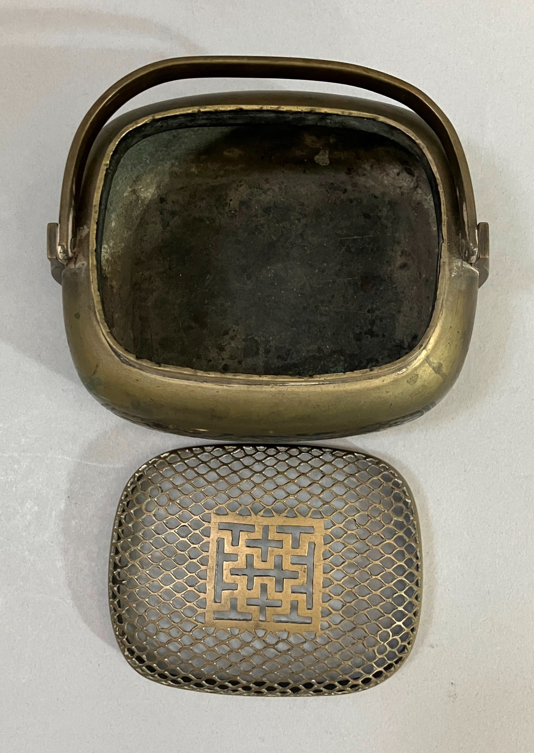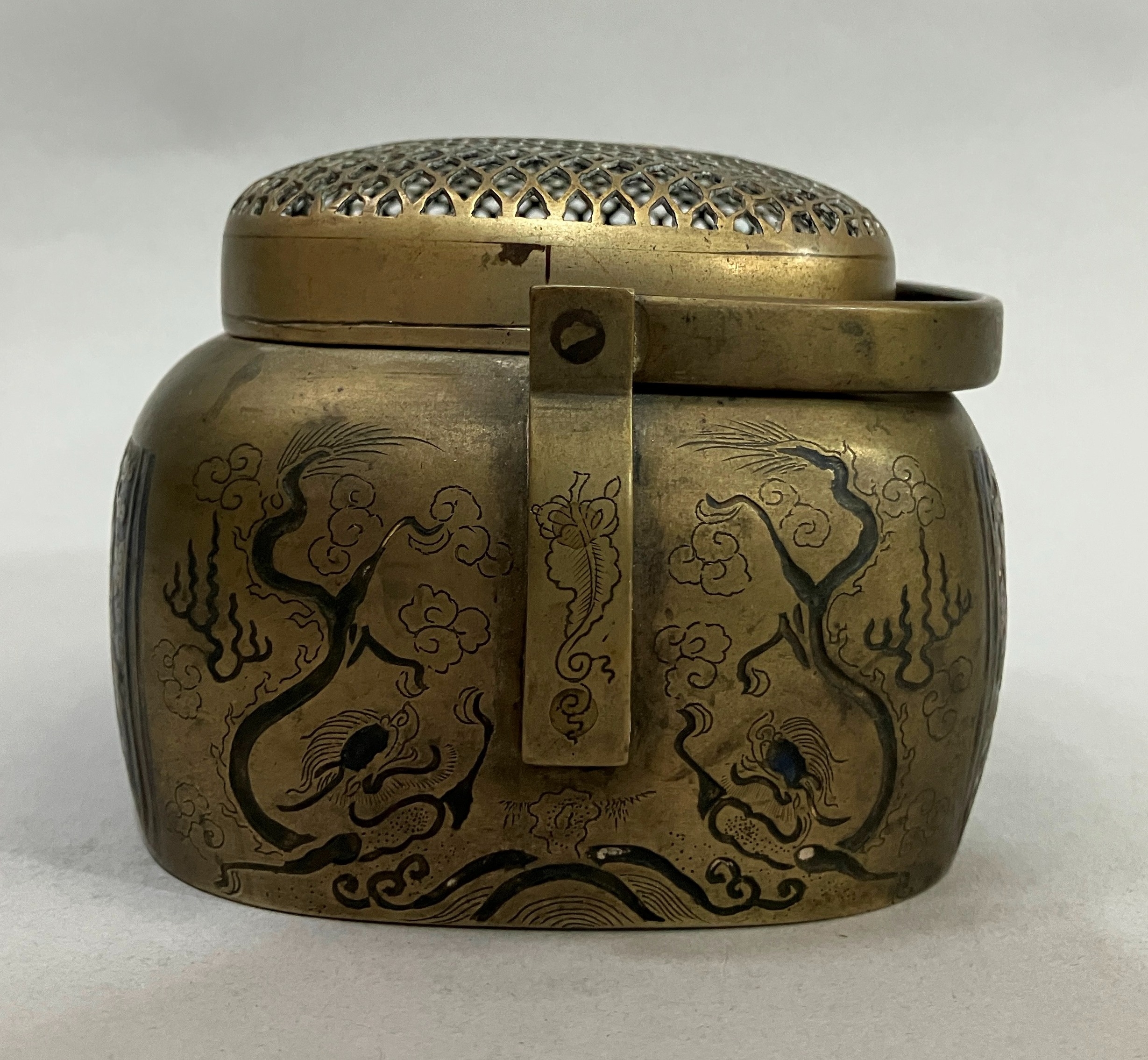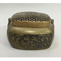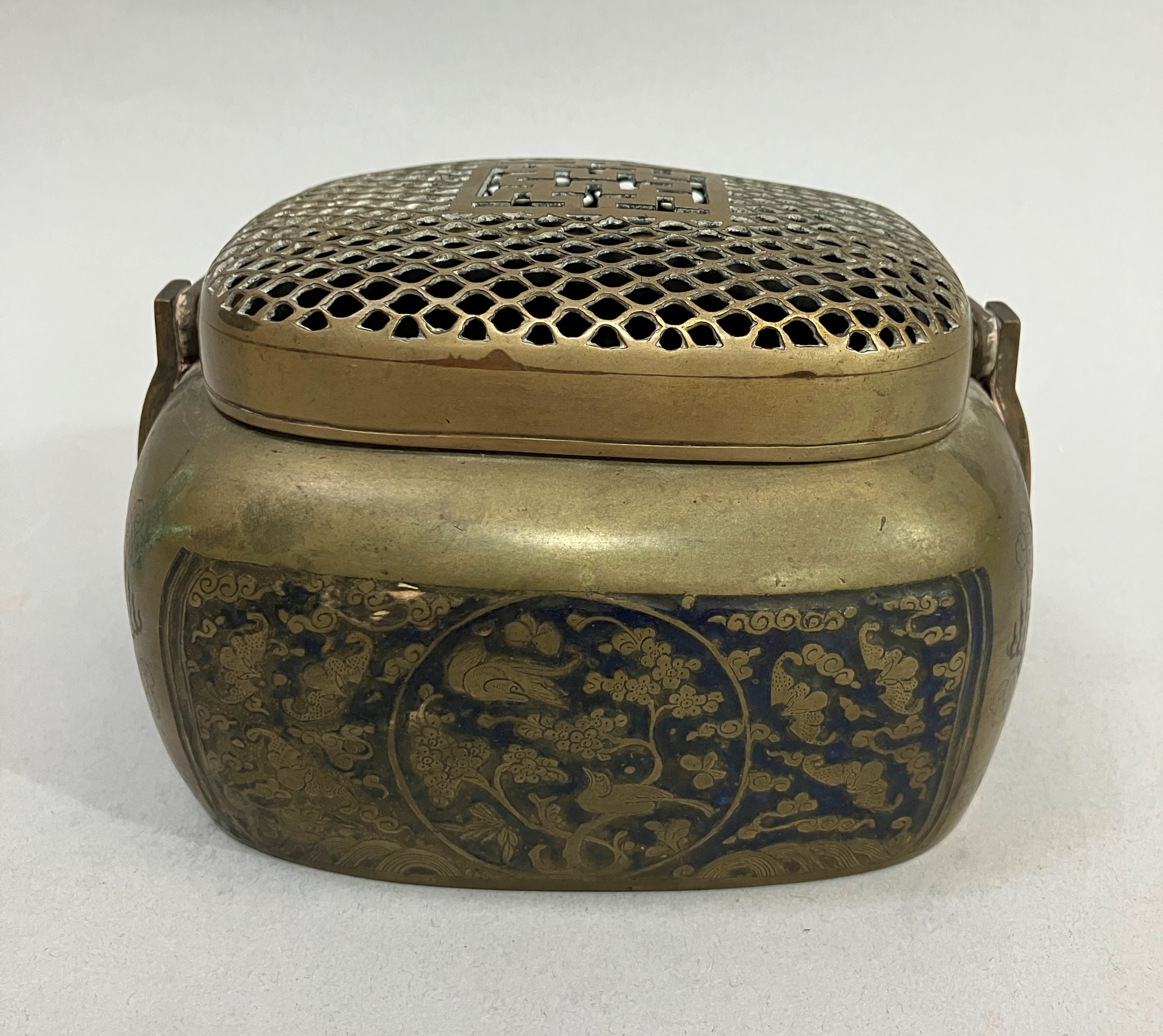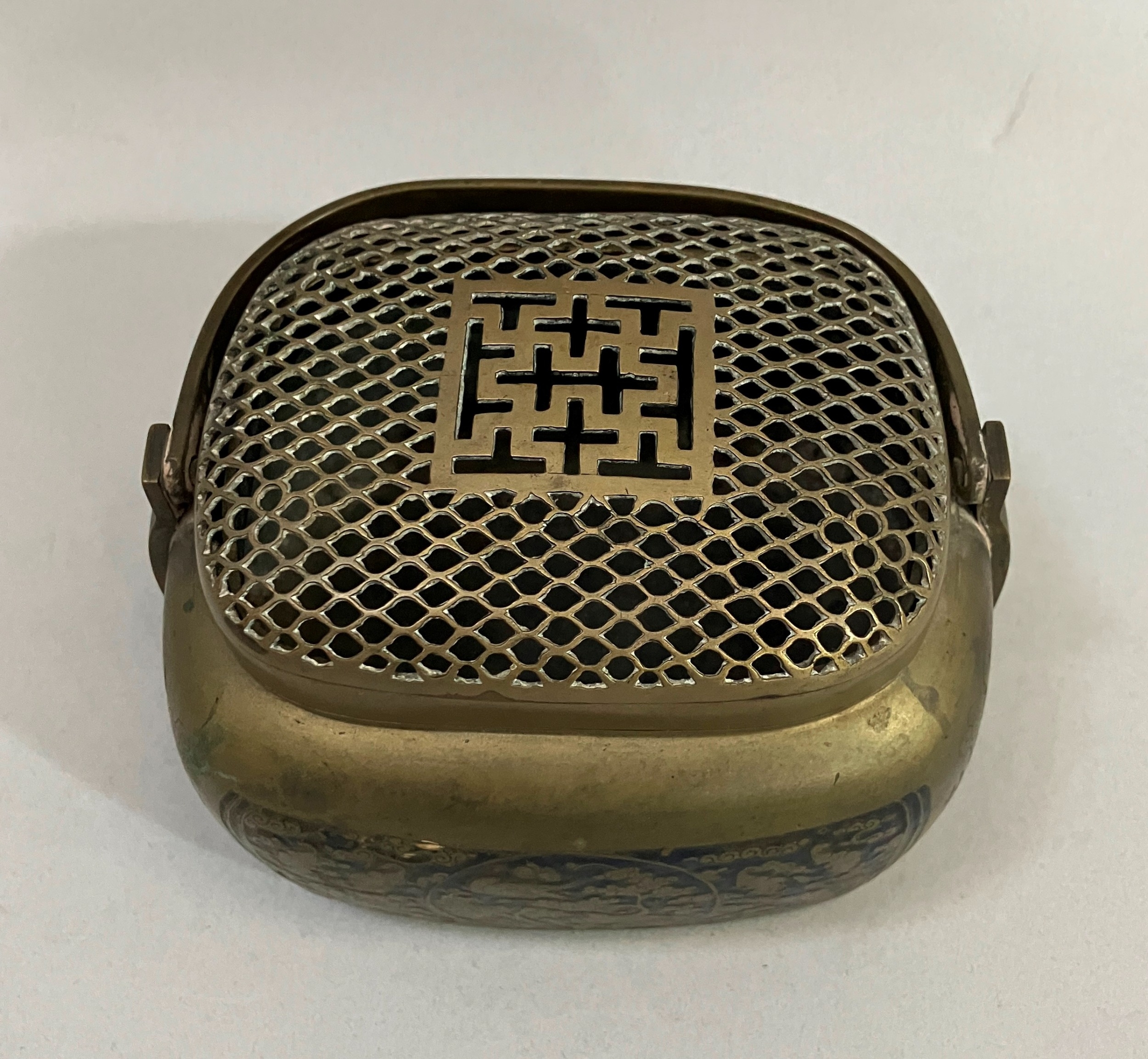 A early 20th century Chinese metal handwarmer with swing handle mesh cover the body chased and blue enamelled with birds perched in blossom trees, bats and other emblems, 13.5cm x 11cm x 13cm over handle