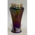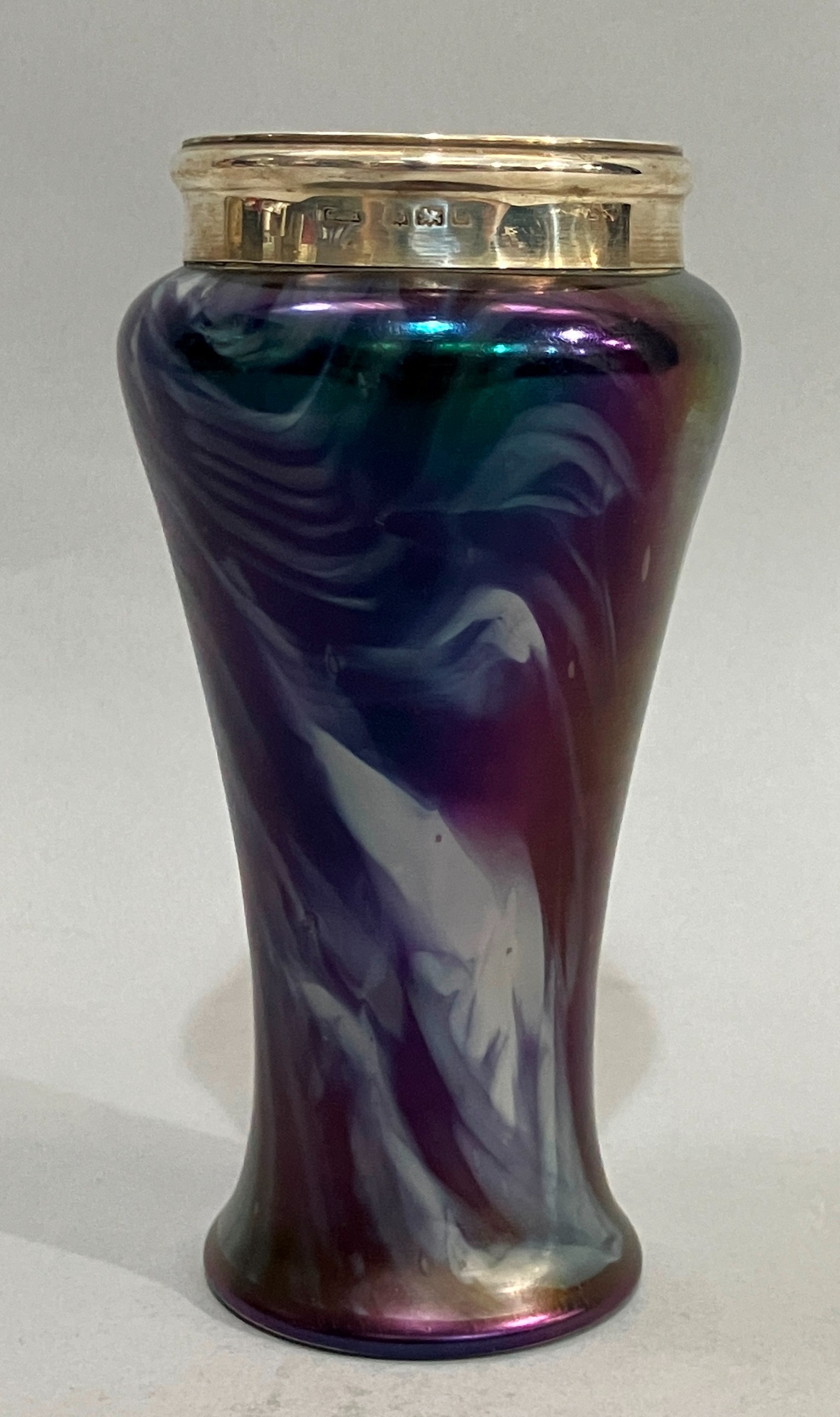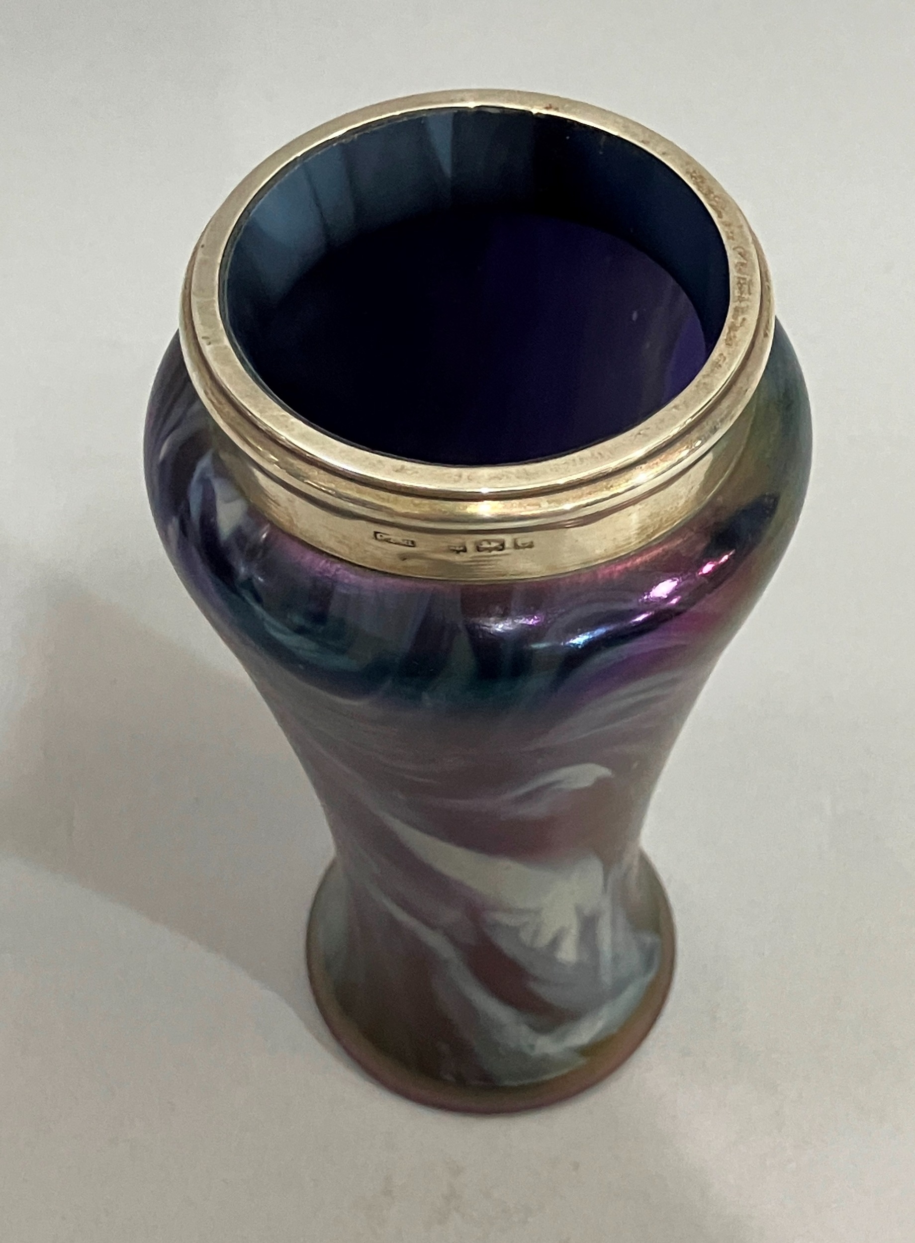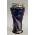 A silver mounted mauve marbled lustre glass vase, hallmarked Birmingham 1904, possibly for George Earnest Hawkins, 15.5cm high, makers mark warn