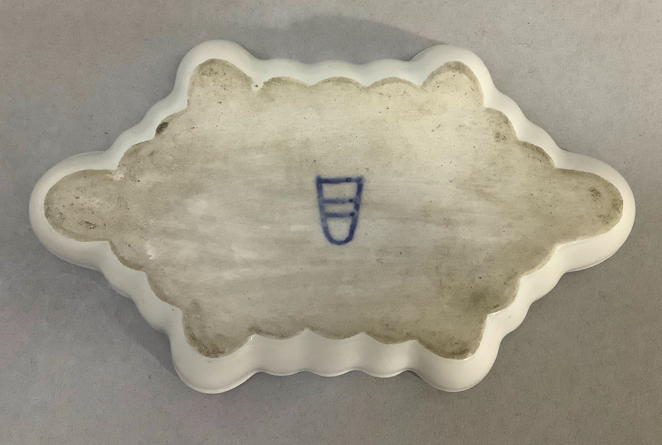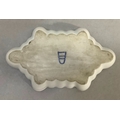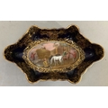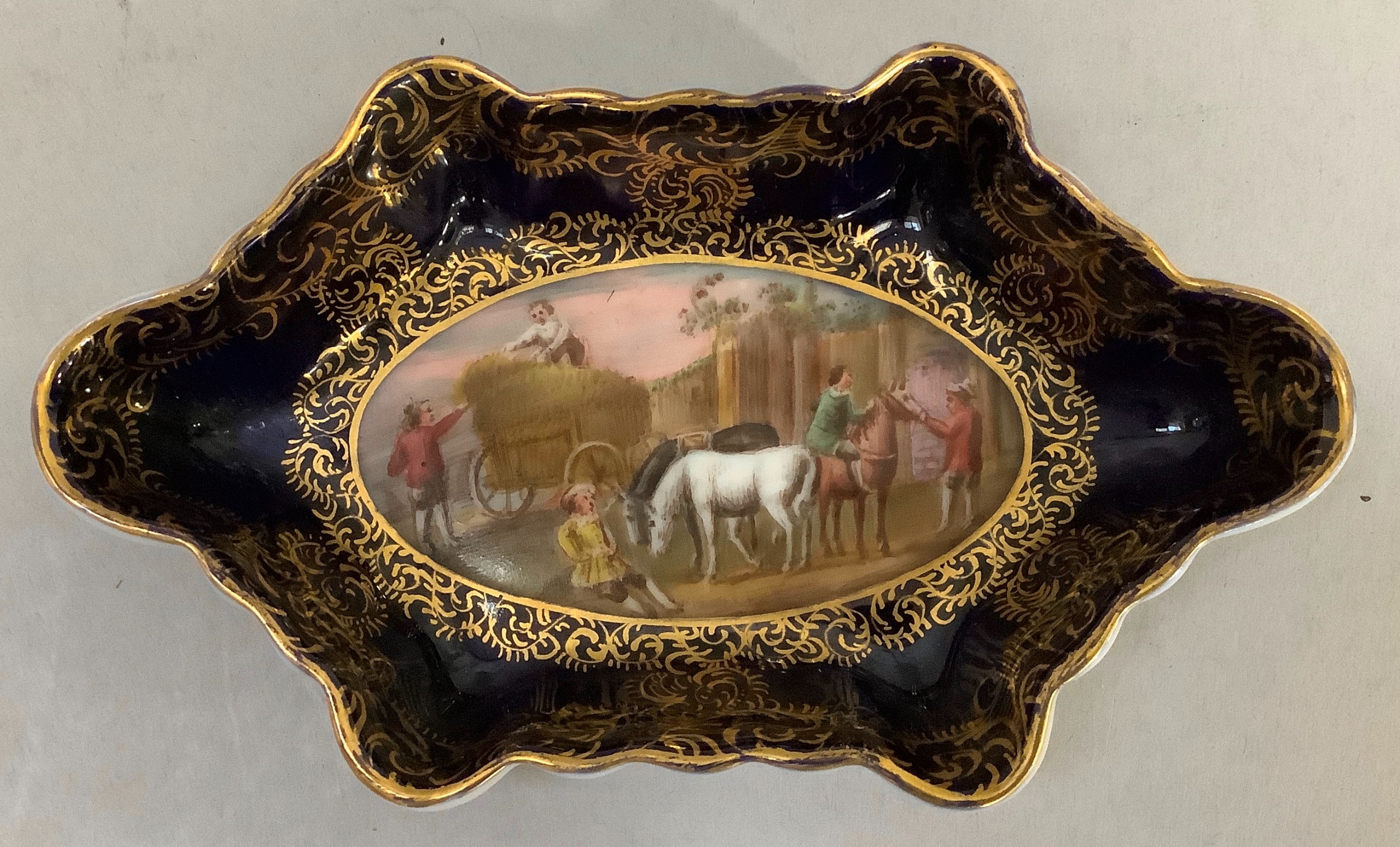 A Vienna porcelain dish painted to the centre with horsemen calling at a stable, within a dark blue and gilt border, under glaze blue mark to underside