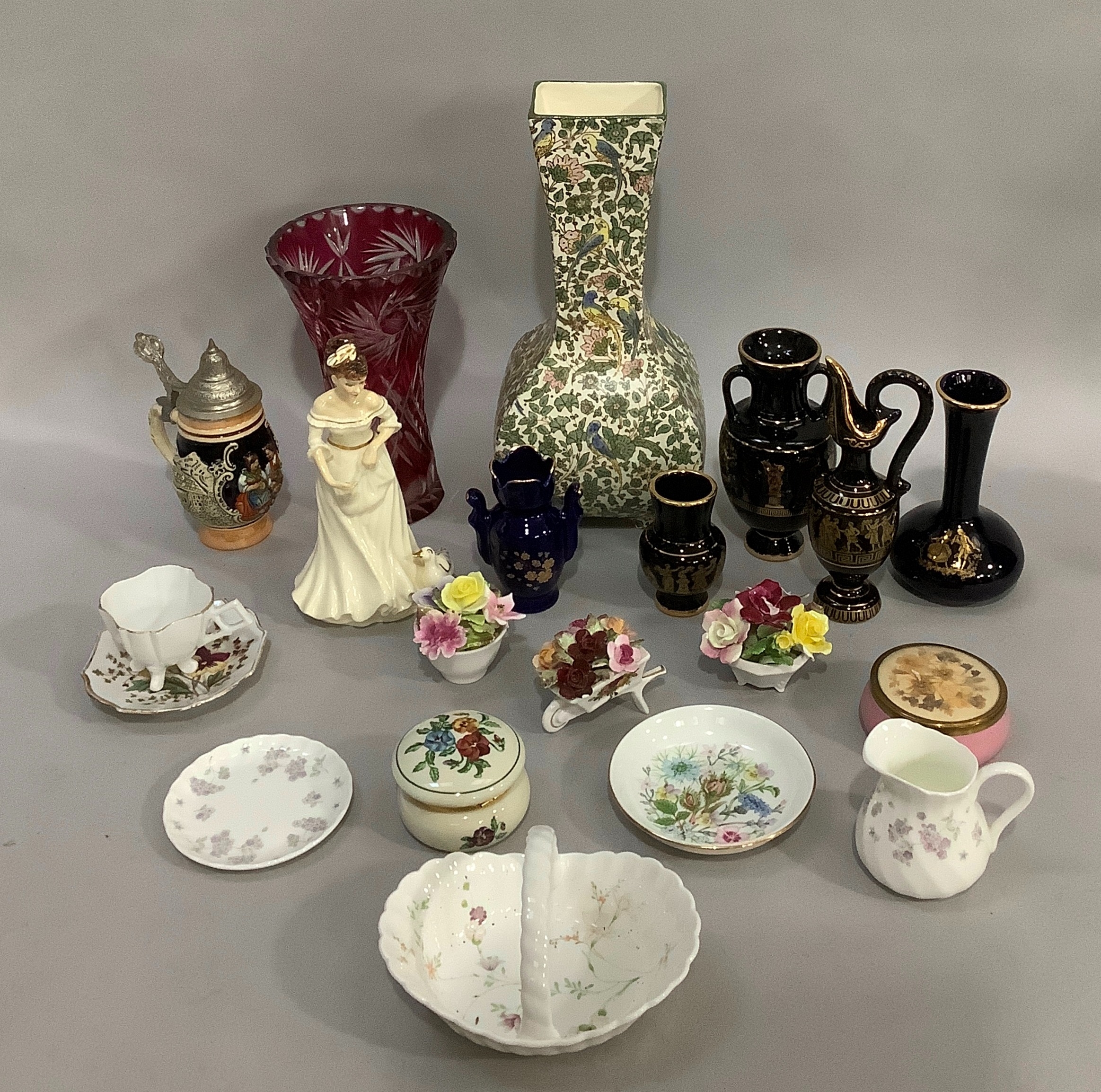 China flowers clusters, basket, jug, pin trays, cabinet cup and saucer, vases, figure by Royal Doulton, Doulton Persian vase and a ruby flash cut glass vase