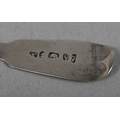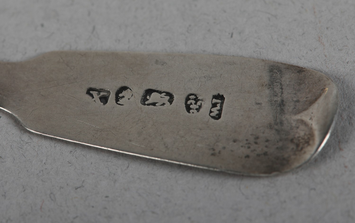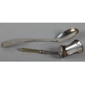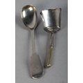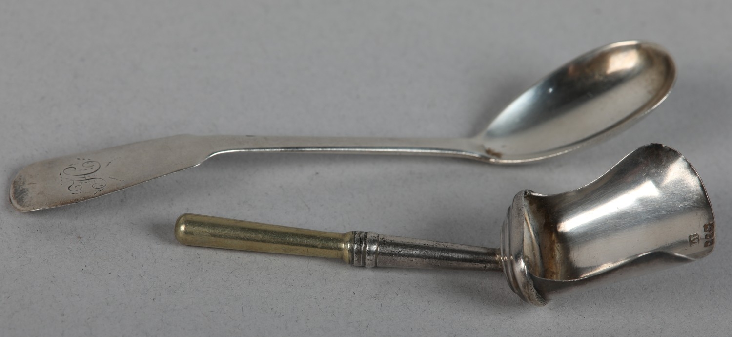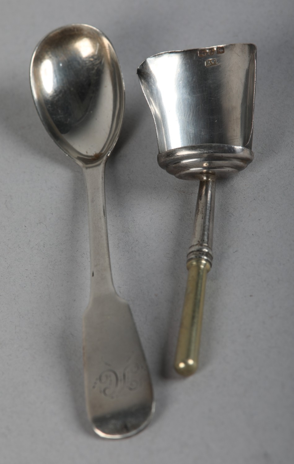 A GEORGE III SILVER MUSTARD SPOON, Newcastle 1812 for Thomas Watson together with a Victorian silver caddy spoon, Birmingham 1890 for Hilliard & Thomason in the form of a coal shovel