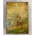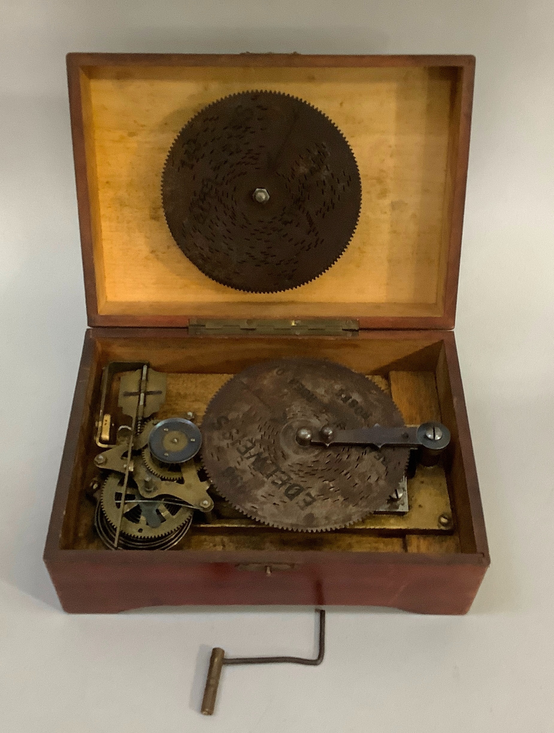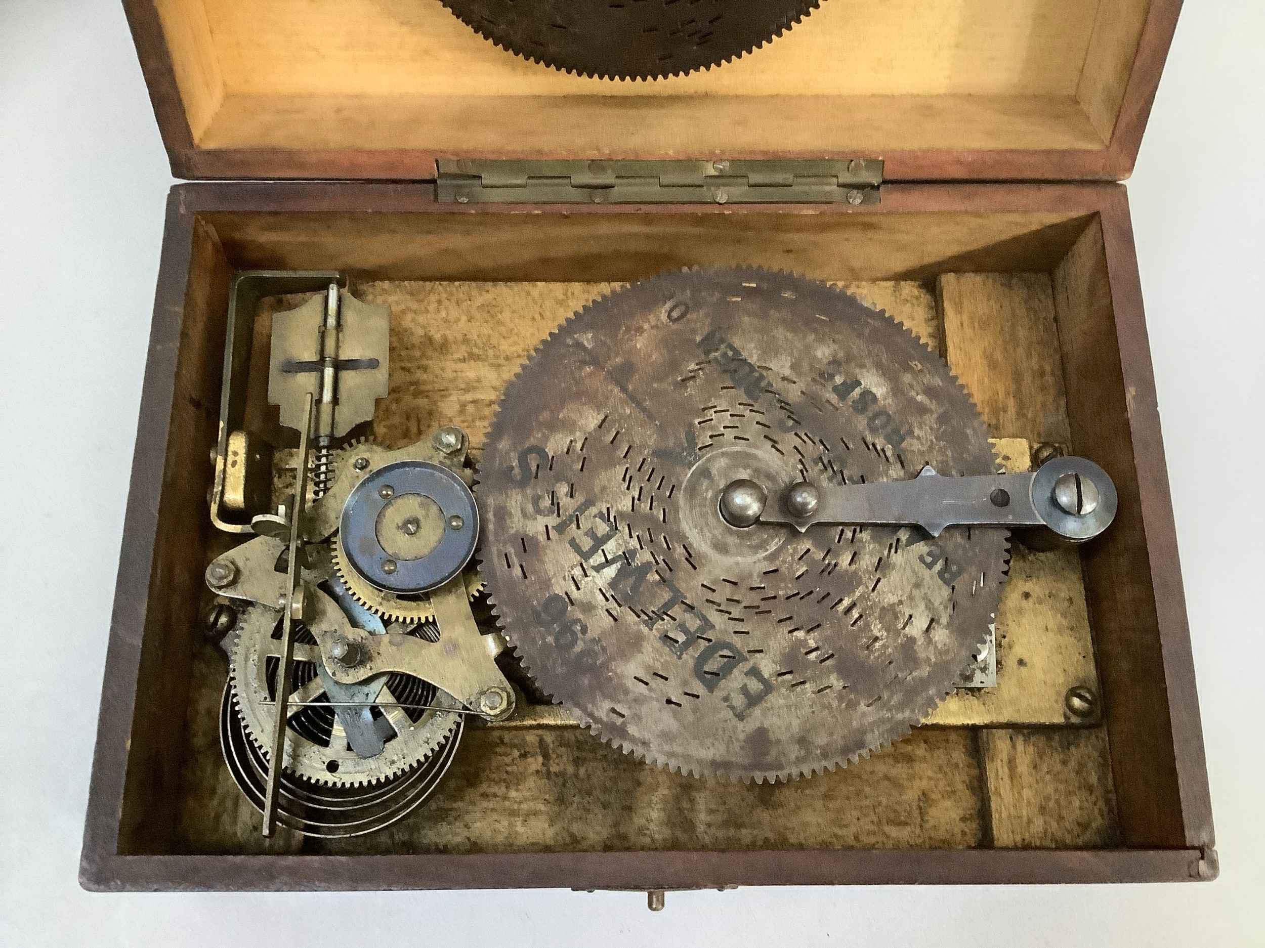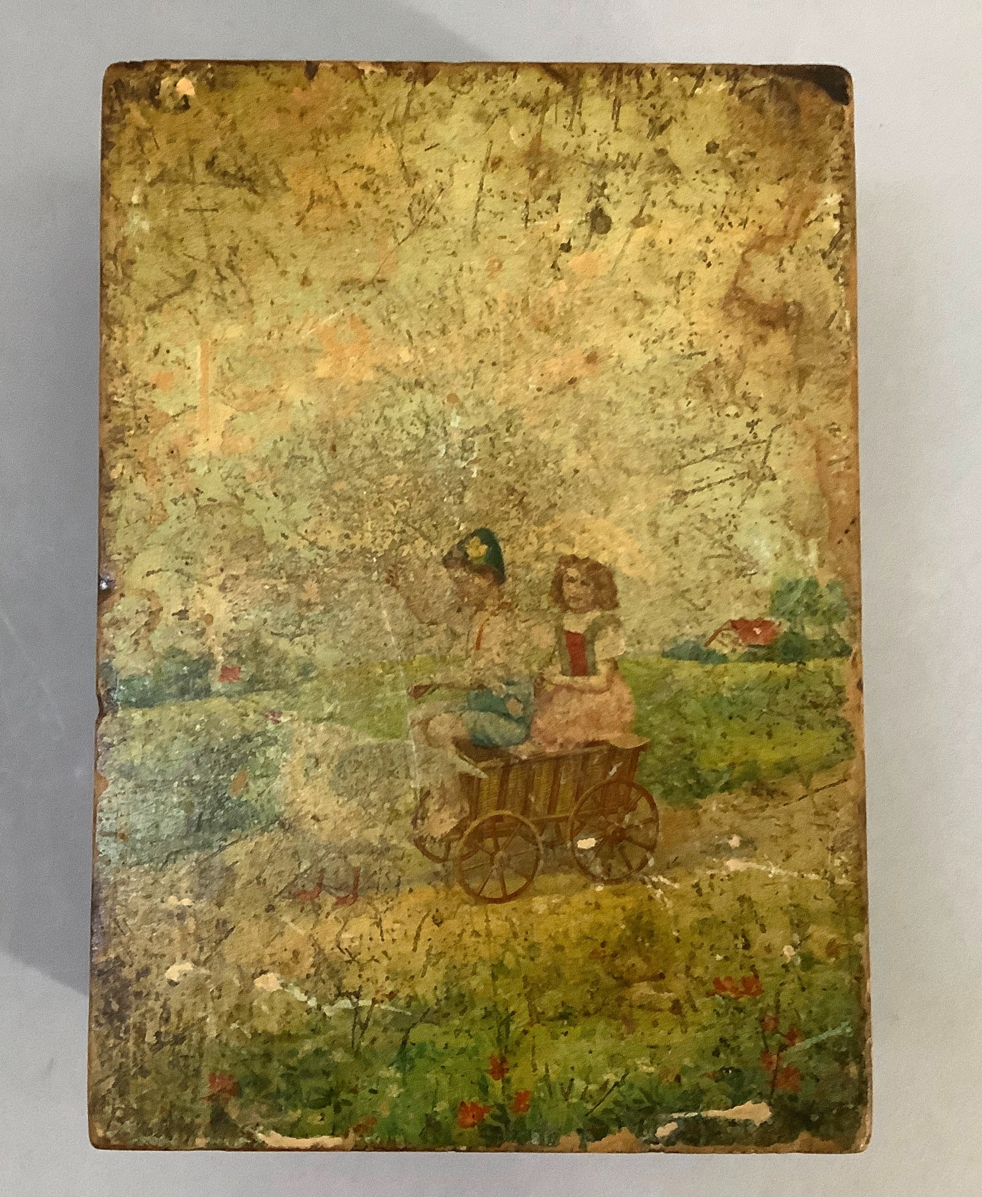 An early 20th century musical box, the cover with chromolithograph depicting children in a cart drawn by a goose, the movement playing on seven tin discs
