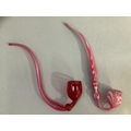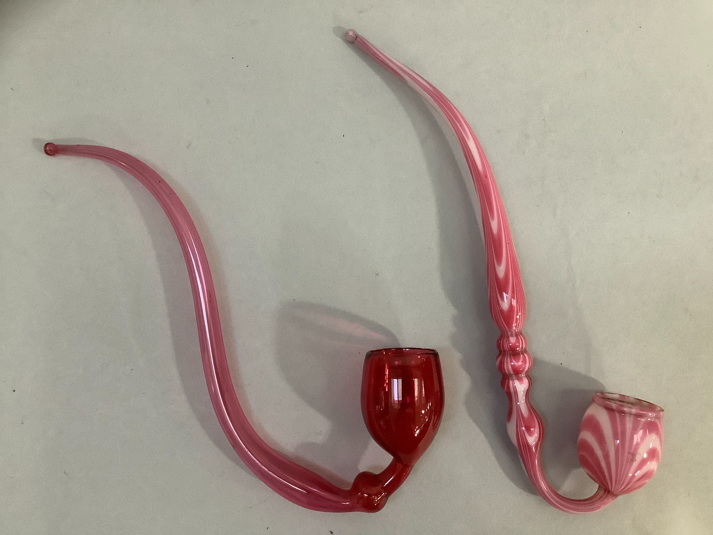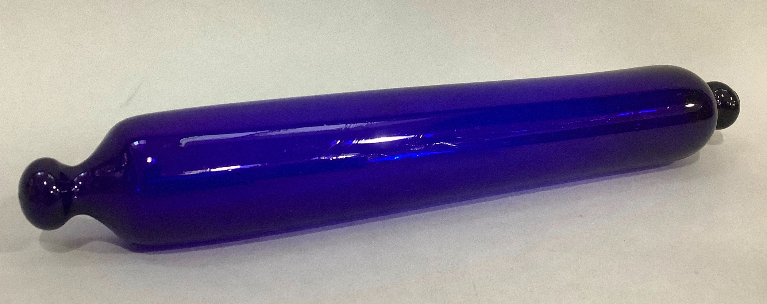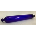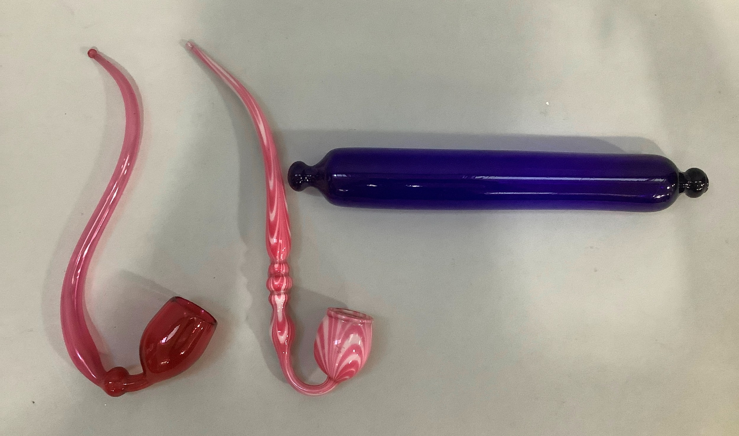 A cranberry glass ornamental pipe 30cm, a Nailsea type ornamental pipe 33cm , a Bristol blue type rolling pin, 34cm