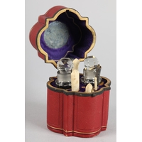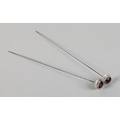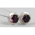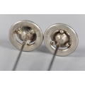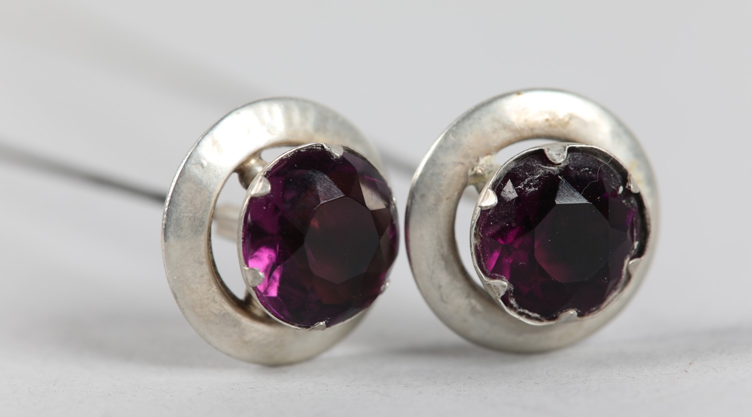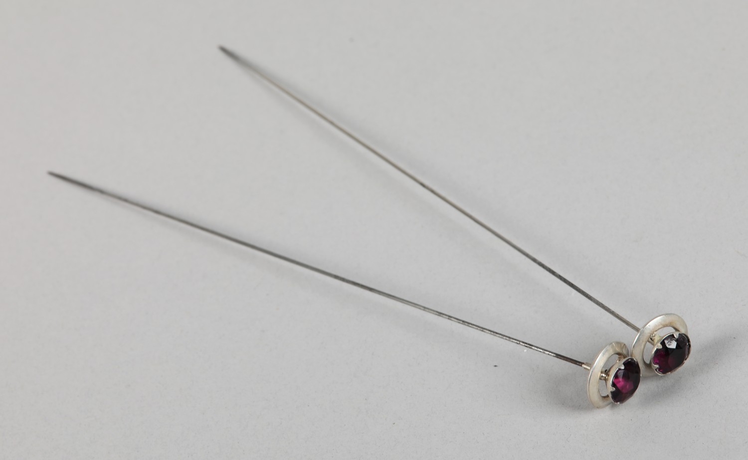 A PAIR OF EDWARD VII SILVER AND PASTE TOPPED HAT PINS, Birmingham 1910 for Pearce & Thompson, each circular faceted purple paste stone claw set and raised against a silver bezel, approximate diameter 21mm, approximate length 26cm