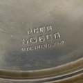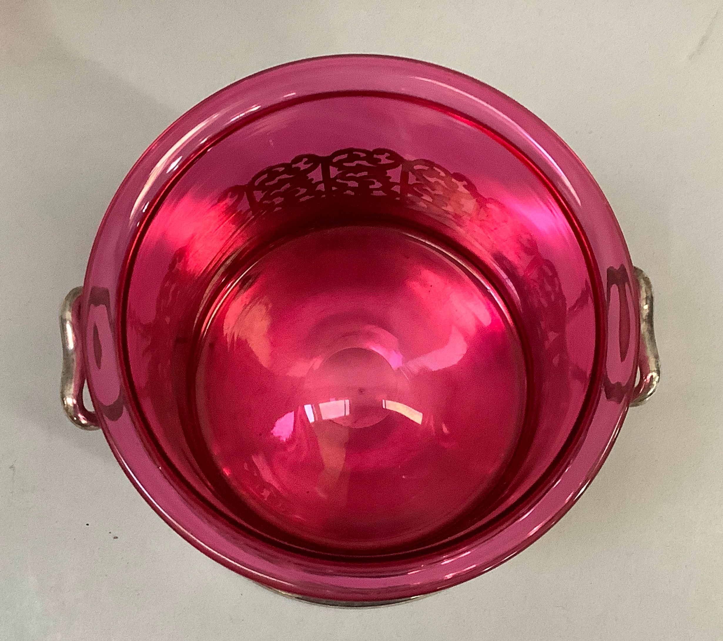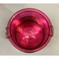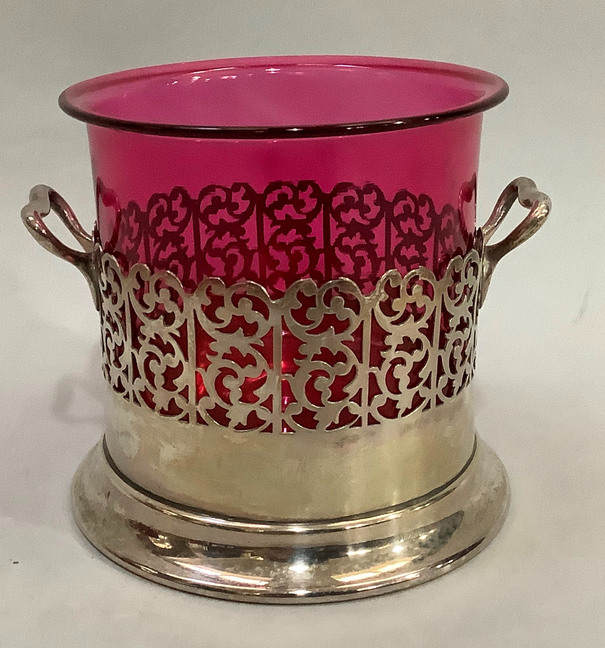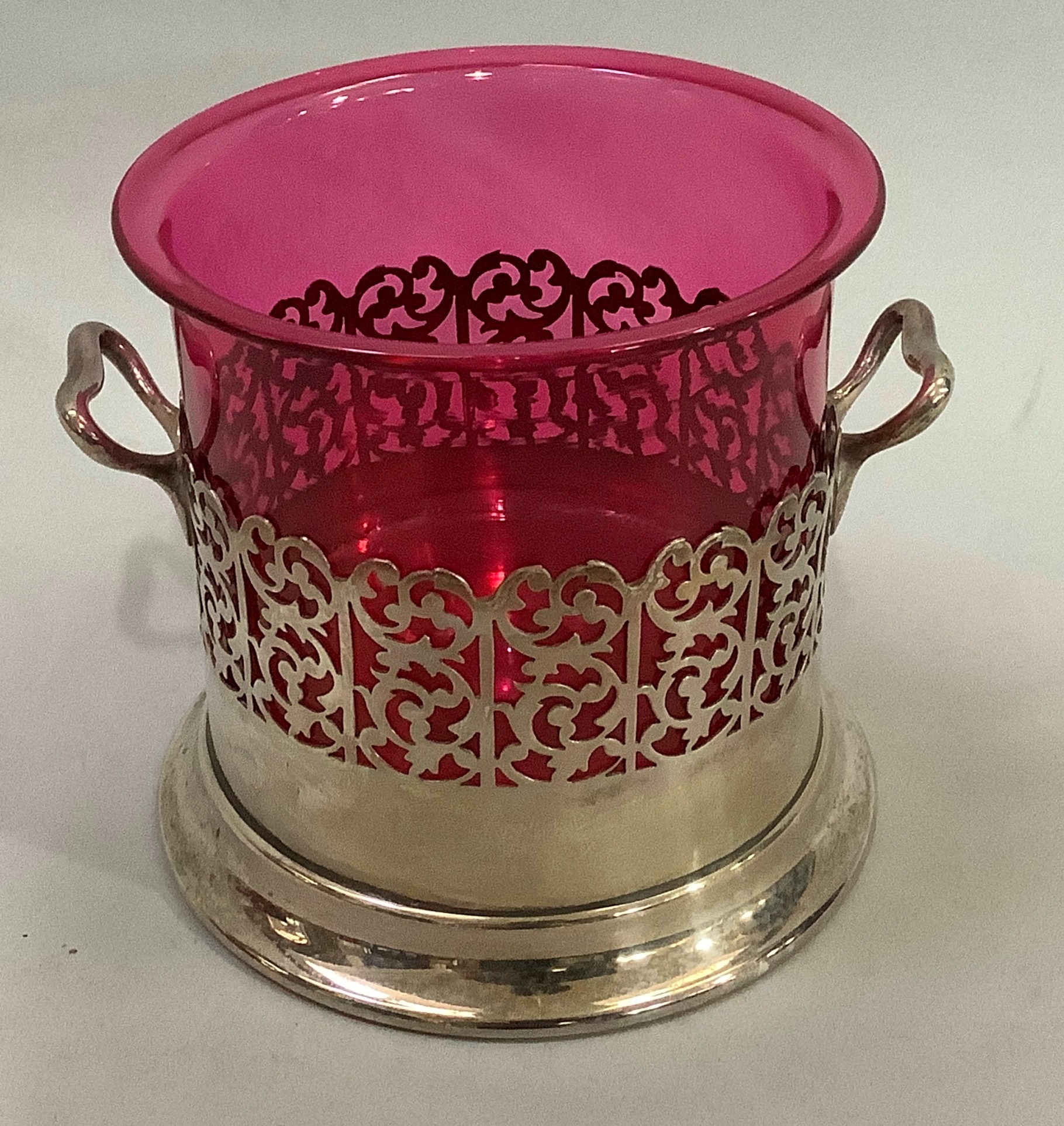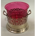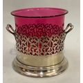 A silver plated two handled bottle holder with cranberry glass sleeve, 12.5cm high